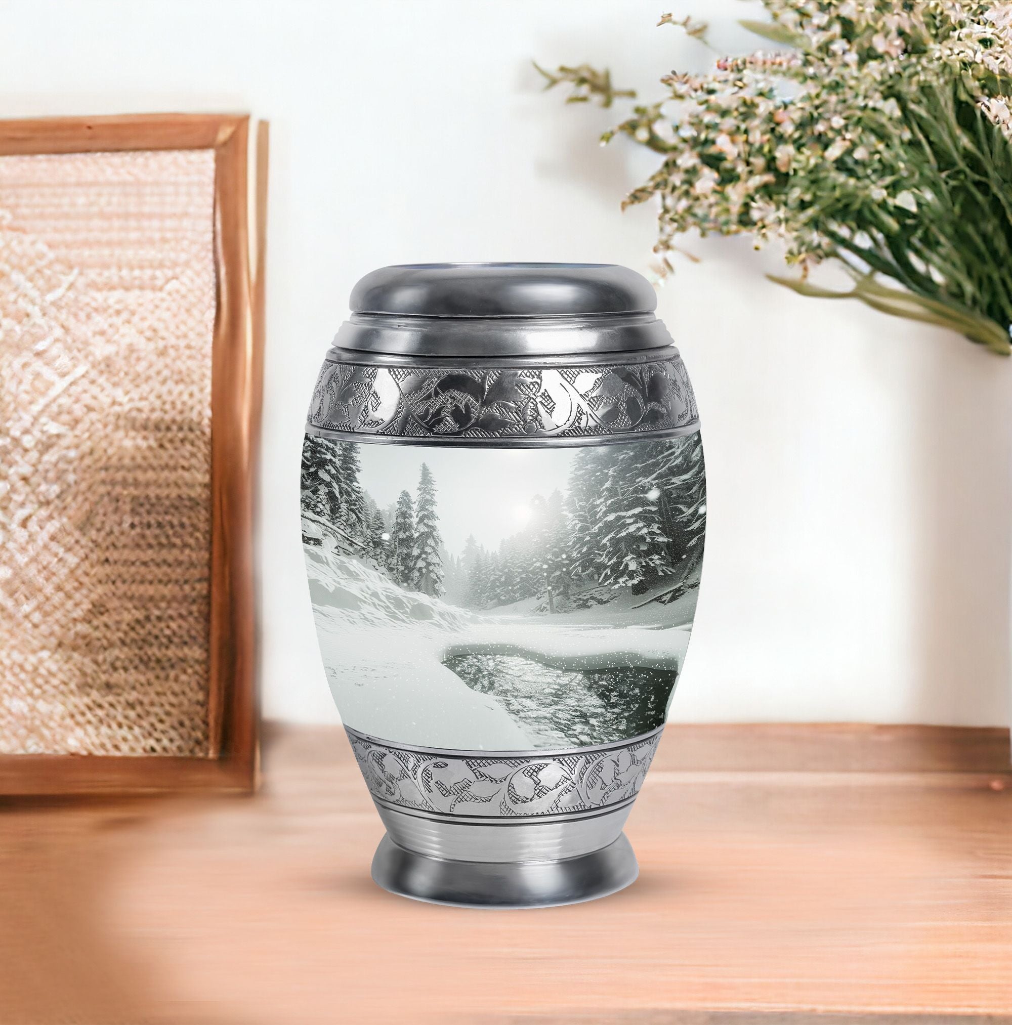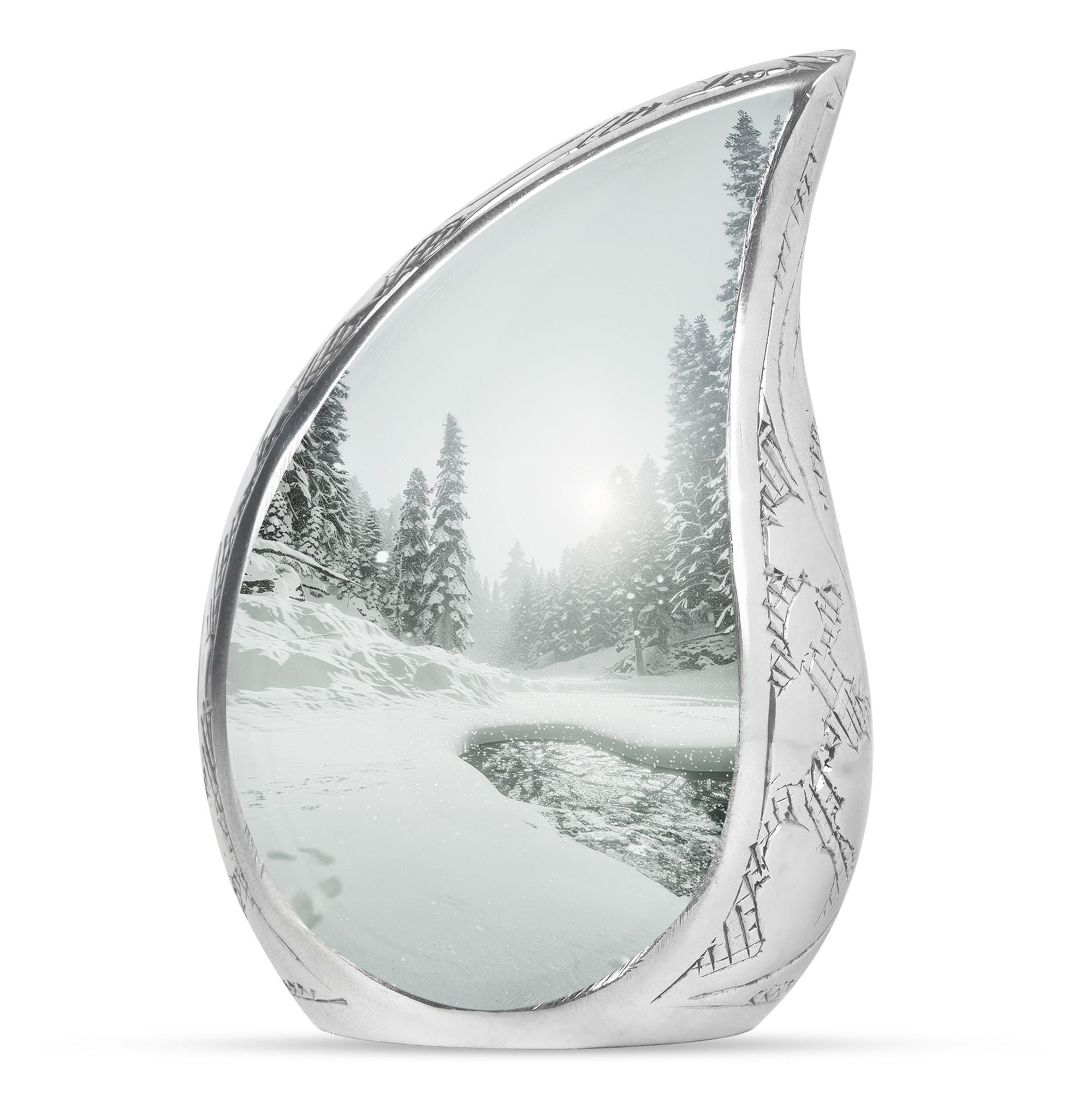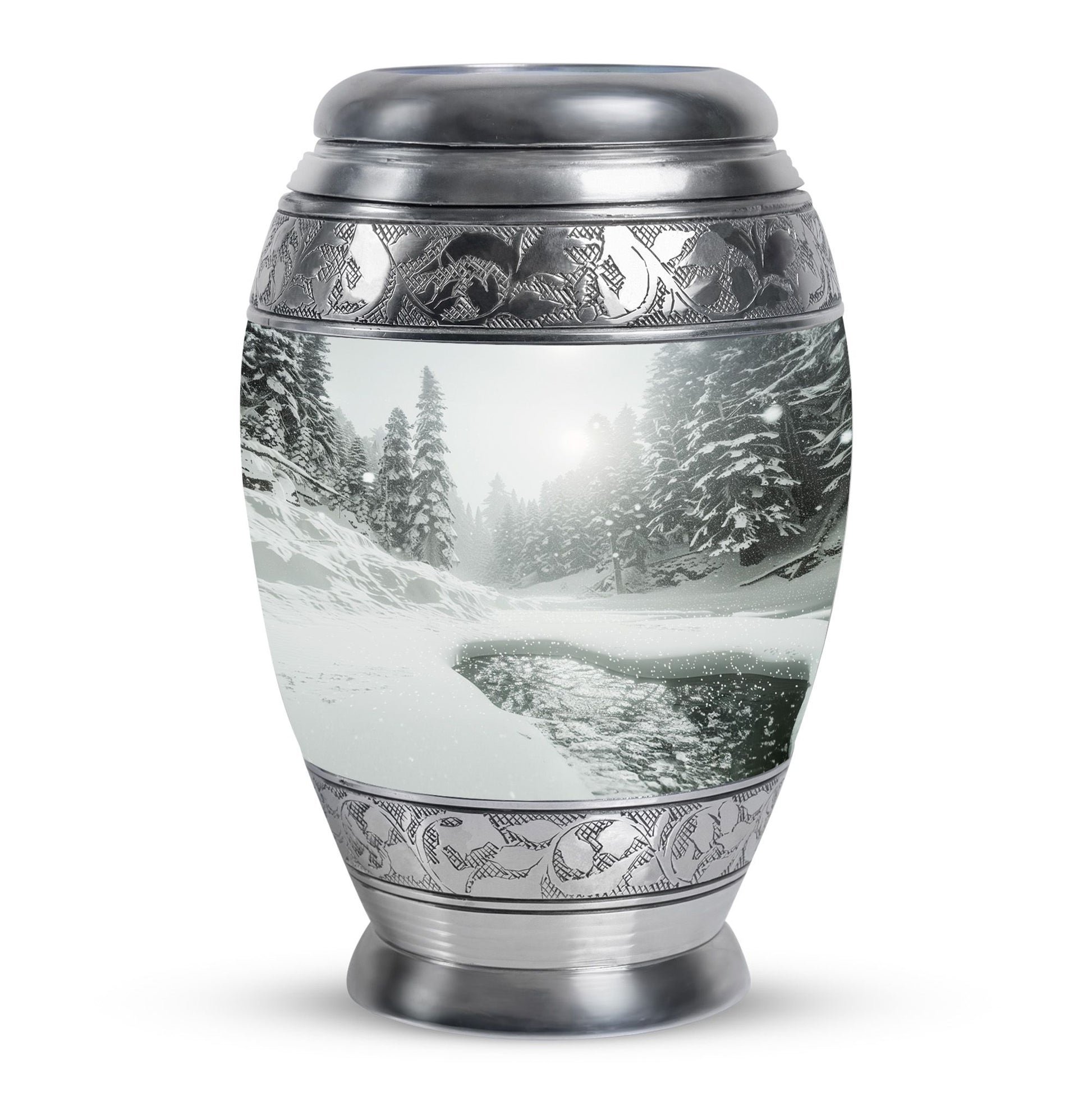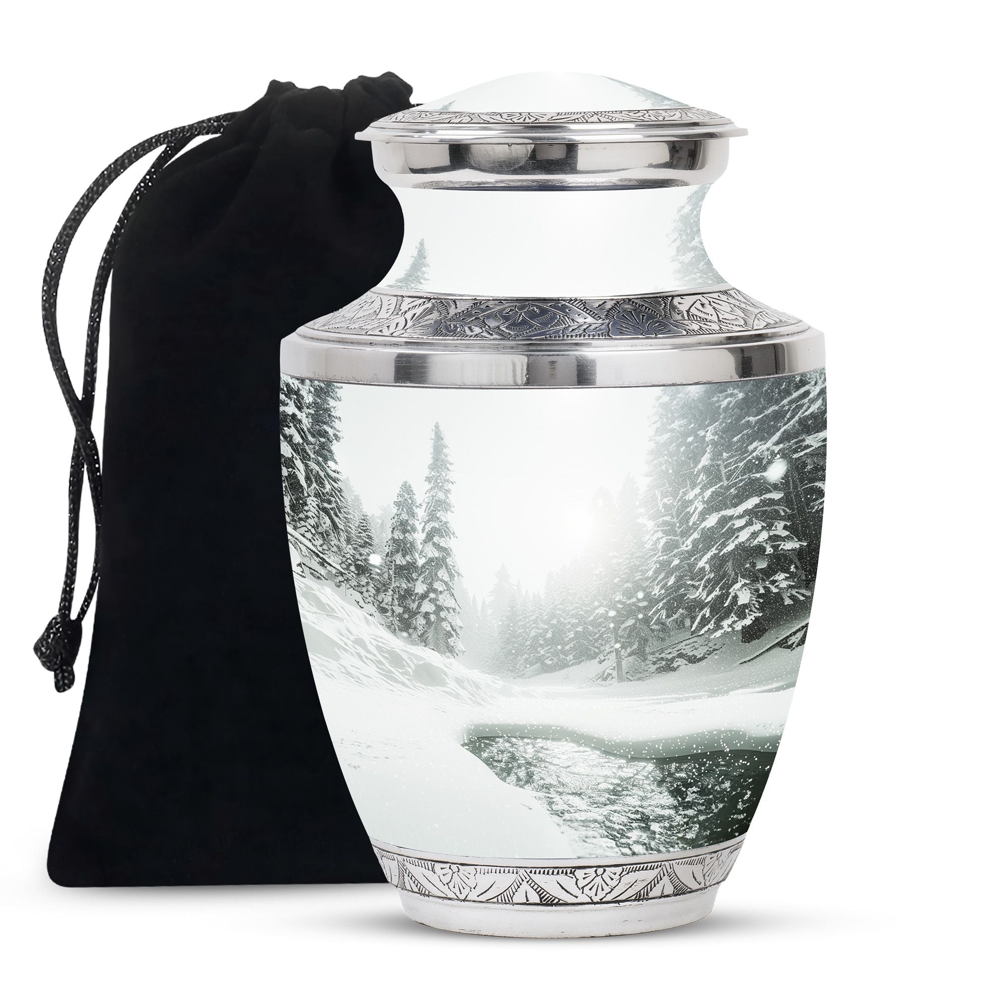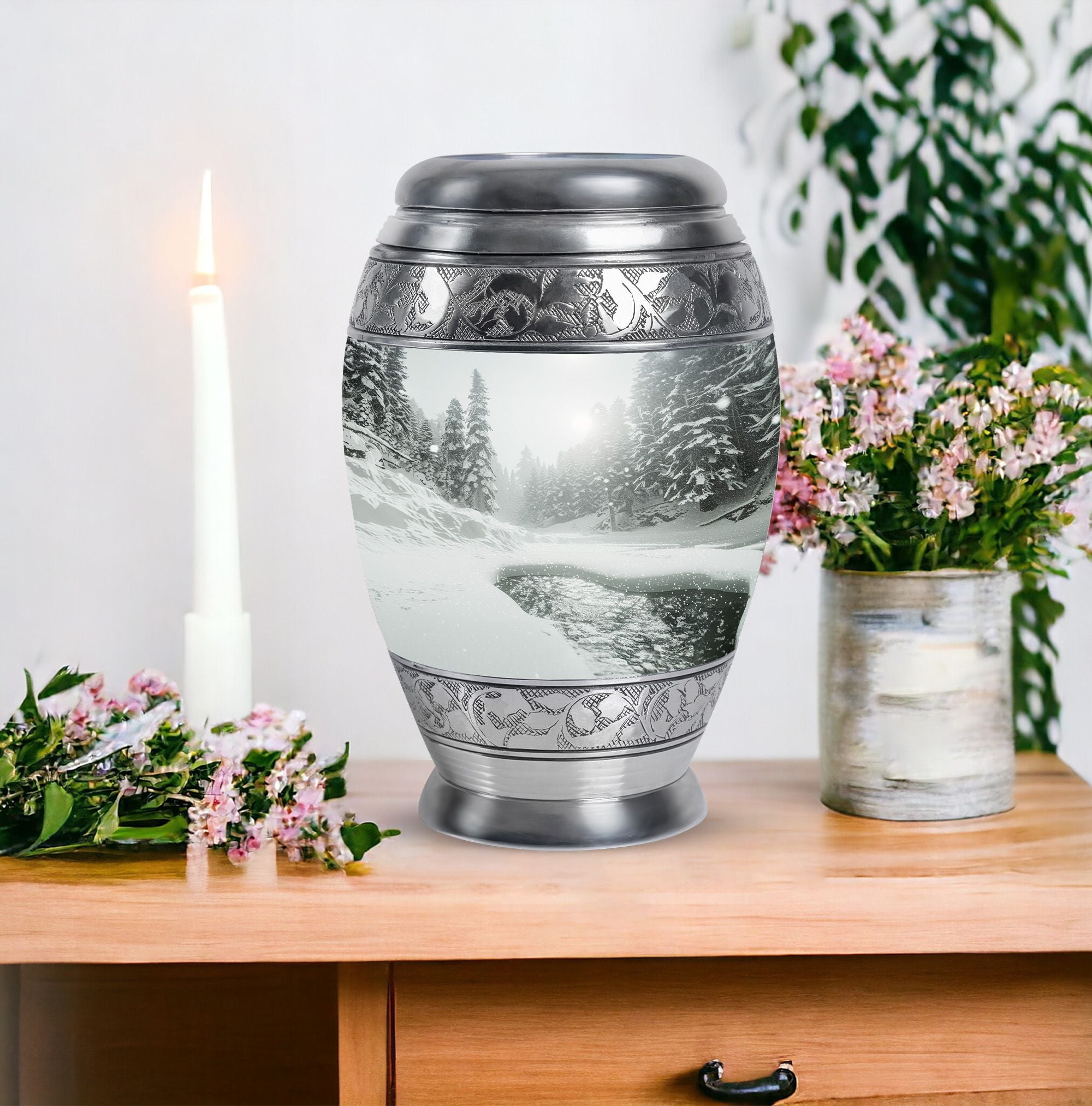 The **Snowflakes Urn for Ashes** represents the **delicate, fleeting beauty of life, honoring a loved one with a design as unique as their presence**.