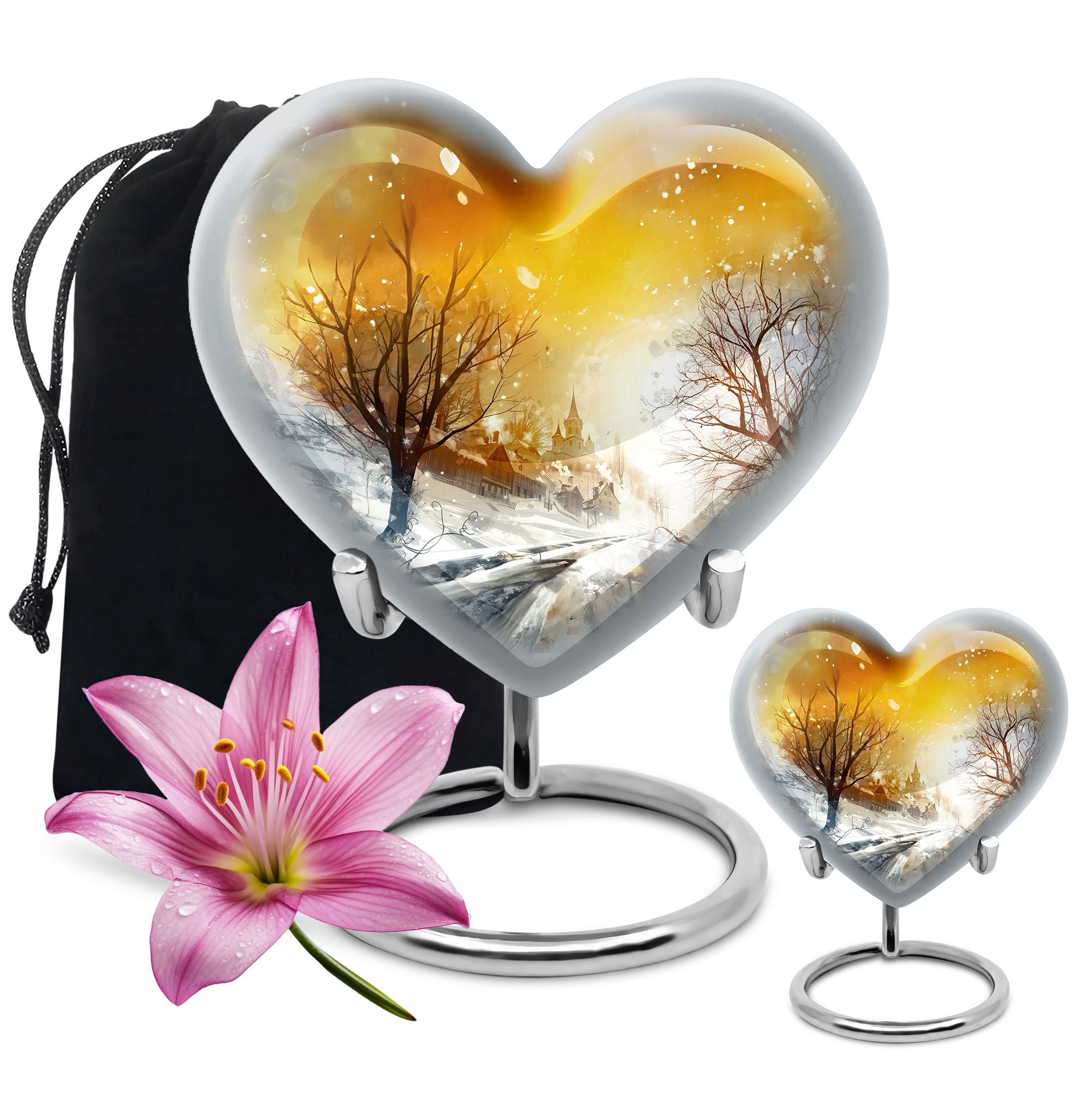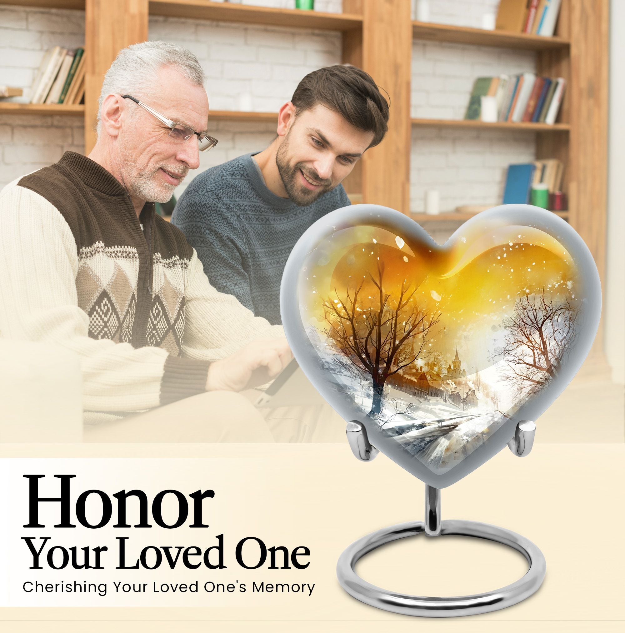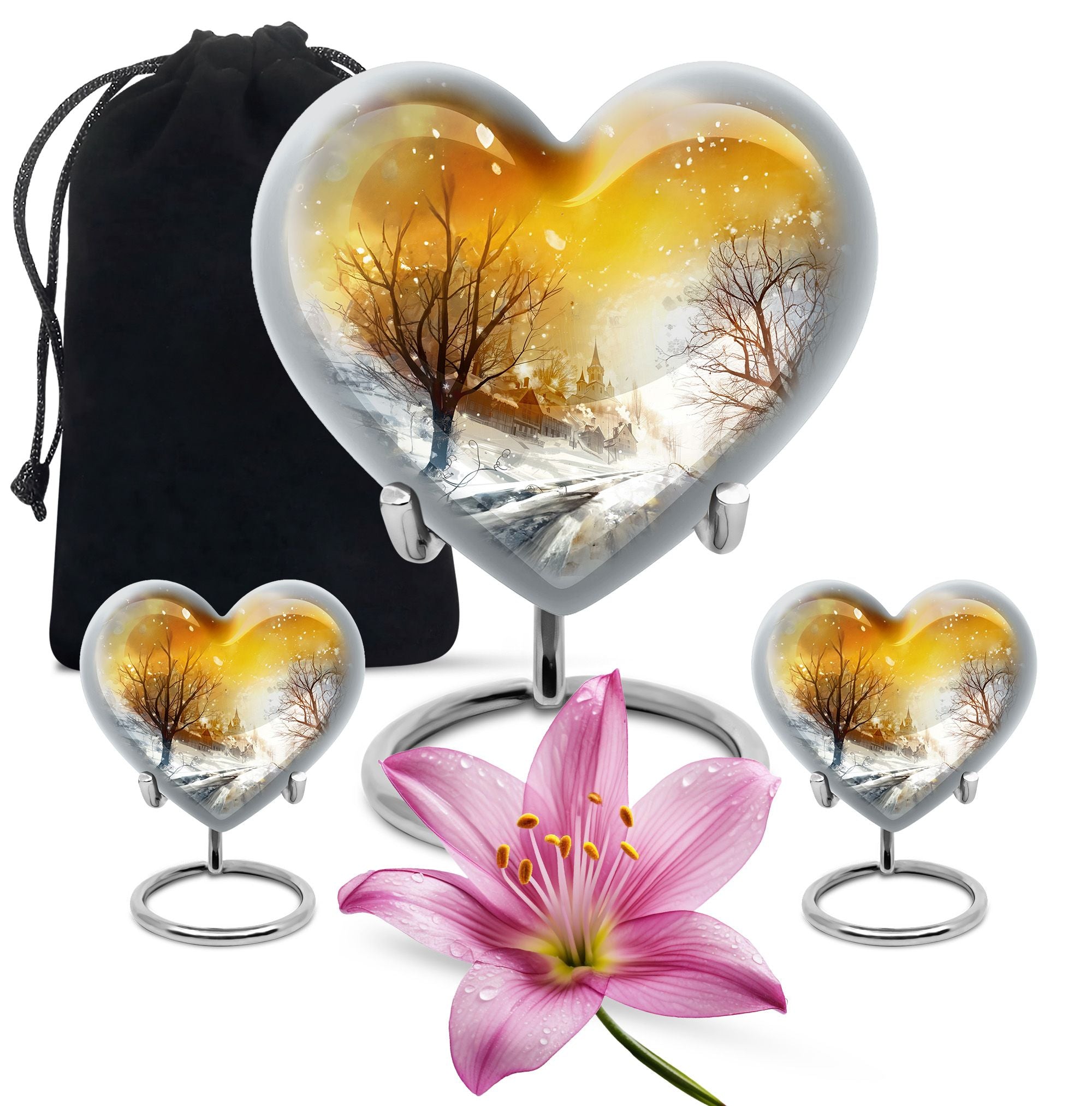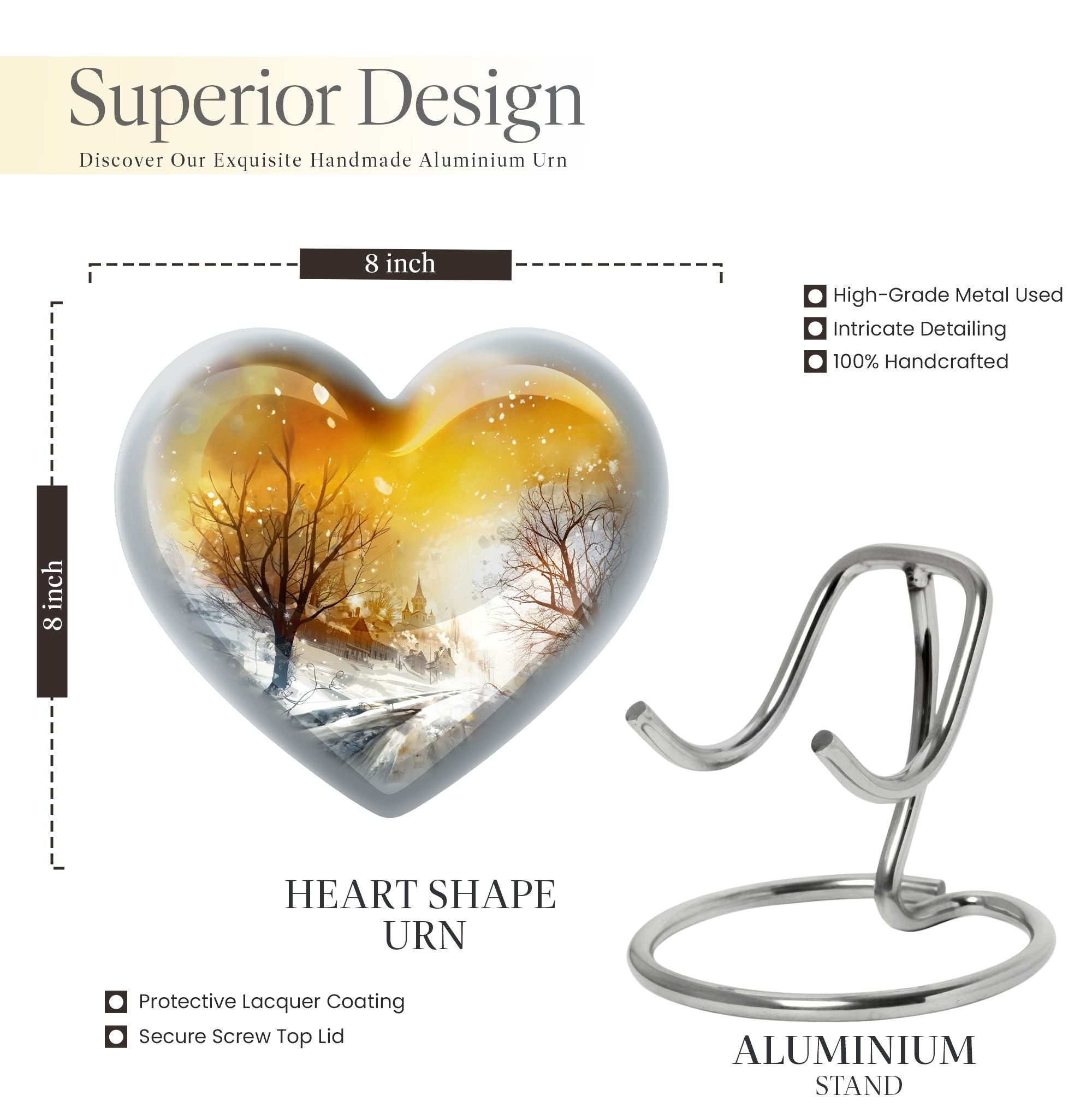Experience a tasteful way to memorialize your loved ones with this highly crafted 'Snowflakes Urn'. This 'Heart Urn' coincides majestically with the theme of snowflakes, offering an exemplar sight that stands at 10 inches tall. This large urn, carved from meticulous aluminium, holds a capacity of 200 cubic inches. Weighing 3.3 pounds, it assures durability while maintaining elegance. It exhibits a unique iridescent metal nuance, deviating from generic cremation urns or burial urns for men. This urn arrives with a velvet pouch facilitating the containment of ashes, providing a touch of sophistication and simplicity. Furthermore, this solemn accessory also allows personalization, where names can be beautifully engraved to make it even more special. Unveil a new dimension to ceremonials with this large, awe-striking urn. It isn't just a box for containment, but a touching tribute to your loved ones.