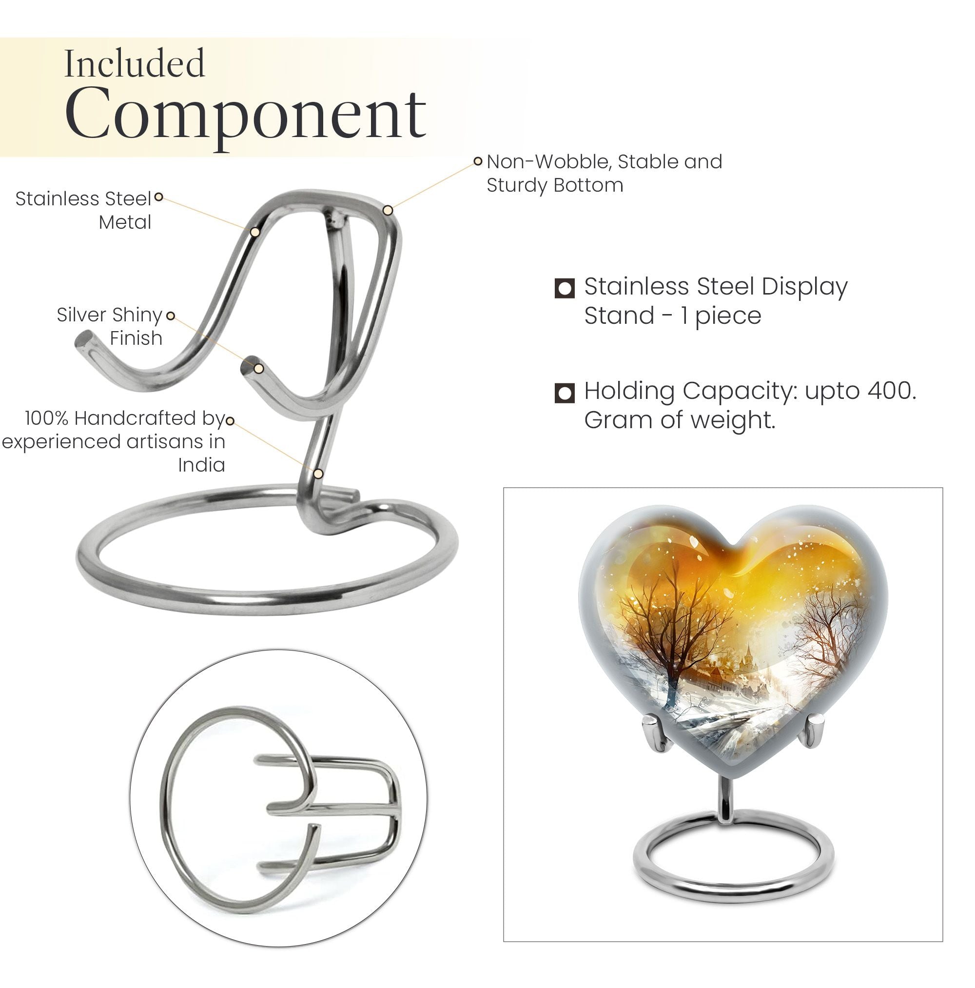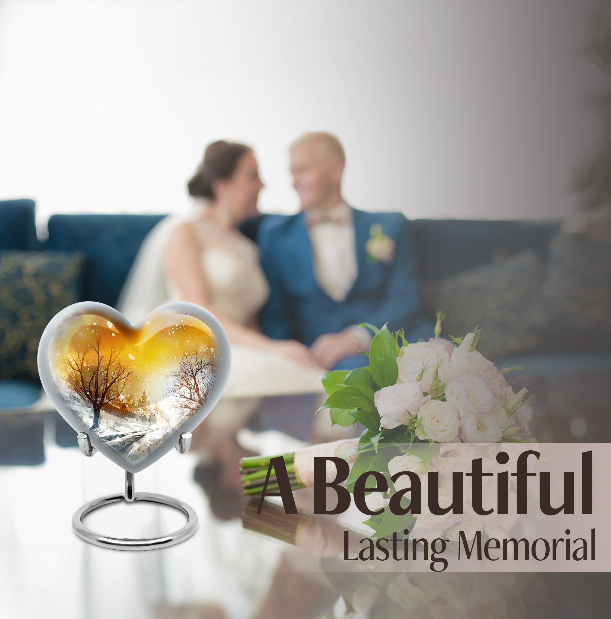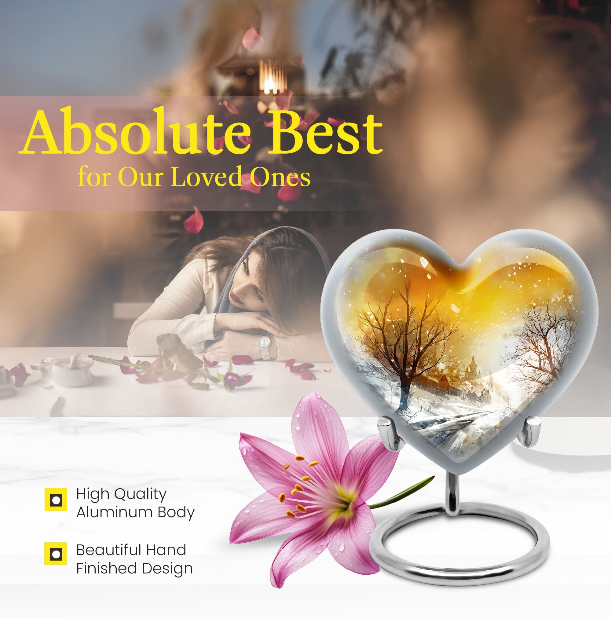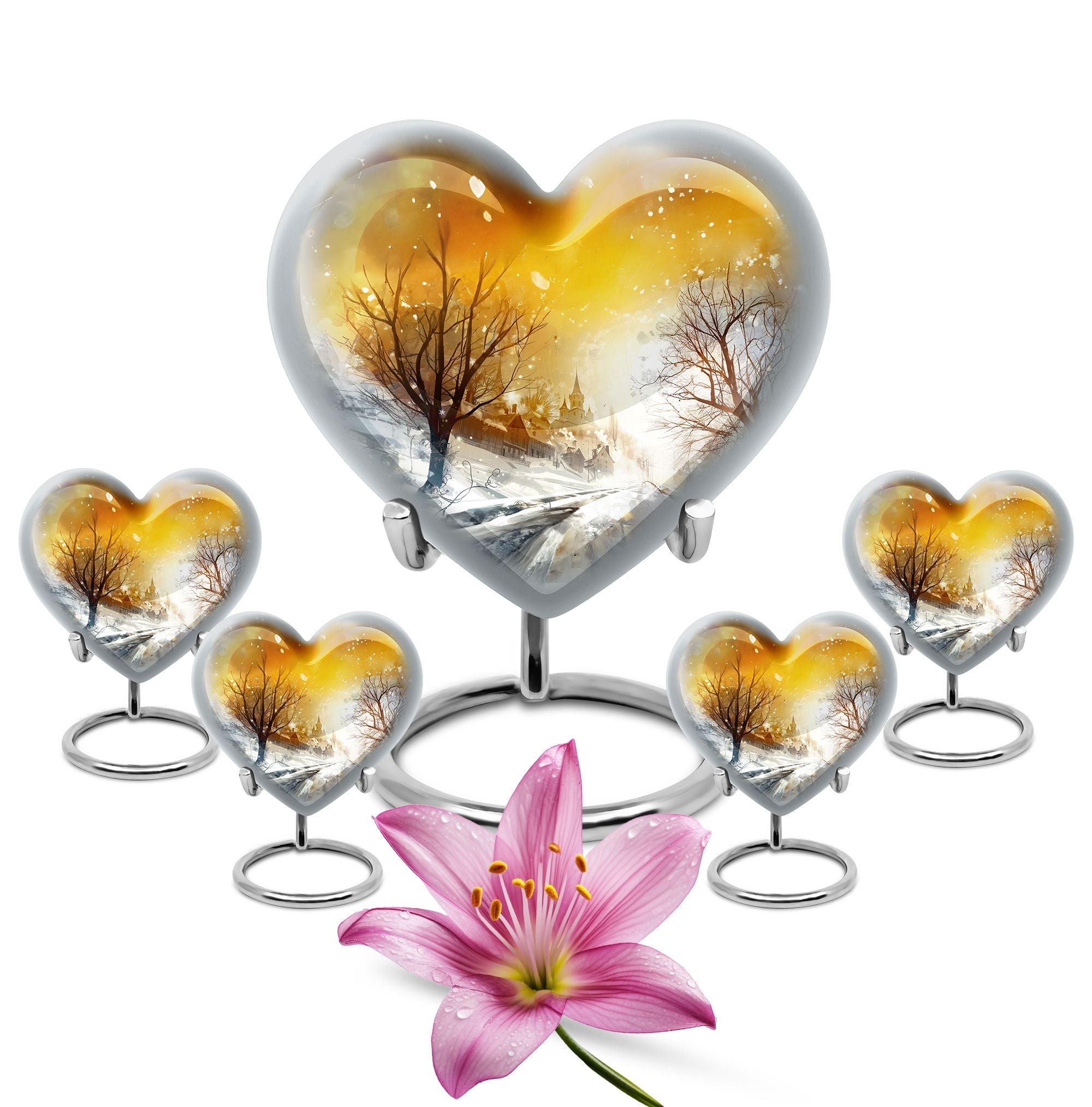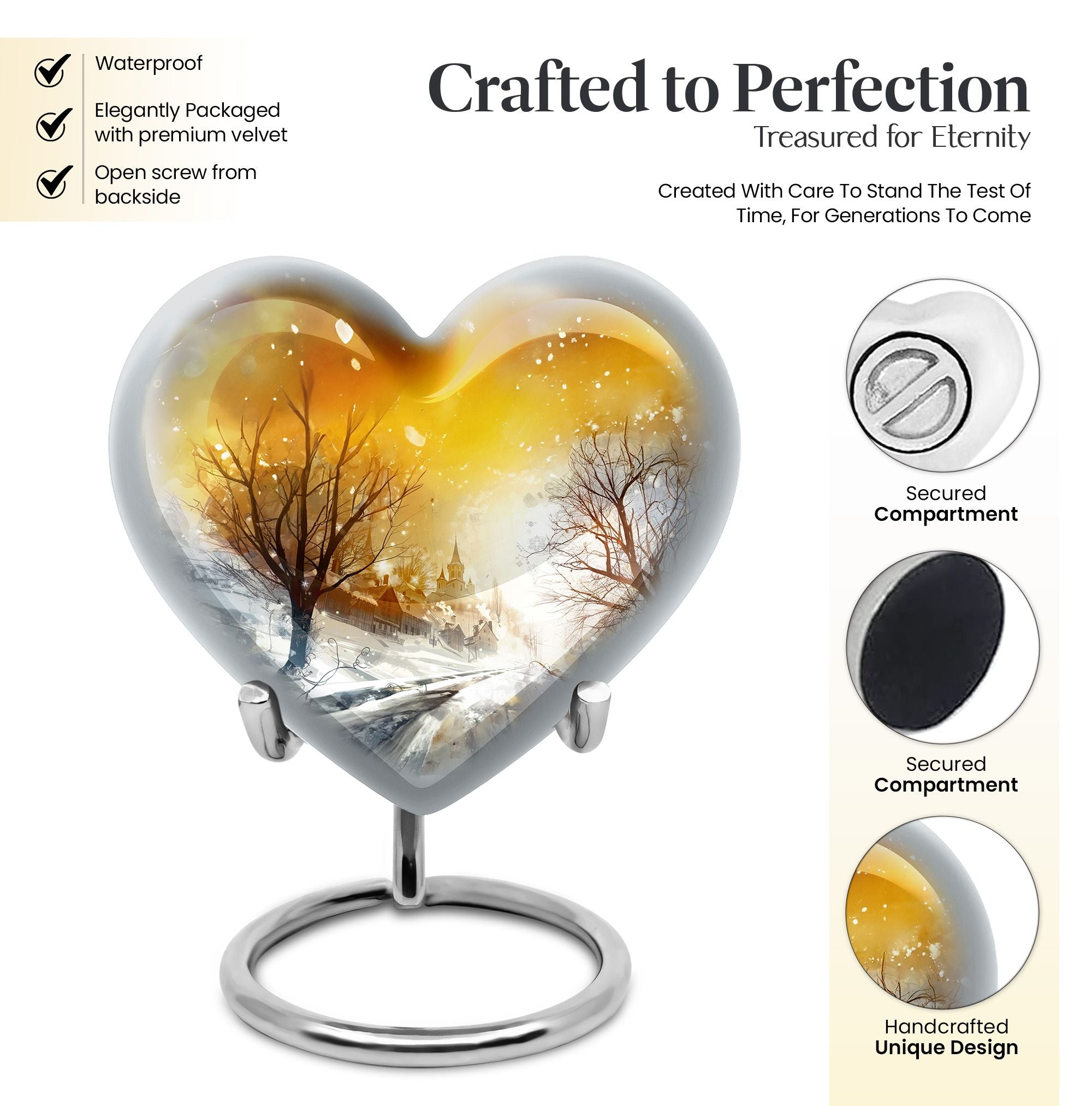 Experience a tasteful way to memorialize your loved ones with this highly crafted 'Snowflakes Urn'. This 'Heart Urn' coincides majestically with the theme of snowflakes, offering an exemplar sight that stands at 10 inches tall. This large urn, carved from meticulous aluminium, holds a capacity of 200 cubic inches. Weighing 3.3 pounds, it assures durability while maintaining elegance. It exhibits a unique iridescent metal nuance, deviating from generic cremation urns or burial urns for men. This urn arrives with a velvet pouch facilitating the containment of ashes, providing a touch of sophistication and simplicity. Furthermore, this solemn accessory also allows personalization, where names can be beautifully engraved to make it even more special. Unveil a new dimension to ceremonials with this large, awe-striking urn. It isn't just a box for containment, but a touching tribute to your loved ones.