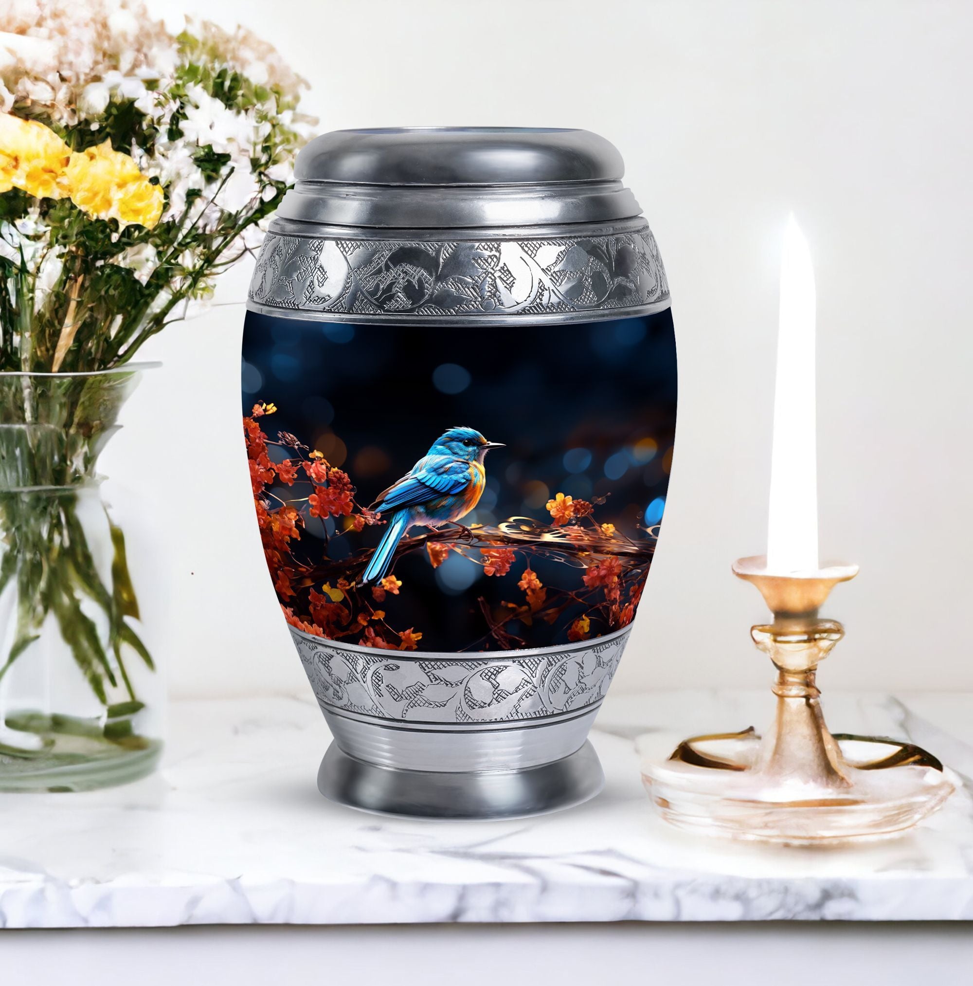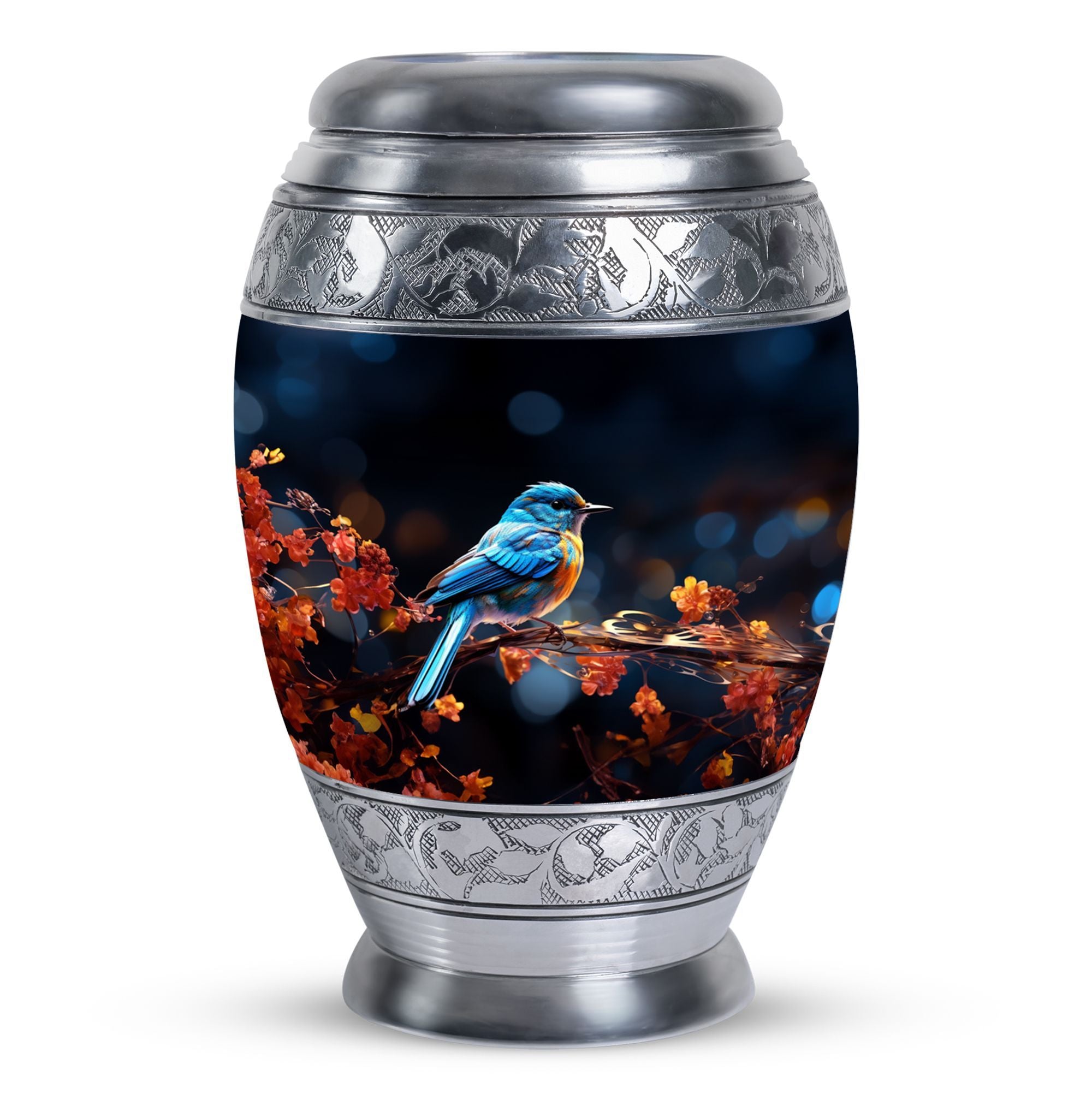 Endow your loved ones with a prestigious resting place using our Blue Sparrow Large Urns for Human Ashes. Ideal for both adults and seniors, these memorial gifts offer a unique means of expressing your condolences while cherishing those who mean a lot to us. At 10 inches tall and a weight of 3.3 pounds, this 3-inch cremation urn comes in a classic urn design and is inherently magnificent. Crafted with utmost precision from premium-quality Aluminium, the urn's capacity is 200 cubic inches, demonstrating its large size. On receiving your order, you will find your urn encased in a delicate velvet pouch to safely contain the ashes. For a hands-on touch, take advantage of our customization feature to personalize the urn with engraved names. This product is an exceptional choice if you're seeking Unique Urns for Dad or Decorative Urns for Human Ashes. With its subtle design and unmatched quality, this organically exclusive piece serves as an excellent Urn for Ashes for Mom. Remember your loved ones in a special way with our product that combines love, respect, and dignity.