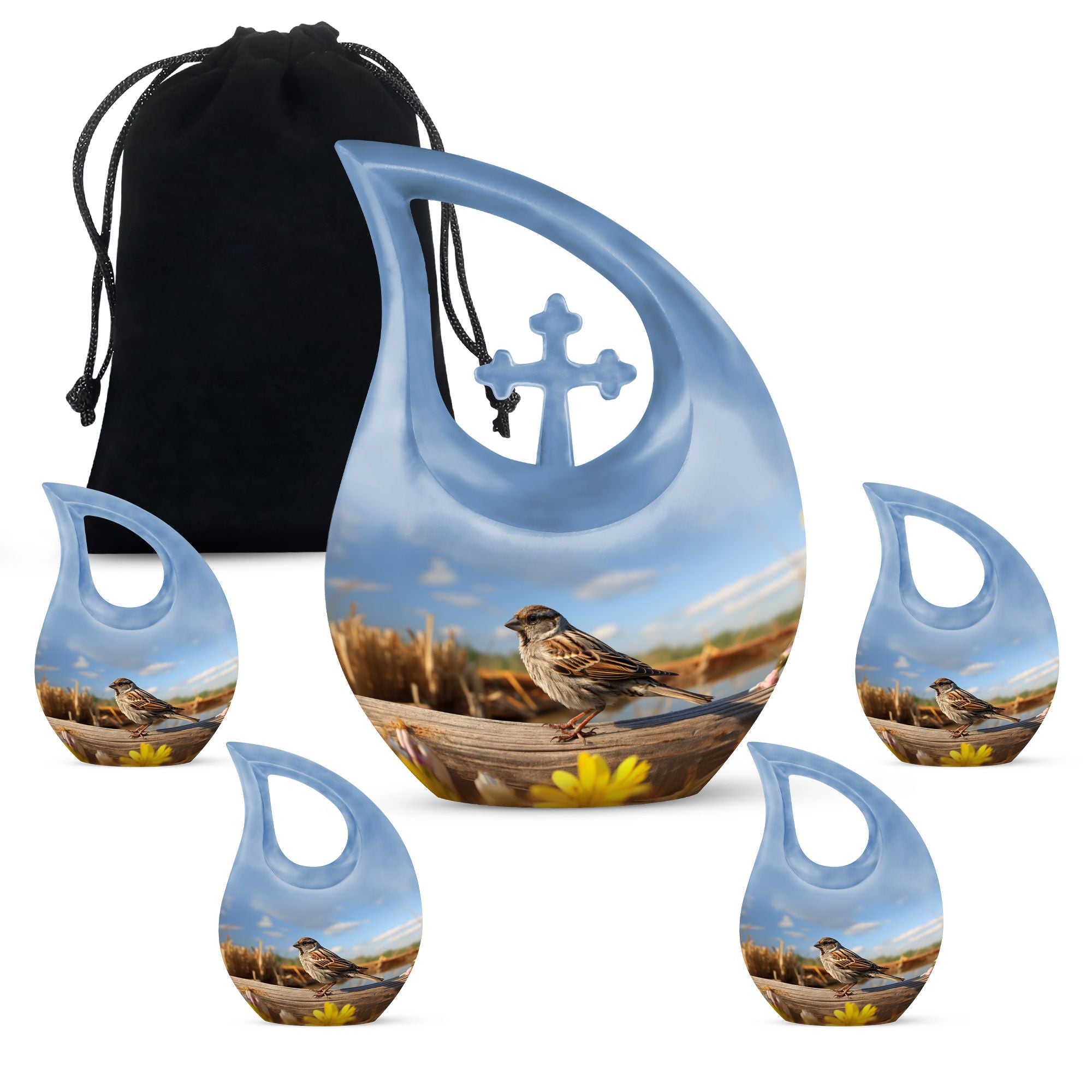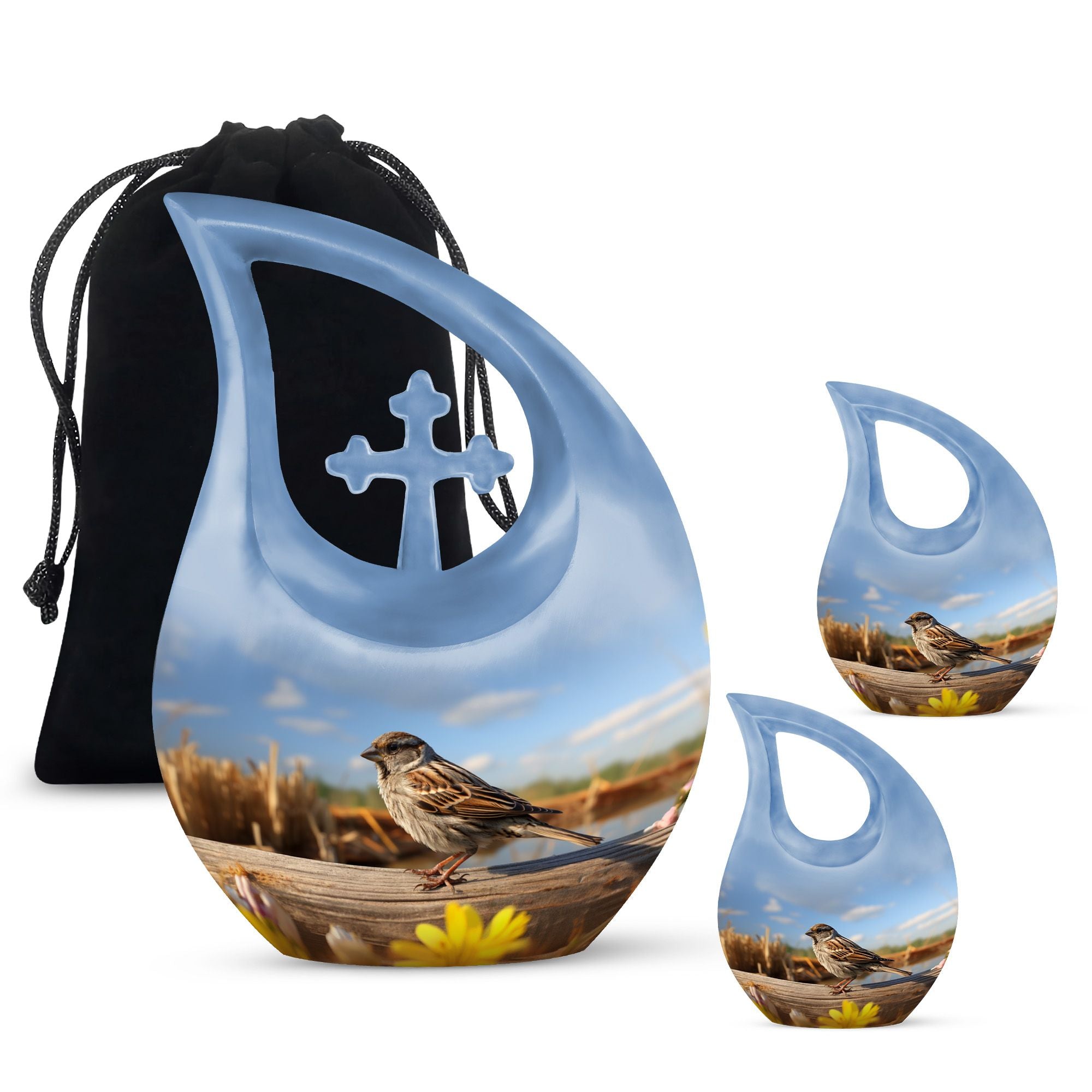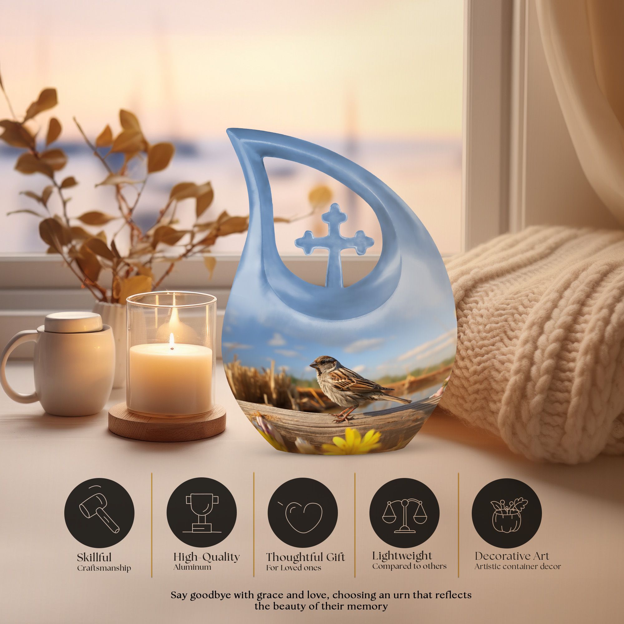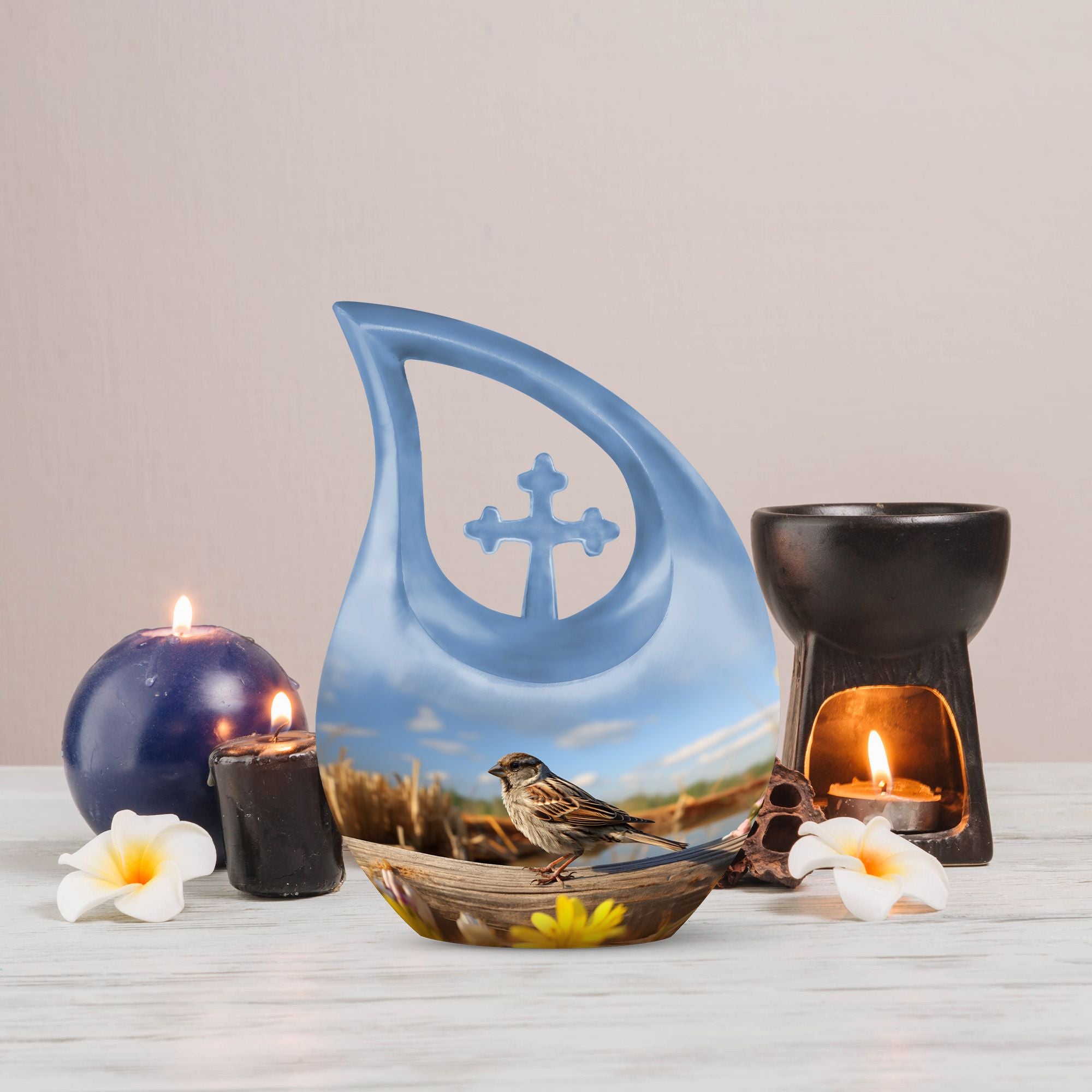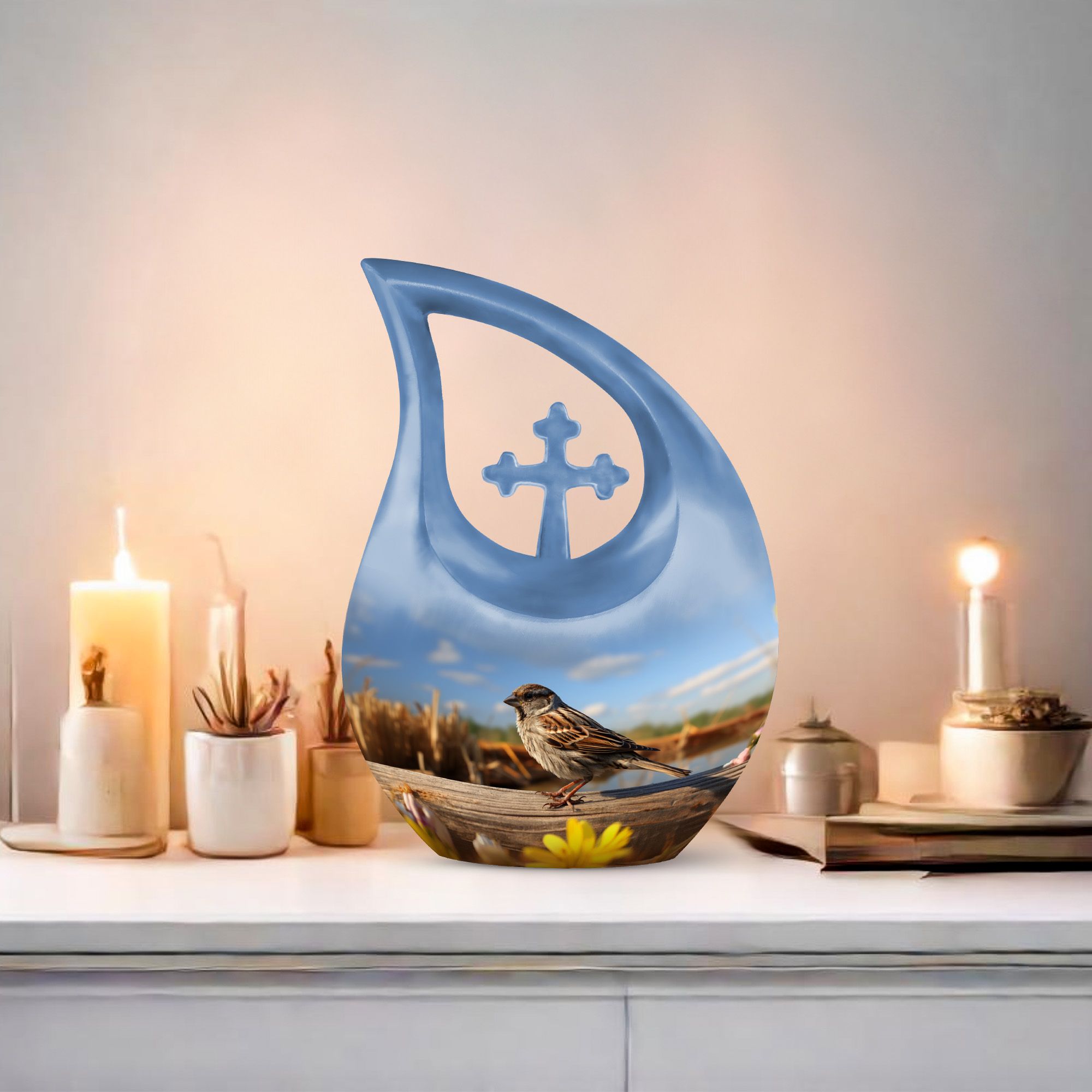 Celebrate a gentle and loving spirit with the Sparrow Cremation Urn for Human Ashes, a symbol of freedom, grace, and eternal peace. The serene light blue teardrop design, accented with a graceful sparrow motif, reflects calmness and remembrance. Ideal as an urn for adult male & female, this piece offers a heartfelt way to keep your loved one’s memory close, radiating warmth and tranquility.