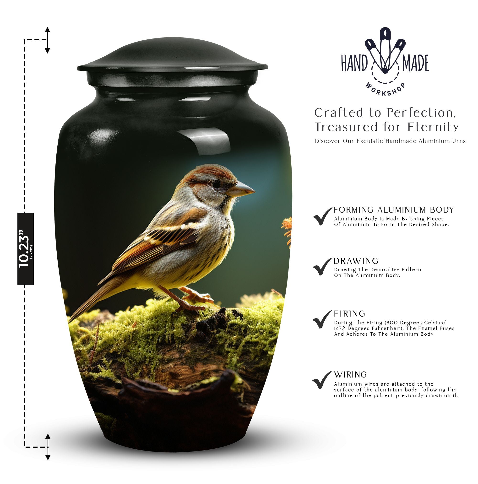 Discover reverence and peace with our Sparrow Urn, a fine choice from our exclusive collection of Memorial Urns For Ashes. Carefully crafted to preserve the memory of a cherished one, this urn stands as a beautiful symbol of lasting respect. An ideal Ash Container for Human Ashes, with its delicate design emulating a soaring sparrow, it dignifies the journey of a life well-lived. It's not just an Urn for Ashes for Men; it reflects the serenity well deserved by all adults who've crossed the portal of eternity. More than just a vessel, it serves as an exquisite addition to your current decor. It's also a testament to the enduring spirit of your beloved, encapsulating your memories and affection with their immortalized essence. Bring home this Cremation Urn for Adults and experience a unique blend of elegance and solemn tribute in remembering your dear ones lost to the tide of time. This ageless, Decorative Urn ensures your loved one remains a harmonious part of your life's tapestry, even in their eternal rest.