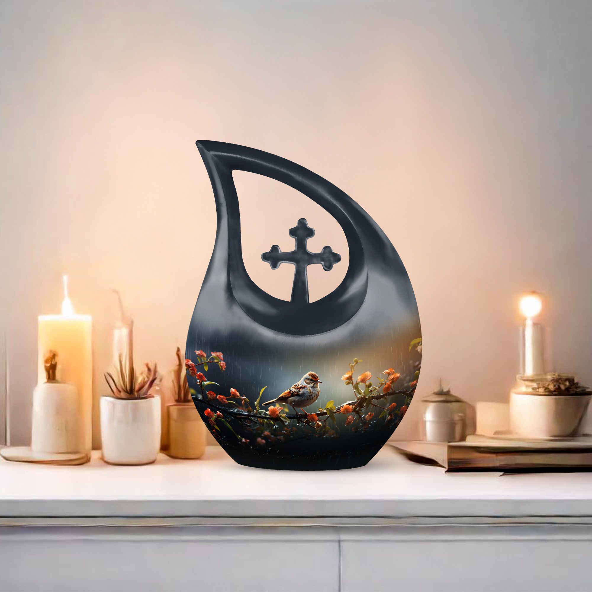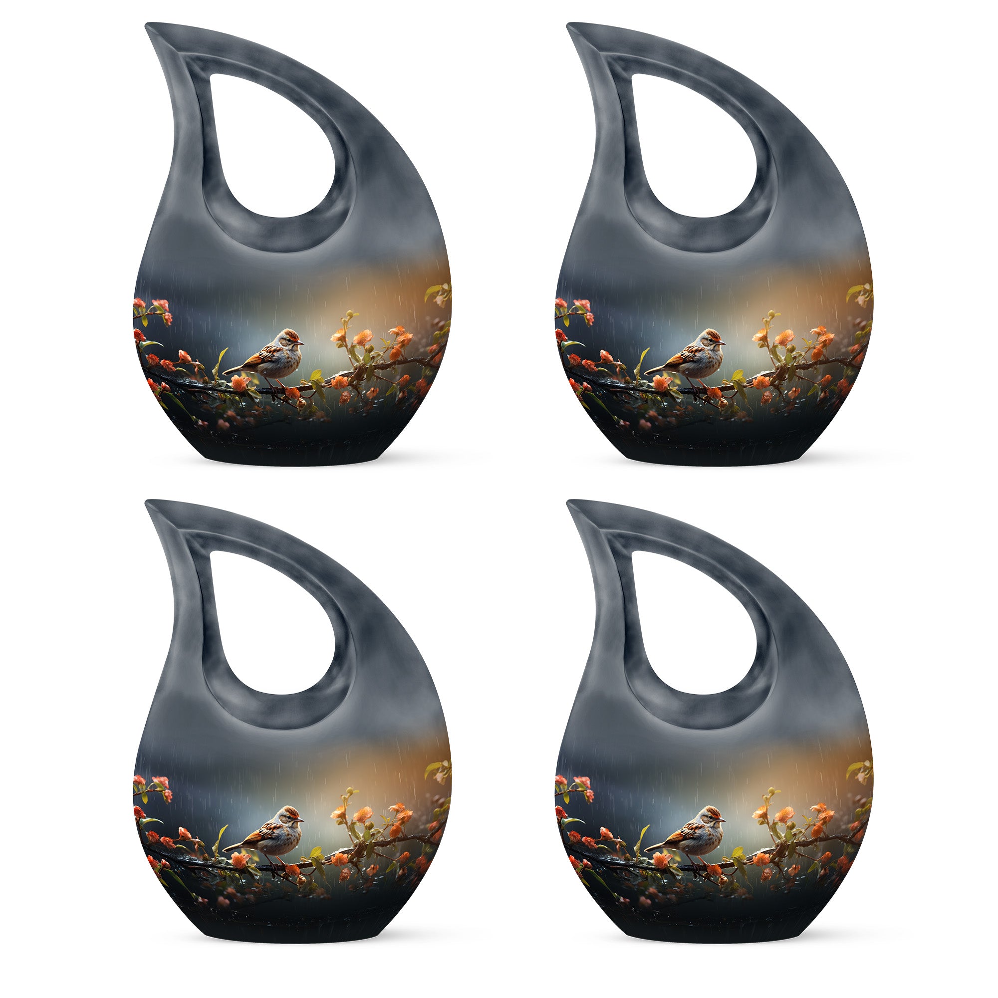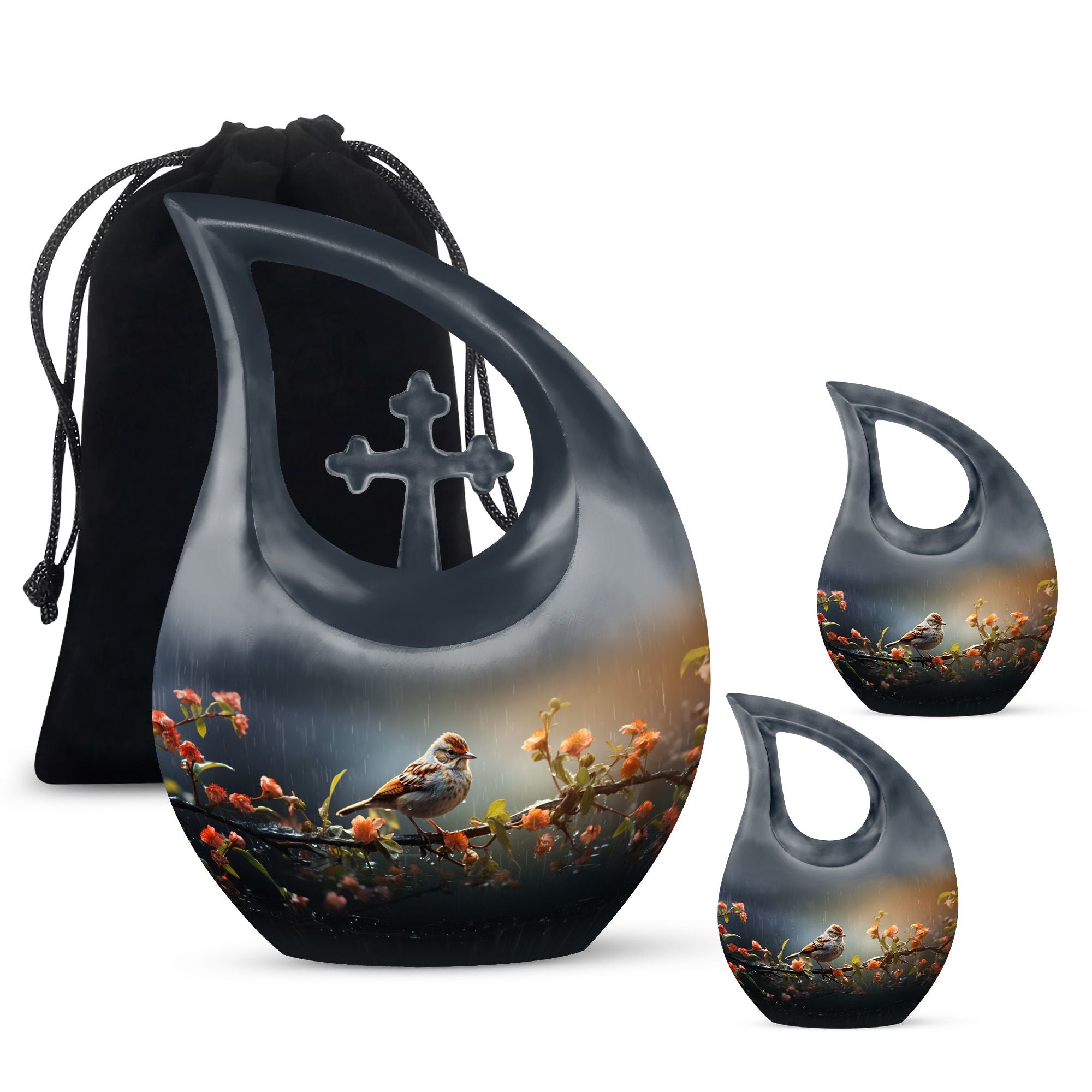 Handcrafted from durable aluminum, this cremation urn for humans features a graceful black teardrop shape adorned with a sparrow resting on a rain-touched branch — a poetic symbol of rest and renewal. Whether chosen as a cremation urn adult human or cremation urn human ash, it combines strength with artistic beauty. Families who prefer cremation urns for human ashes adult black will find this urn both dignified and emotionally resonant.