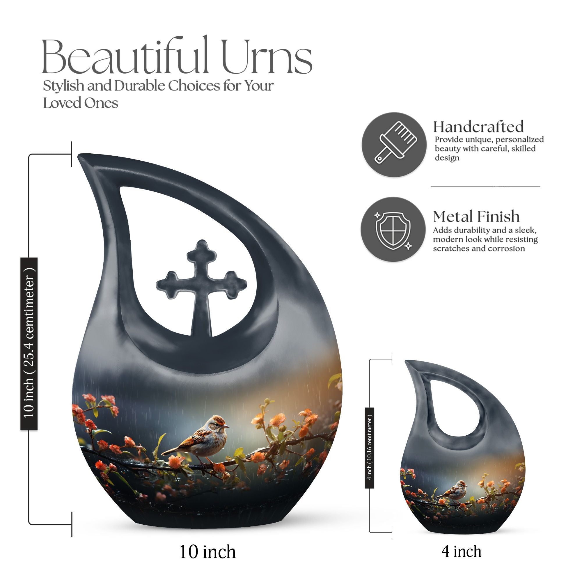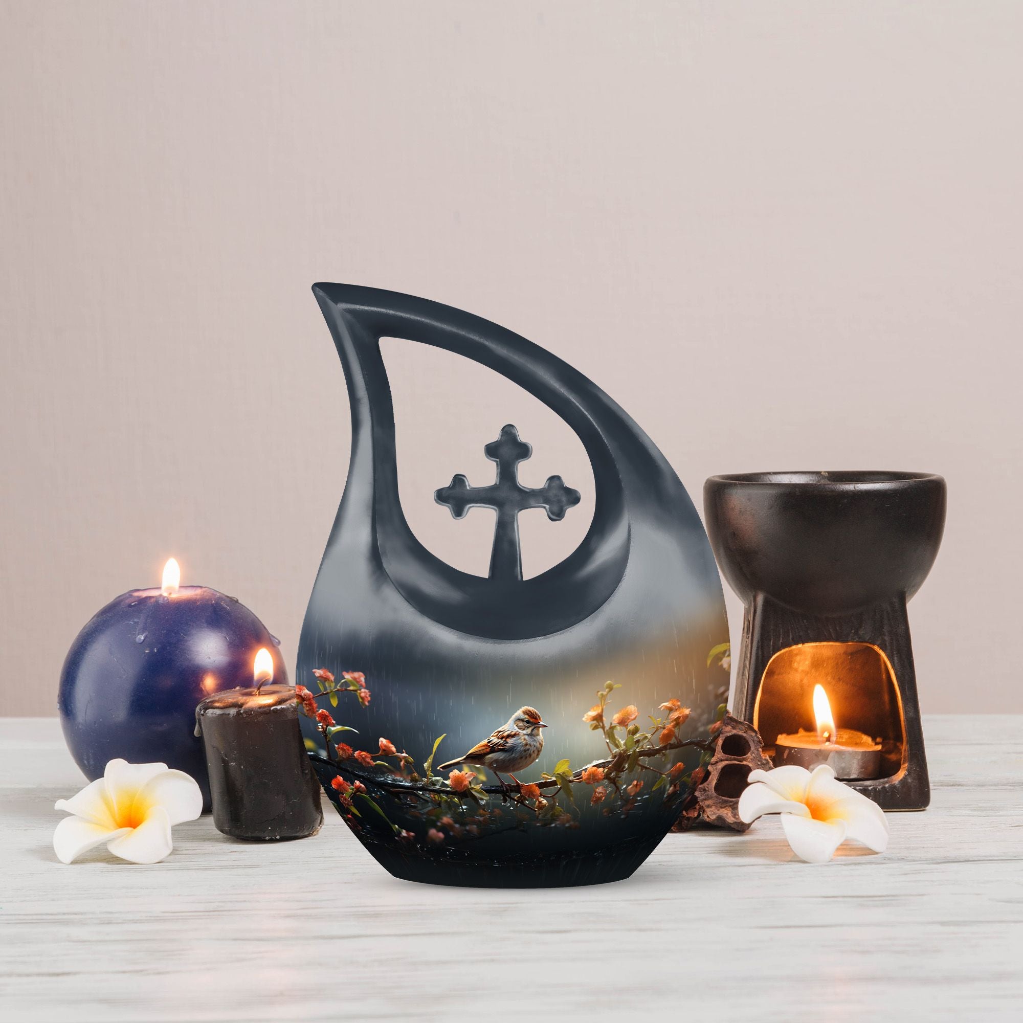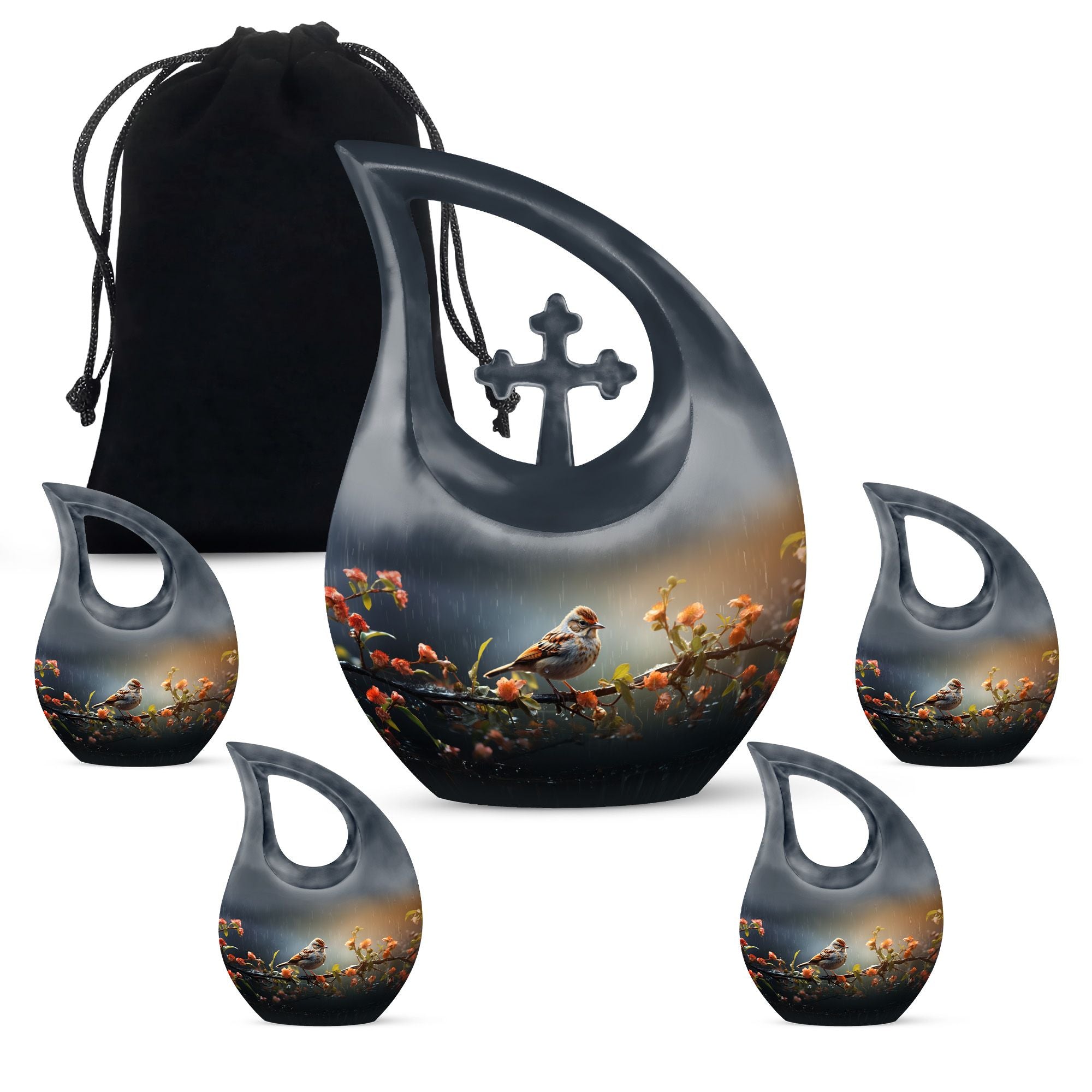 Handcrafted from durable aluminum, this cremation urn for humans features a graceful black teardrop shape adorned with a sparrow resting on a rain-touched branch — a poetic symbol of rest and renewal. Whether chosen as a cremation urn adult human or cremation urn human ash, it combines strength with artistic beauty. Families who prefer cremation urns for human ashes adult black will find this urn both dignified and emotionally resonant.