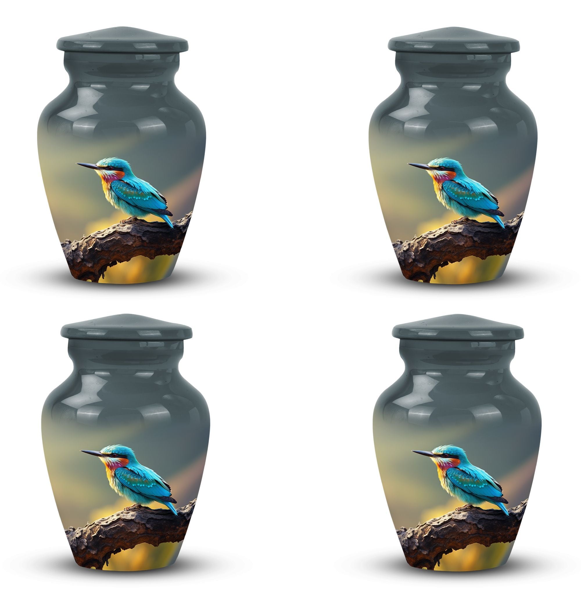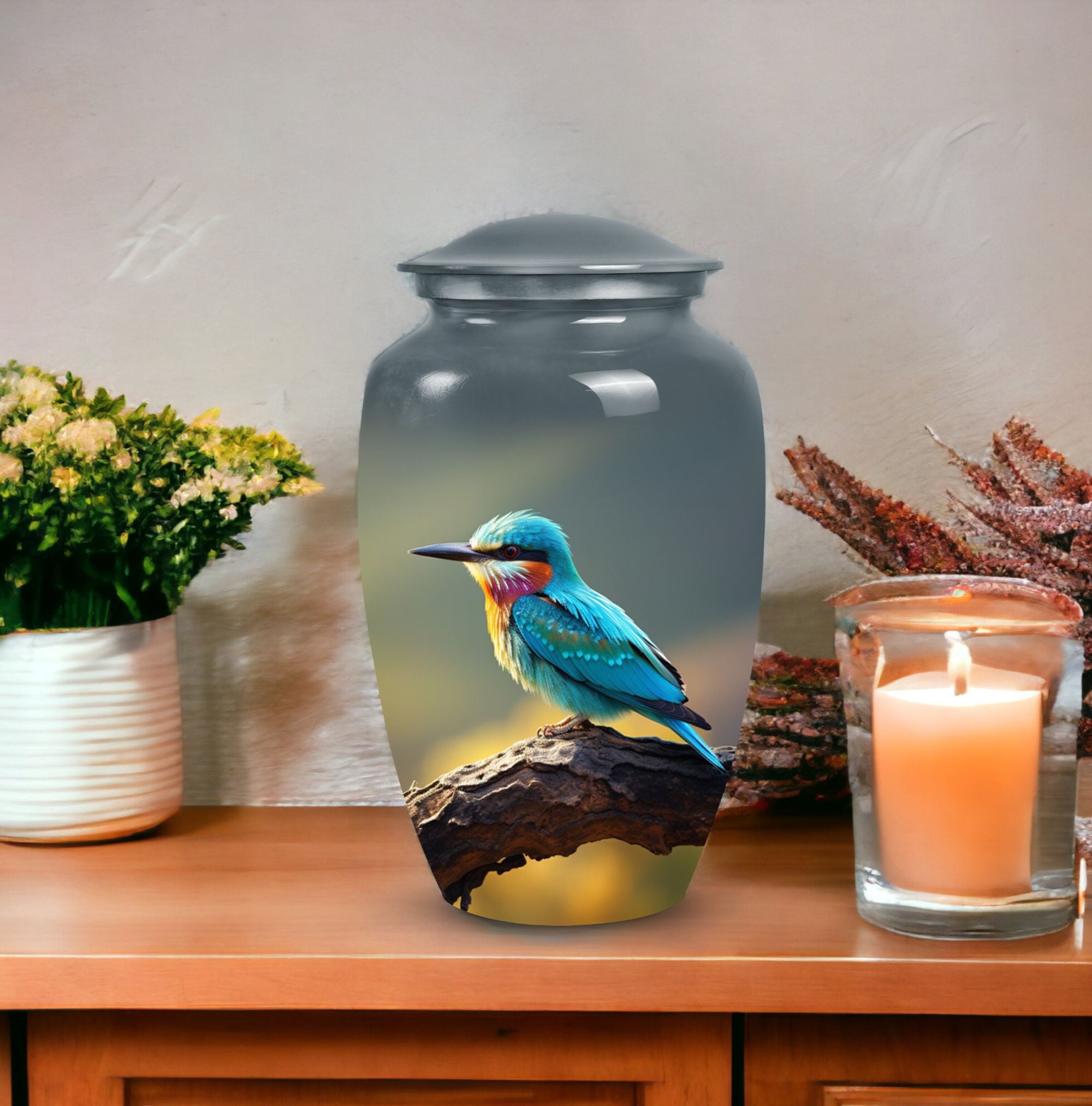 Celebrate a loved one's life with the Green Sparrow Memorial Urn, a sacred tribute to their ever-lasting presence. Express your sorrow and respect with this large 3-inch urn, characterized by its meticulously crafted classic urn style. The sturdy aluminum construction with a weight of 3.3 pounds, endures over time, preserving the precious memories. The urn measures 10 inches in height, offering 200 cubic inches of space - an ideal ashes holder or burial urn for ashes. Elevate this keepsake further by personalizing it with engraved names, making it uniquely theirs. As well as the urn, the package also includes a plush velvet pouch for the respectful containment of ashes. Ensure loved ones' spirits eternally alive with this modern interpretation of the traditional memorial urn. Ideal for those searching for 'human cremation urns', 'modern urns for human ashes', or 'burial urns for ashes'. A dignified way to say 'sorry for your loss'.