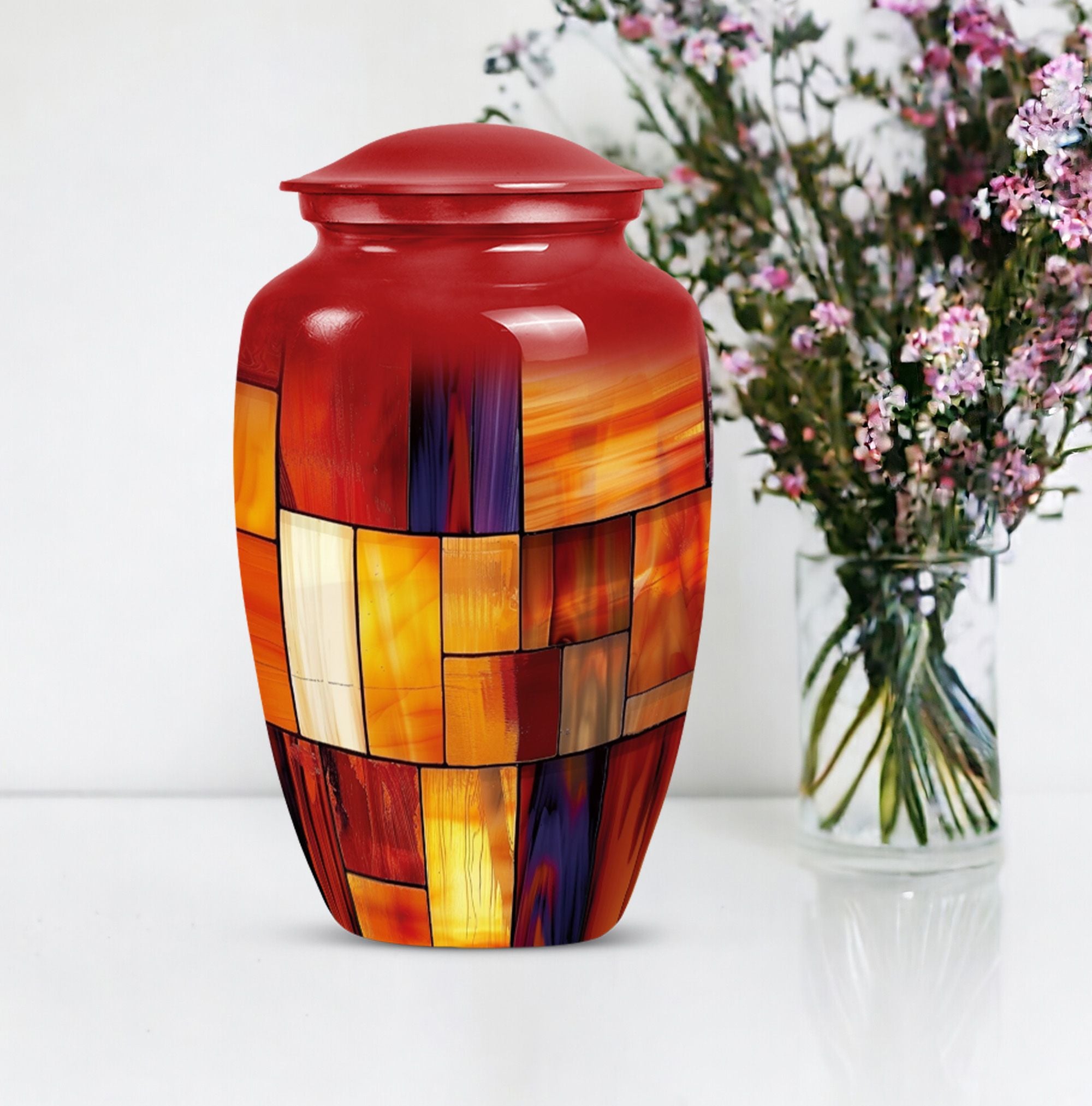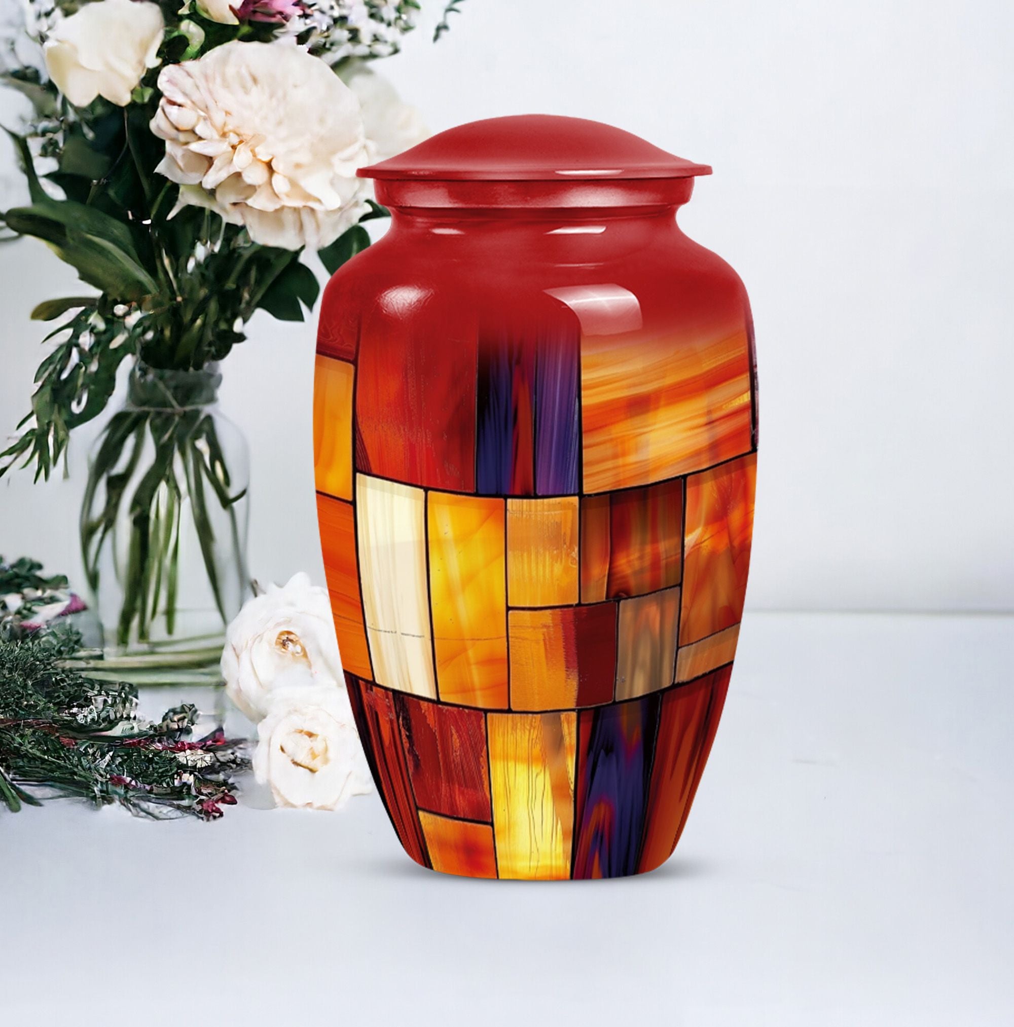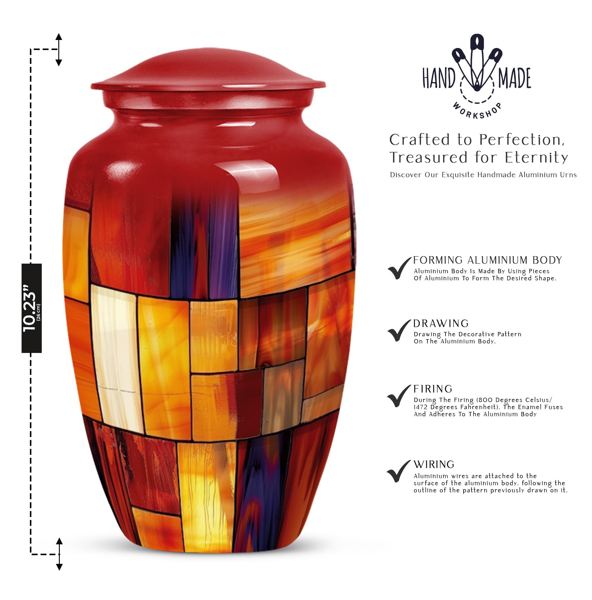 Indulge in a beautiful remembrance with our superior 10 Inch stained glass urn. Ideal for both adult female and male, this funeral decorative urn sets a peaceful and serene tone to any memorial ceremony. Its uniqueness stems from the exceptional aluminium material and uniquely themed stained glass. Not only is this captivating memorial urn built to withhold up to 200 cubic inches in capacity, but it also weighs only 3.3 pounds, making it portable and convenient. This classic urn comes with a velvet pouch meant for the safe keeping of your loved one's ashes. Furthermore, there's an option to personalize this large urn by engraving the names of your choosing. Be it for cremation ashes mother or urns for human ashes adult, this enduring remembrance balances utility with a timeless aesthetic.
