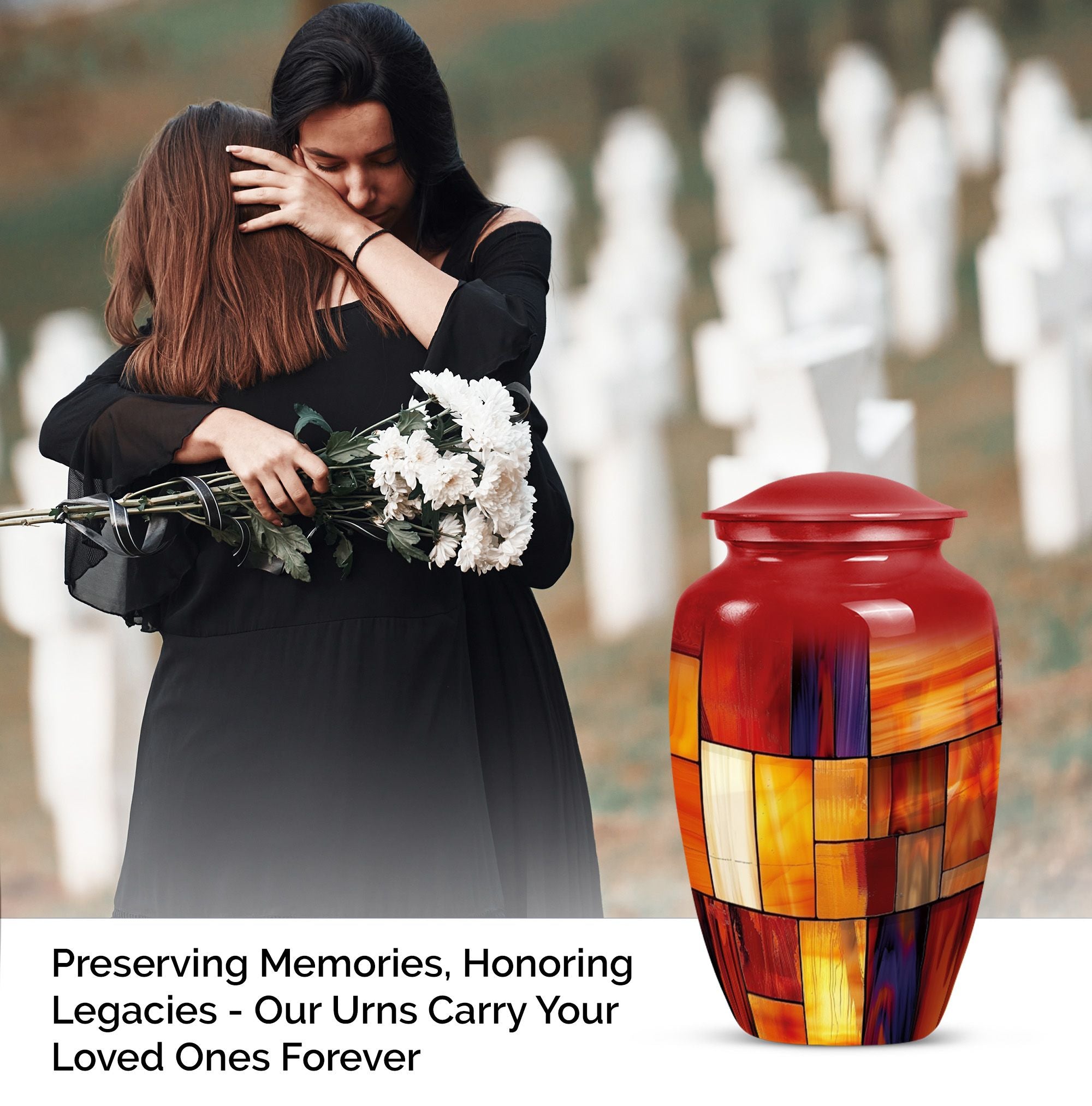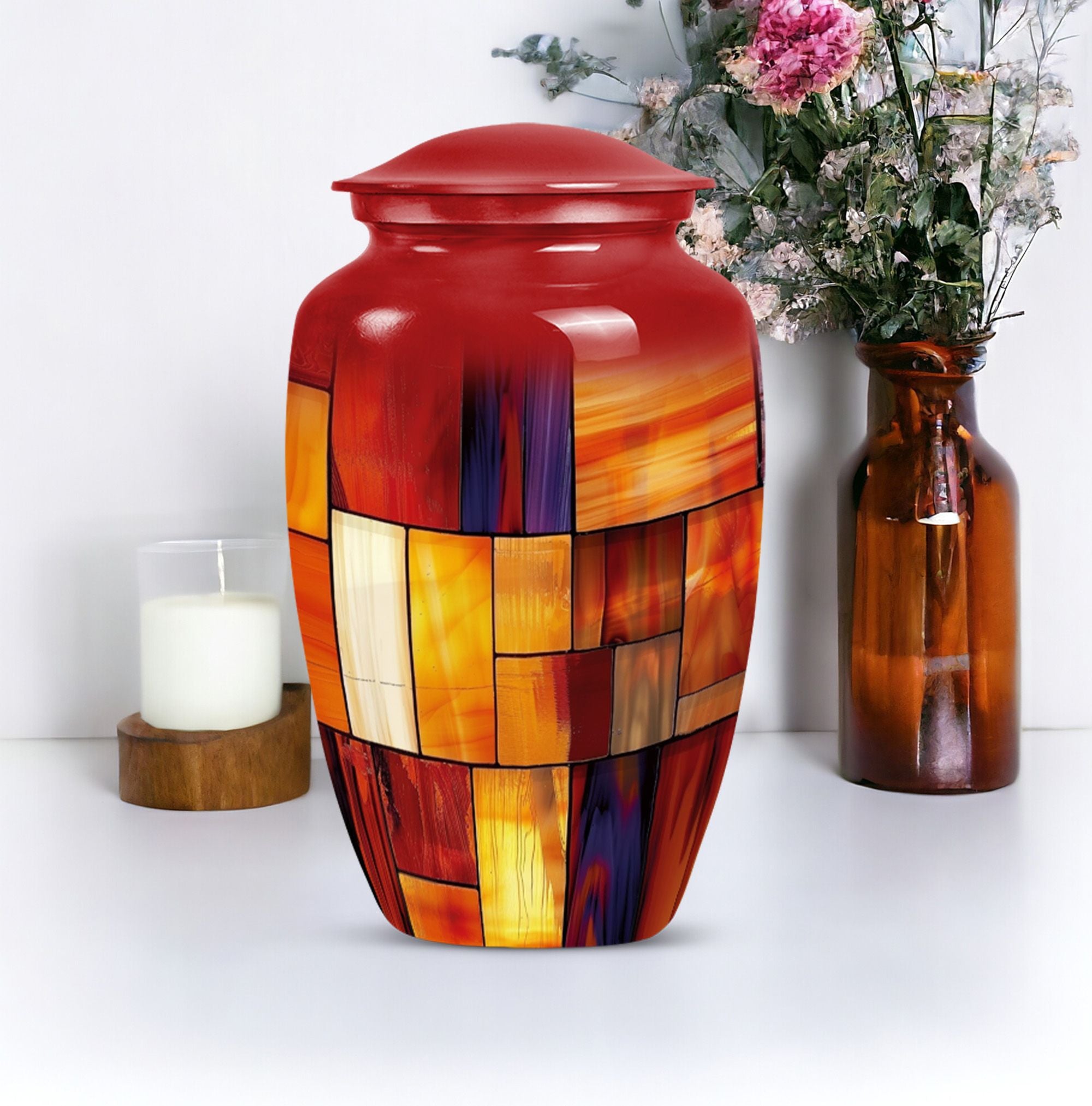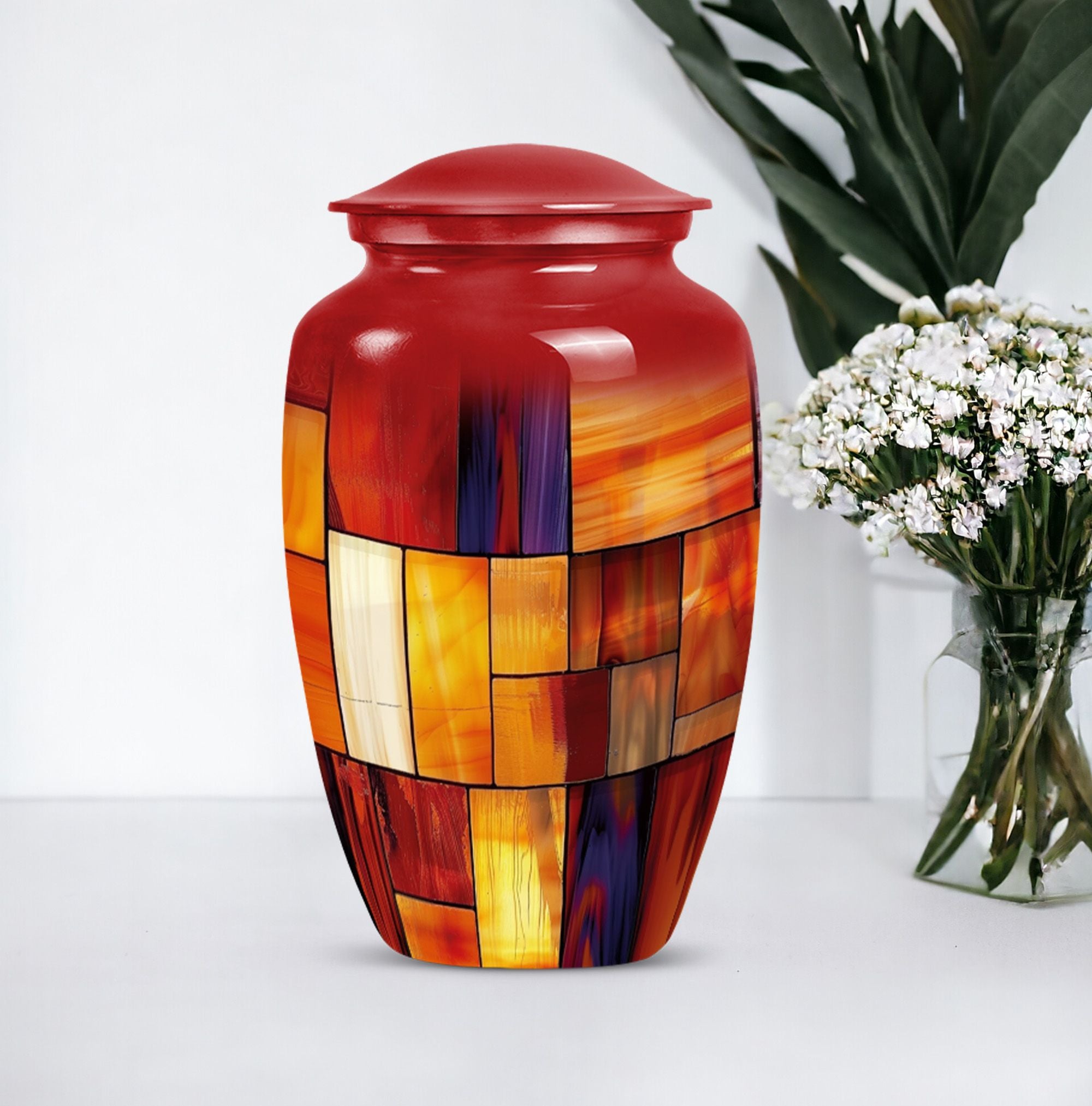 Indulge in a beautiful remembrance with our superior 10 Inch stained glass urn. Ideal for both adult female and male, this funeral decorative urn sets a peaceful and serene tone to any memorial ceremony. Its uniqueness stems from the exceptional aluminium material and uniquely themed stained glass. Not only is this captivating memorial urn built to withhold up to 200 cubic inches in capacity, but it also weighs only 3.3 pounds, making it portable and convenient. This classic urn comes with a velvet pouch meant for the safe keeping of your loved one's ashes. Furthermore, there's an option to personalize this large urn by engraving the names of your choosing. Be it for cremation ashes mother or urns for human ashes adult, this enduring remembrance balances utility with a timeless aesthetic.