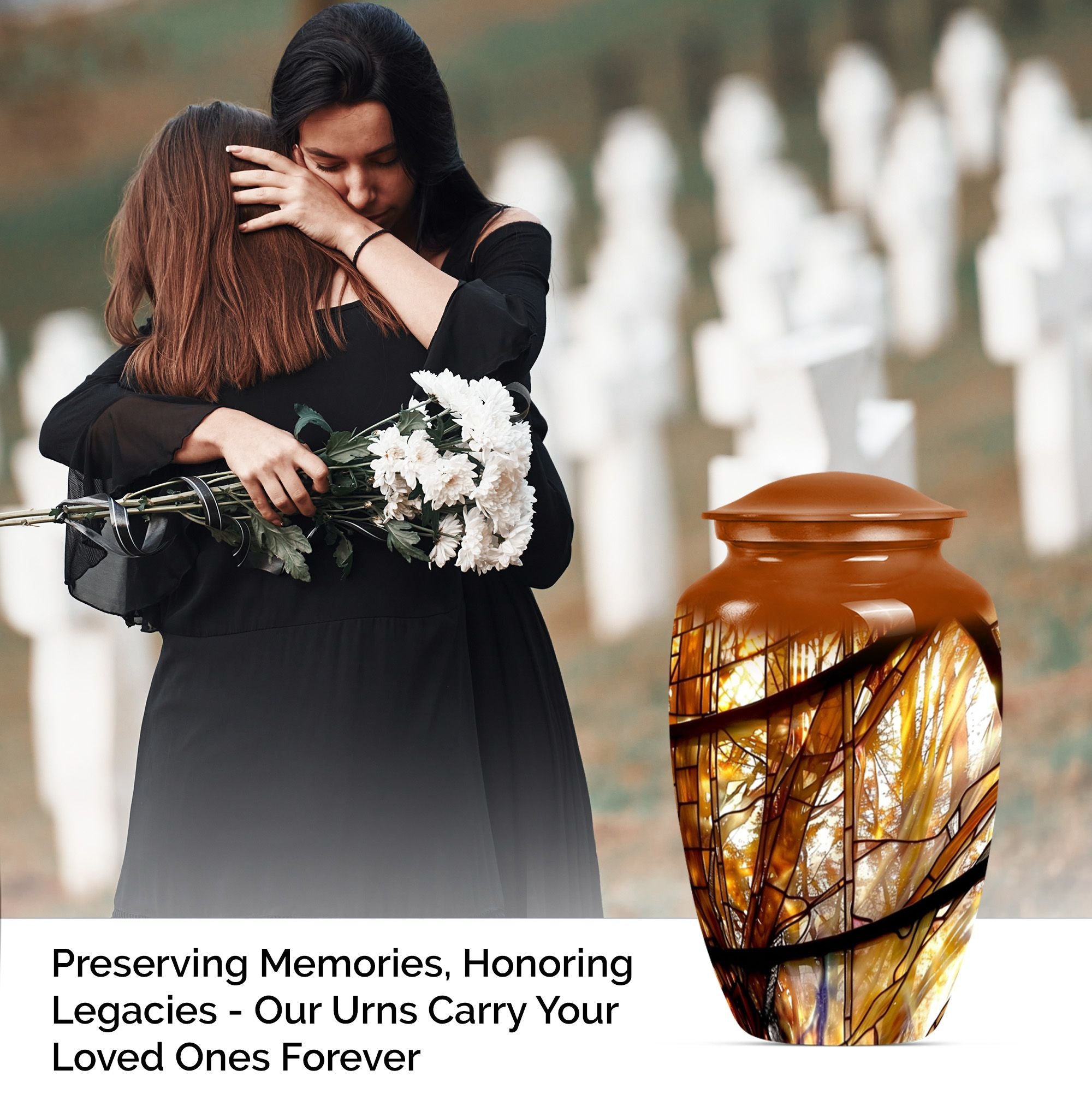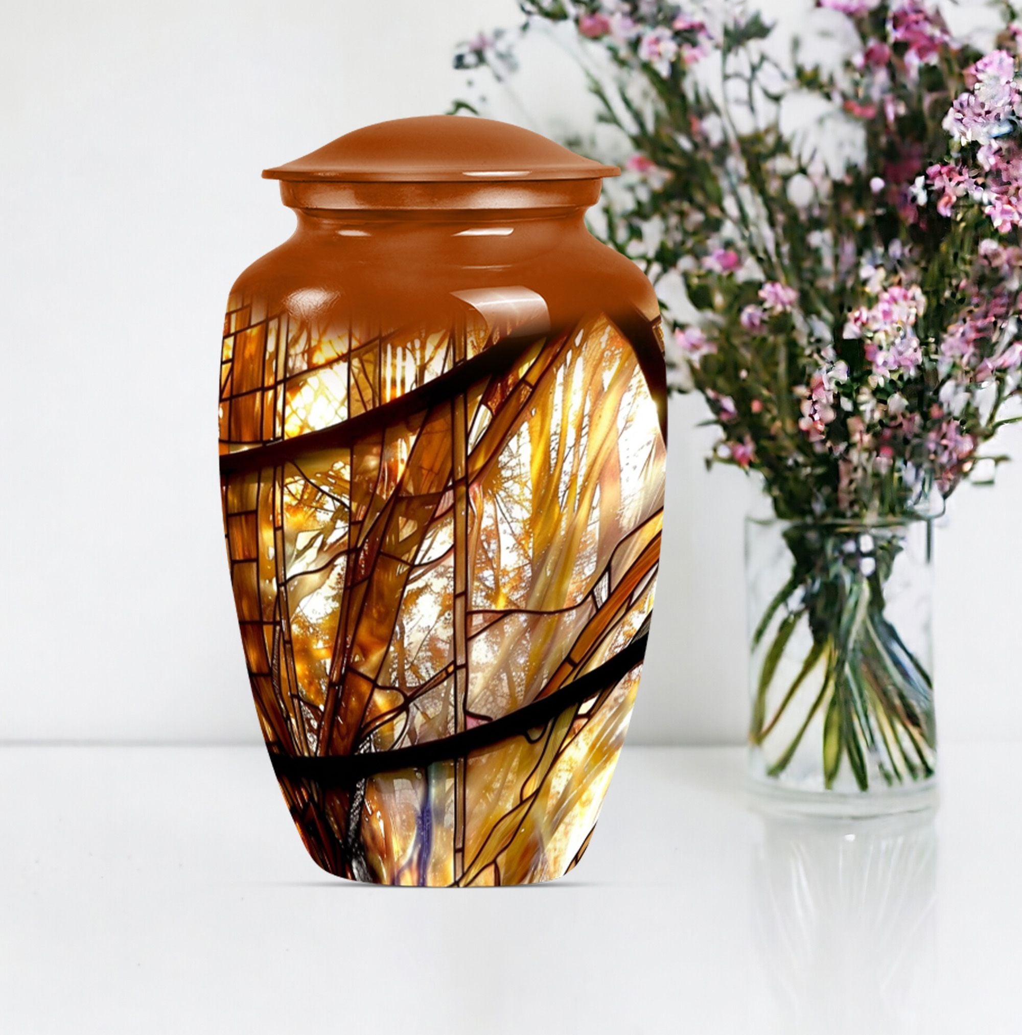 Elegantly safeguard your cherished one's remains with this 10-inch stained glass Urn, a perfect combination of functionality and intricate design. Ideal as a funeral urn for men's ashes, this product in our range of large urns is crafted from robust aluminium, lending it a sense of enduring dignity. The abstract theme provides a poignant, artistic touch, turning this urn into more than just a memorial item - it's also a piece of art. The urn is easy to manage, at a weight of 3.3 pounds, and has a capacity of holding upto 200 cubic inches of ashes. Express your love and devotion with the option to personalize the urn with engraved names, immortalizing your bond. It also comes with a velvet pouch for tasteful and respectful containment of ashes. These memorial urns perfectly serve their purpose, serving as a tangible memory of your loved ones. Ideal for those searching for 'adult urns for ashes,' 'Decorative Human Ashes Urns,' or a simply a 'metal urn.'
