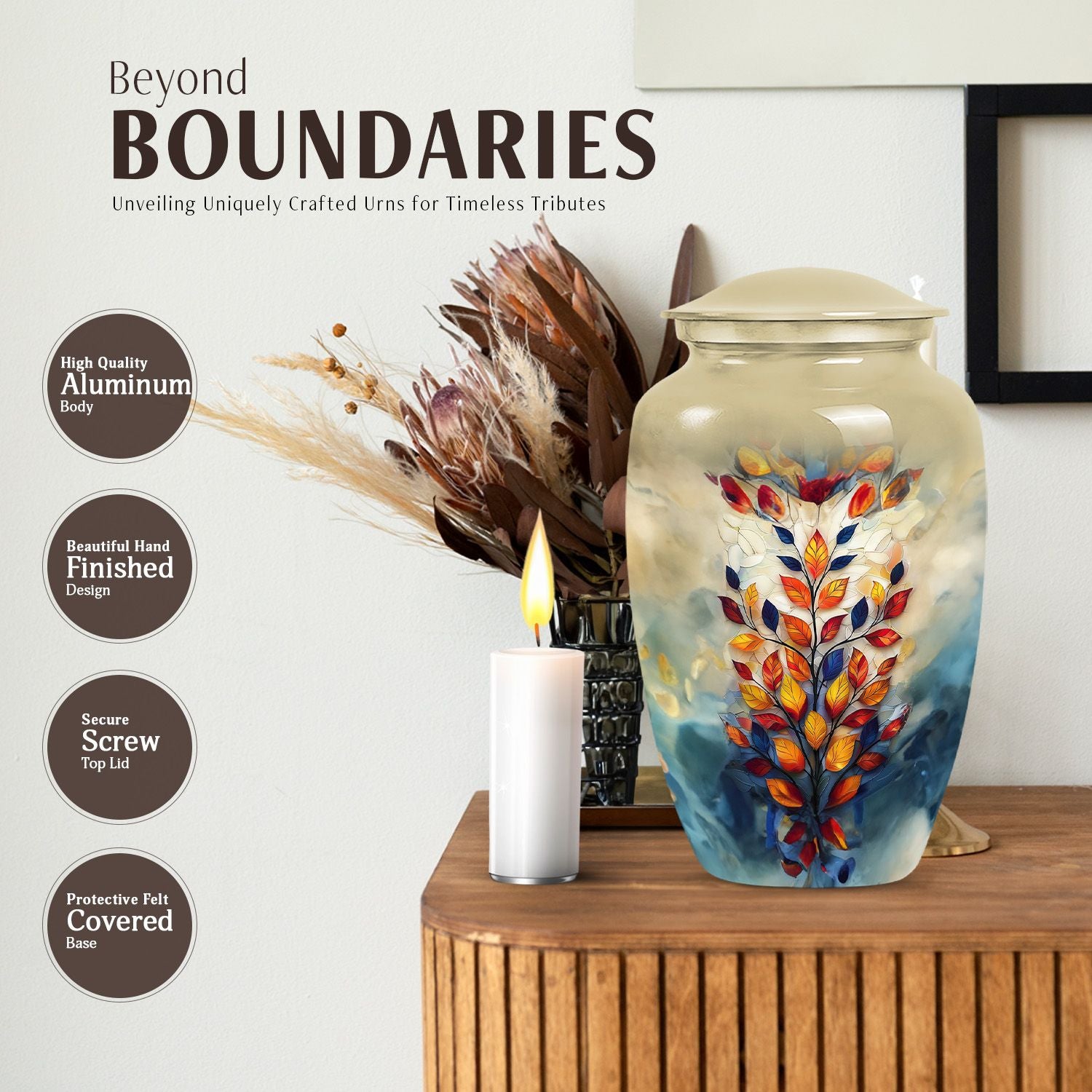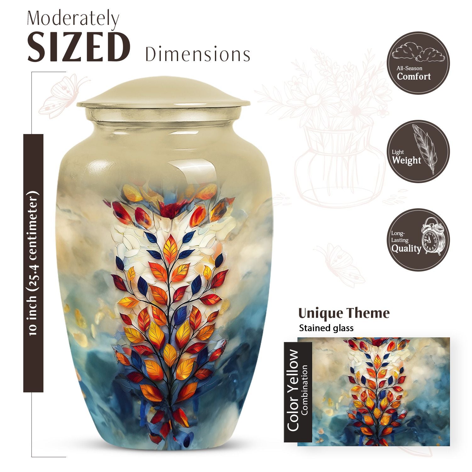 Unveiling our lavish 10-inch stained glass urn, a timeless tribute encapsulating the harmony between enduring beauty and undying homage. Made with refined Aluminium, this cremation urn boasts an abstract theme manifesting itself through resonating artistry. Its classic Urn structure lends an element of timeless elegance, ushering in an enduring connection to your loved ones. Weighing 3.3 pounds and standing 10 inches tall, it can securely accommodate 200 cubic inches of your loved ones' precious remains. The urn comes with a soft velvet pouch to delicately store the ashes, adding a layer of protection and intimacy. It becomes a unique memorial urn through the personalization option, engraving names to keep their memory alive perpetually. Primed for memorial ceremonies, this product sets the bar high as an urn for funerals, a distinguished burial urn for men, or a large iridescent metal box serving as an eternal resting place for your loved one.