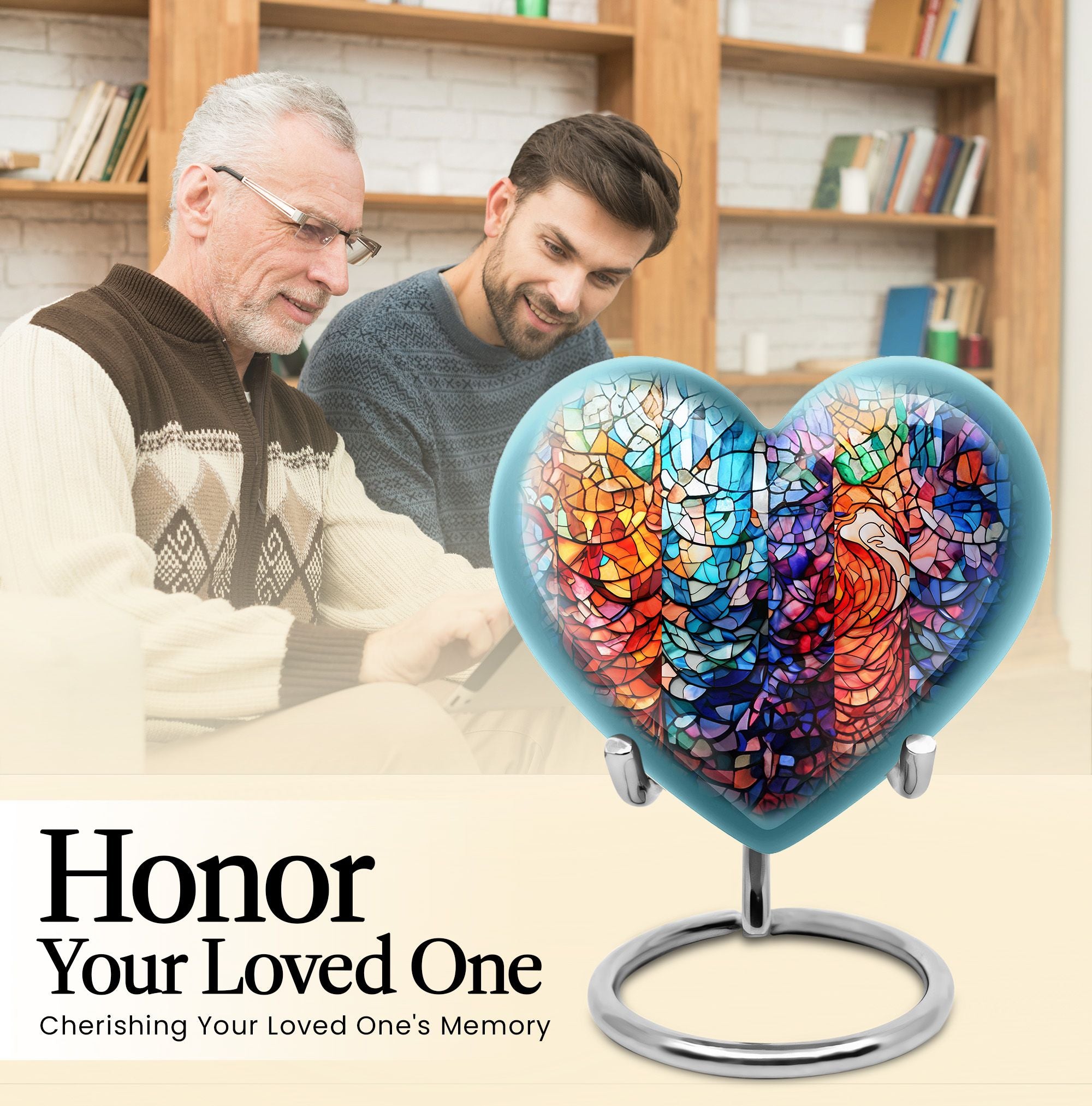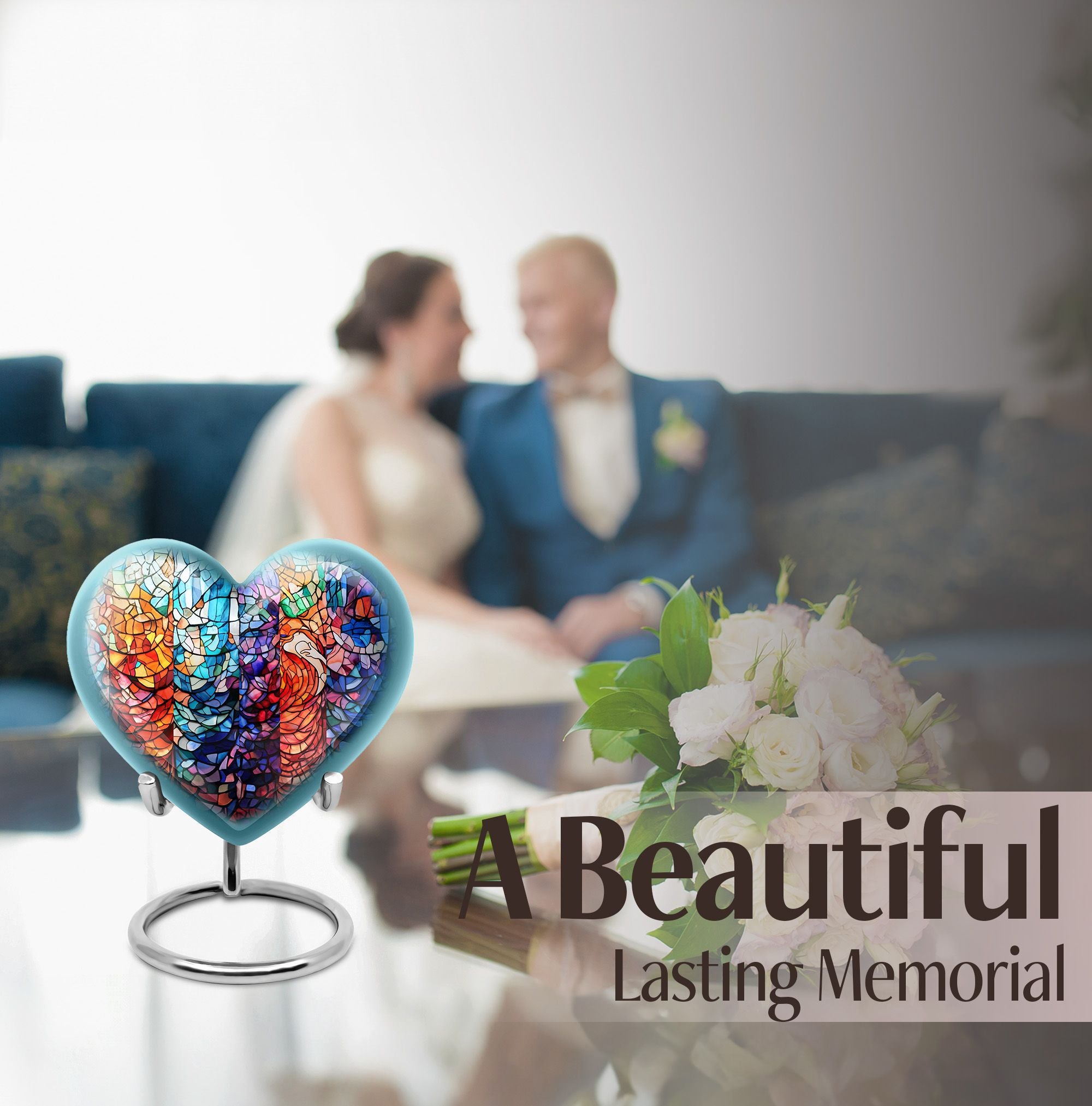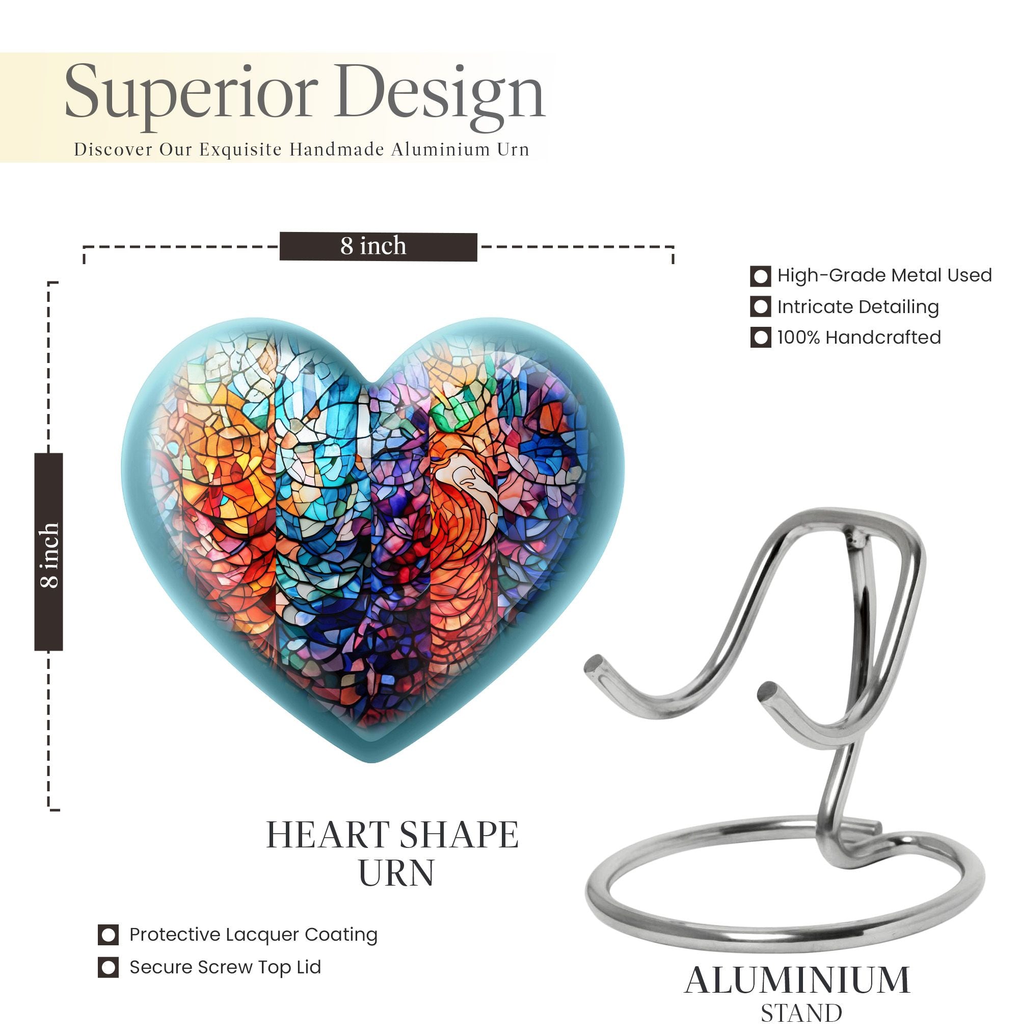 Cherish your loved one's memory with our large, thoughtfully crafted 'Heart' urn - a sublime resting place for ashes. This exquisite piece, standing at 10 inches, is a magnificent testament of your undying affection, appealing to adult and senior consumers looking for a beautiful place to keep their beloved's ashes. Crafted from durable aluminium, weighing 3.3 pounds, it offers a capacity of substantial 200 cubic inches, making it one of our most spacious offerings. For a personal touch, you have the option to engrave names on it. The stained glass theme adds to its charming appeal, making this urn an attractive memorial keepsake. It is shipped with a velvet pouch for containment of ashes, enhancing its value. For those seeking 'stained glass urn', 'funeral cremation urns for women', 'memorial urns', 'large urns for ashes', or 'funeral urns for adult ashes' – this heart urn is a perfect choice, blending sentimentality with an aesthetic appeal.