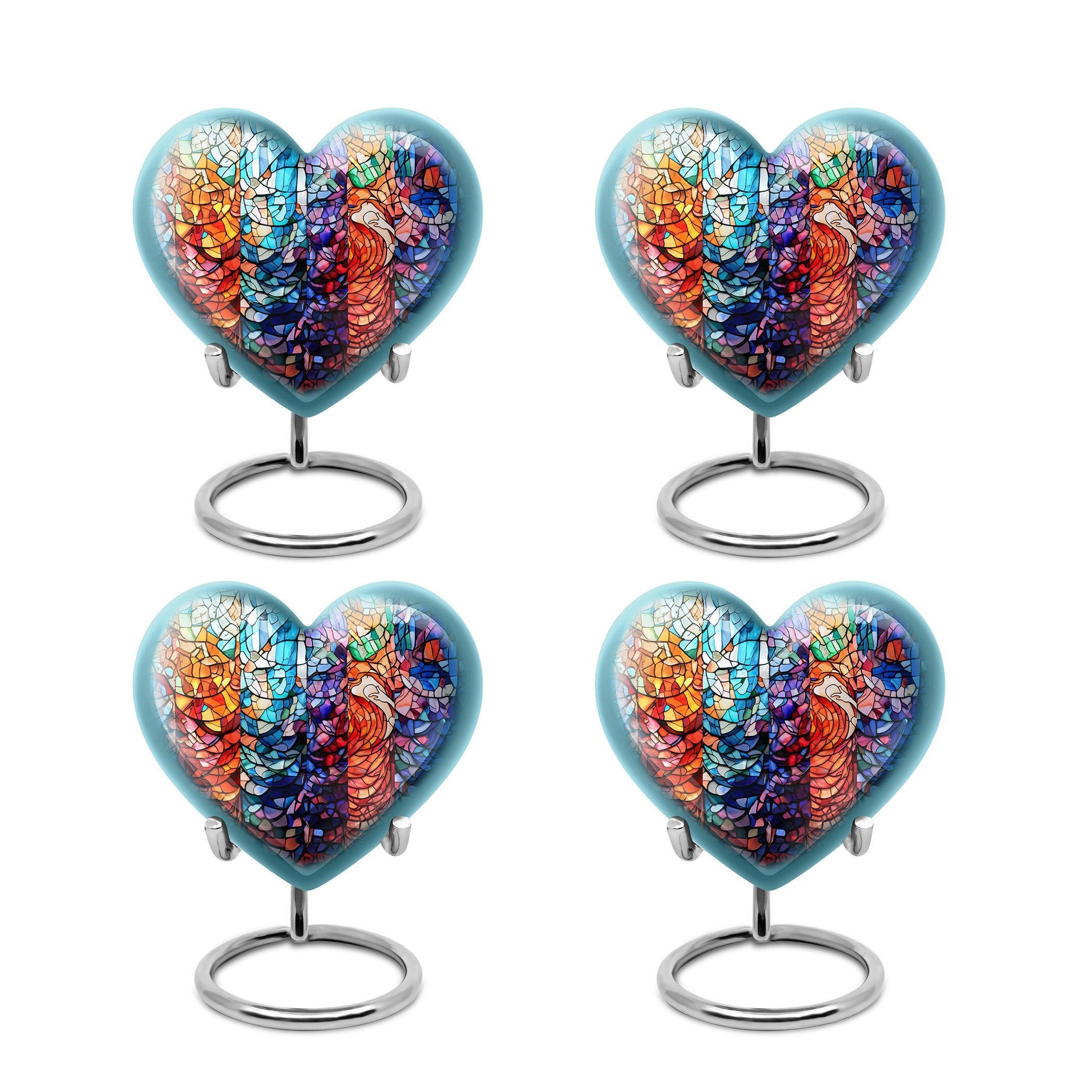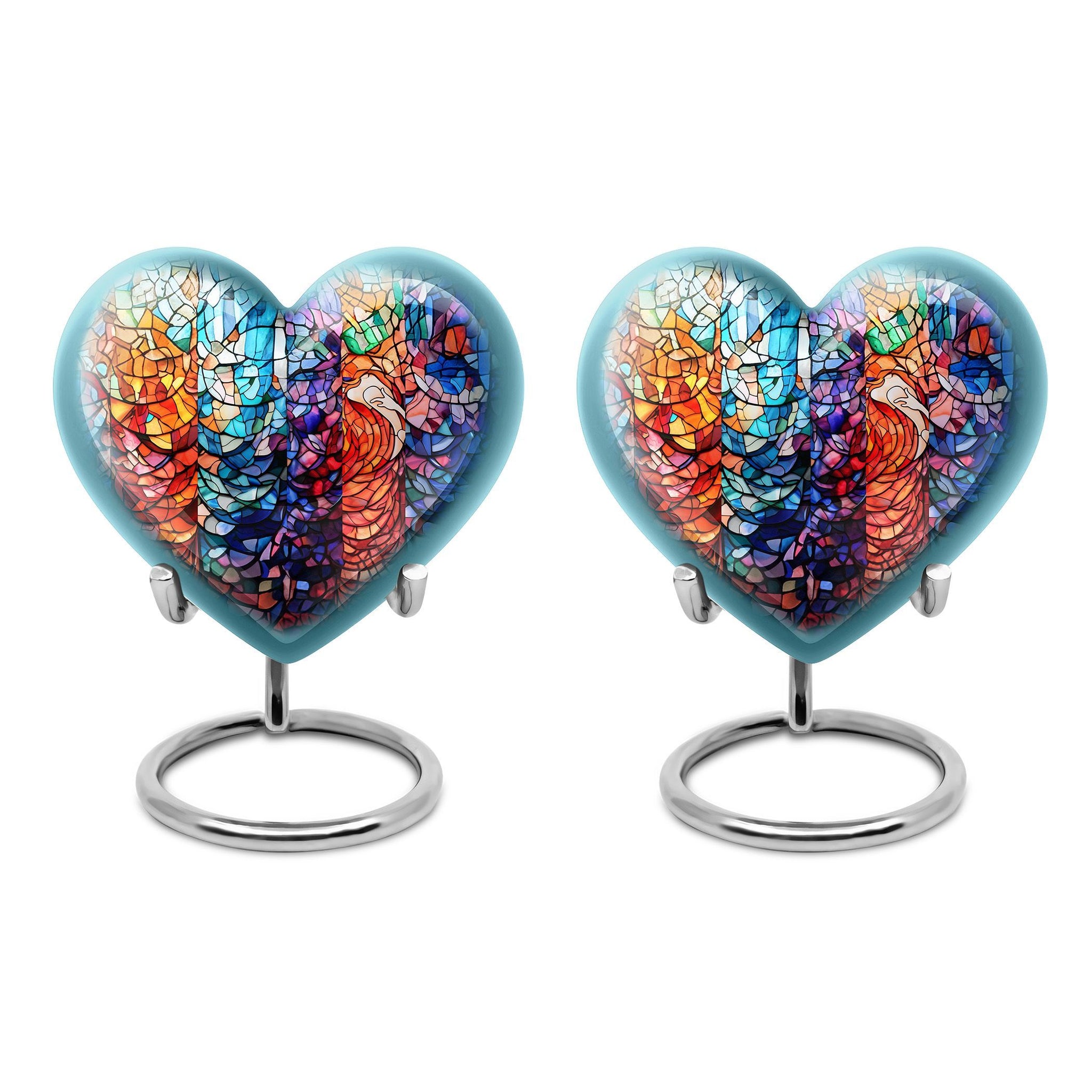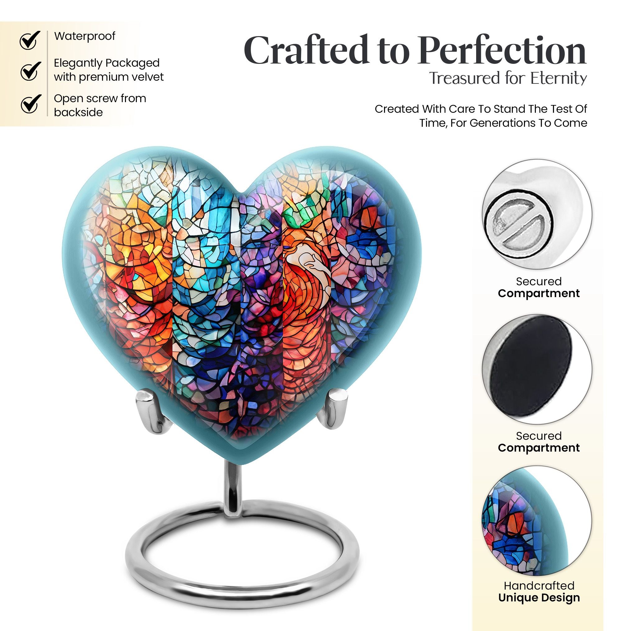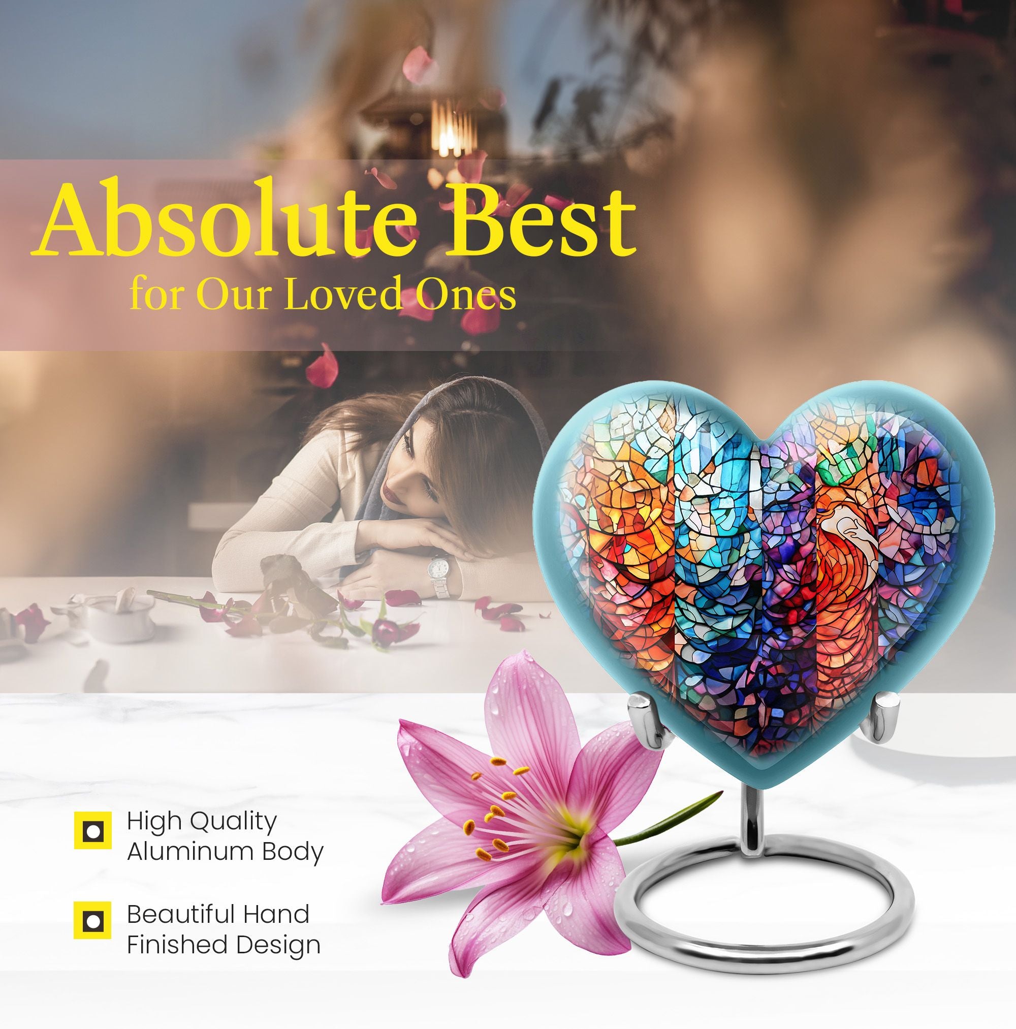 Cherish your loved one's memory with our large, thoughtfully crafted 'Heart' urn - a sublime resting place for ashes. This exquisite piece, standing at 10 inches, is a magnificent testament of your undying affection, appealing to adult and senior consumers looking for a beautiful place to keep their beloved's ashes. Crafted from durable aluminium, weighing 3.3 pounds, it offers a capacity of substantial 200 cubic inches, making it one of our most spacious offerings. For a personal touch, you have the option to engrave names on it. The stained glass theme adds to its charming appeal, making this urn an attractive memorial keepsake. It is shipped with a velvet pouch for containment of ashes, enhancing its value. For those seeking 'stained glass urn', 'funeral cremation urns for women', 'memorial urns', 'large urns for ashes', or 'funeral urns for adult ashes' – this heart urn is a perfect choice, blending sentimentality with an aesthetic appeal.