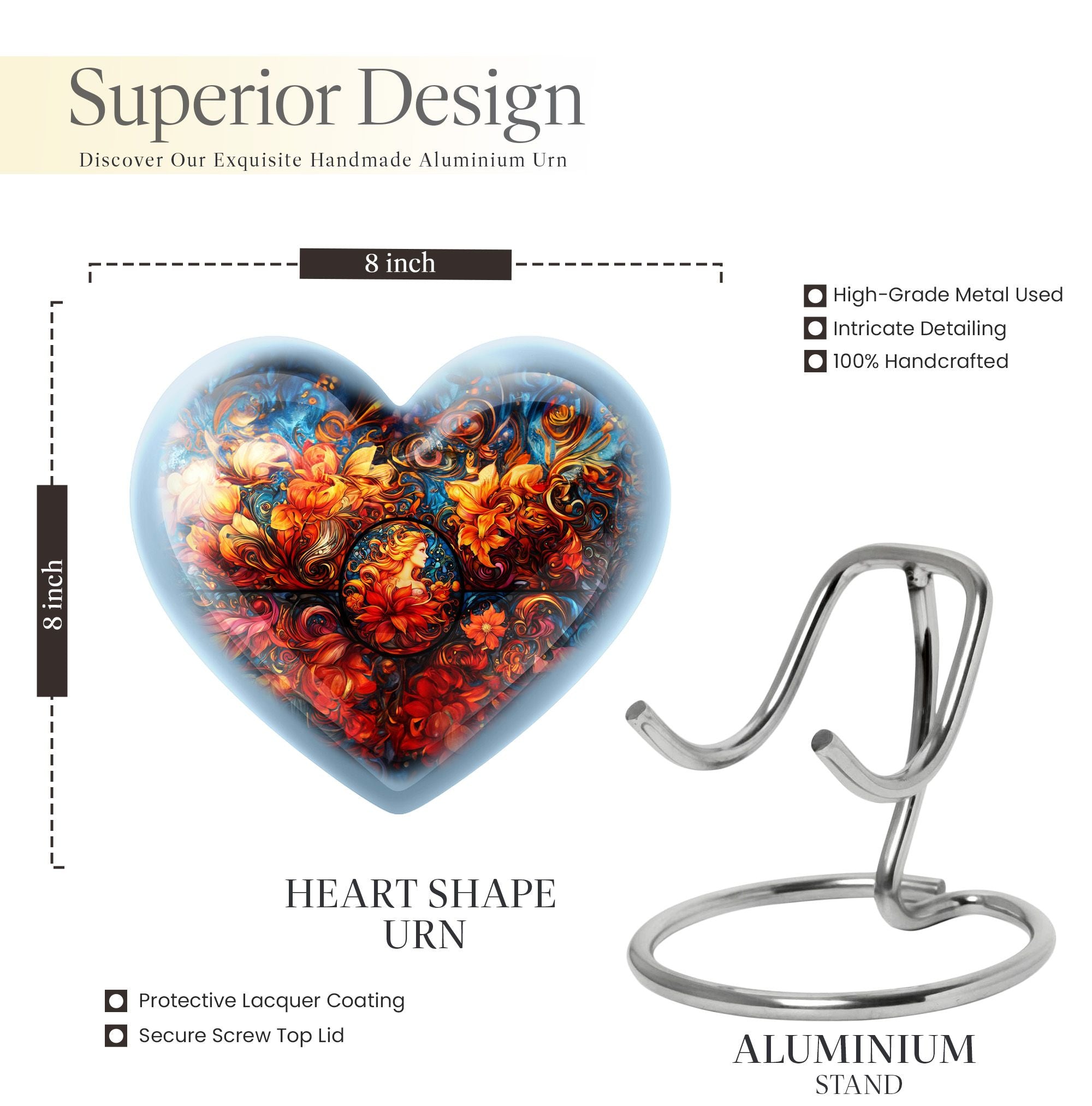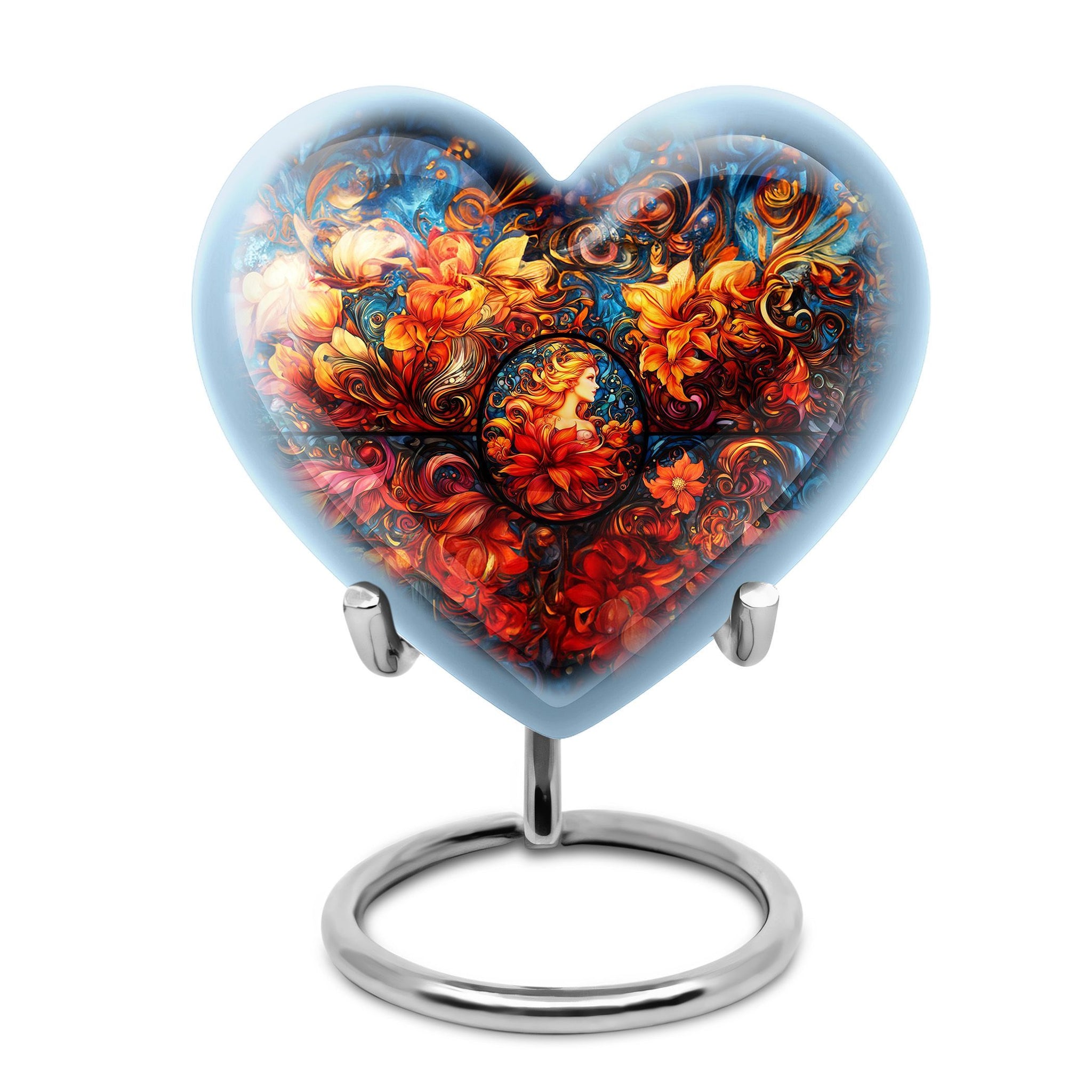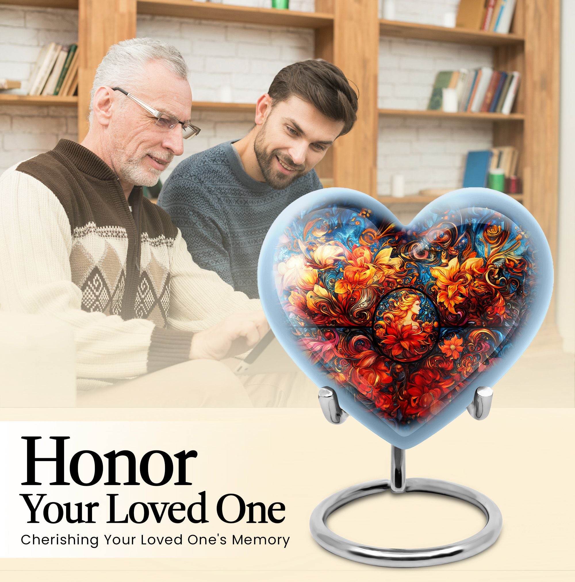 Give eternal peace to the departed soul with our meticulously handcrafted stained glass urn, a classic attribute in the world of memorial ceremony supplies. This exquisite 10-inch aluminium urn, with its weight of 3.3 pounds, offers ample capacity of 200 cubic inches, ideal for the containment of ashes post cremation. The heart urn design is an element of perpetual adoration, creating an aesthetic balance between elegance and symbolism. The jewel-toned hue of the stained glass complements the urn's architecture, delivering a sophisticated and timeless piece. We invite you to personalize this cremation urn with engraved names, adding a touch of intimacy and fond remembrance. The product comes with a velvet pouch, thoughtfully designed for careful containment of ashes. This funeral cremation urn matches perfectly with your expectations of an ash adult funeral urn or an urn for cremation ashes mother. A fitting tribute to the beloved ones, this stained glass heart urn is an embodiment of love and remembrance.
