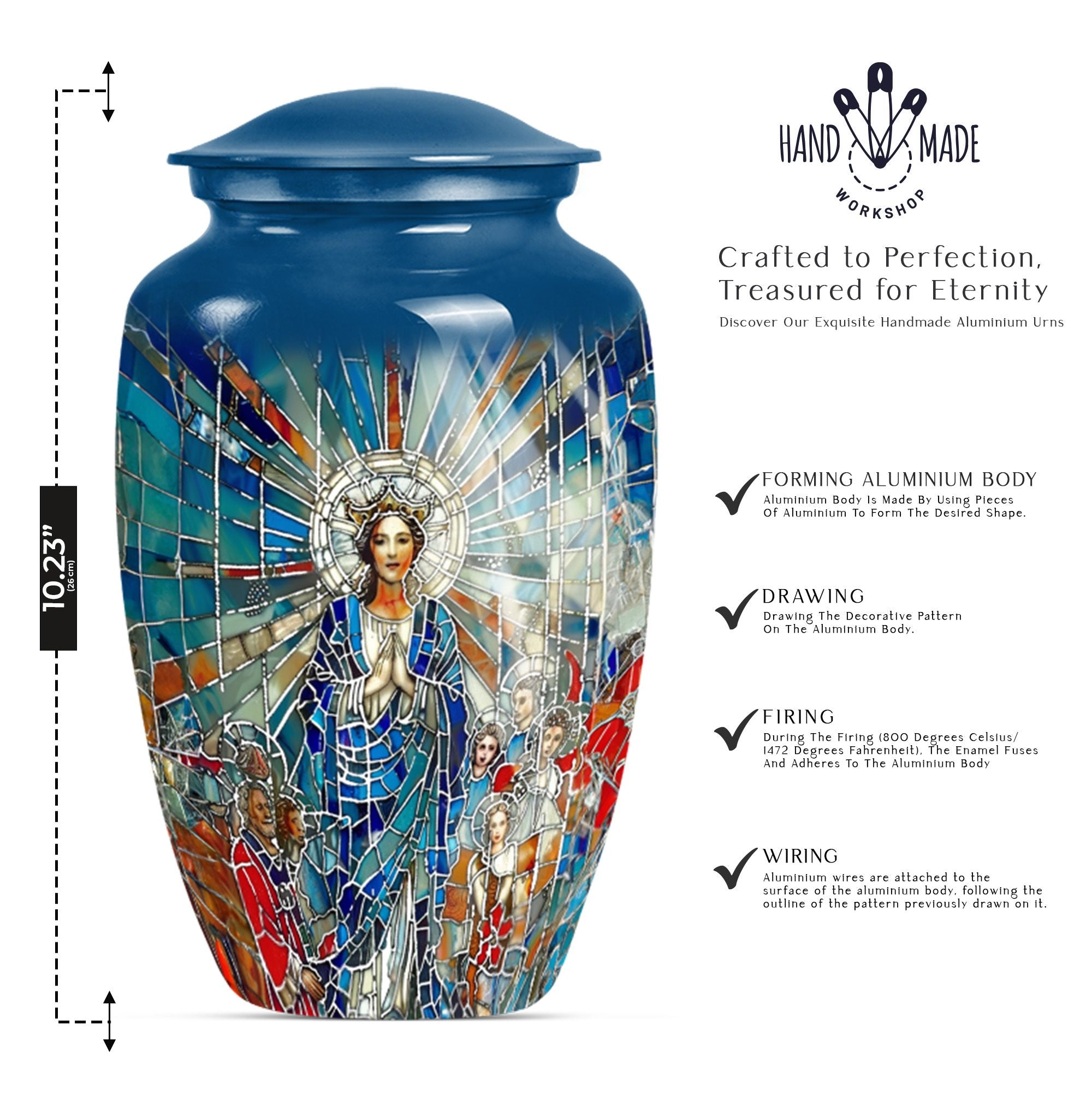 Immerse in the serene beauty of our meticulously crafted 10-inch stained glass urn. Cast from high-quality aluminium, this sturdy 3.3-pound urn exudes perennial enchantment while safeguarding treasured memories for eternity. Its impressive capacity of 200 cubic inches comfortably contains ashes, safeguarded within a deluxe velvet pouch provided. The abstract theme enlivens this classic urn, marrying tradition with sophisticated artistry. Whether you seek funeral ash urns, cremation urns for humans or memorial burial urns, our durable and large urn rises to the occasion. This timeless piece transcends generations, offering comfort during memorial ceremonies. The added attribute of personalization permits engraved names, allowing an intimate connection for mourning individuals. Our urn, an epitome of dignity and respect, takes into central consideration the tender feelings of adults and seniors. Browse our collection for more funeral urns for adult ashes men, entwining quality with your emotional needs.