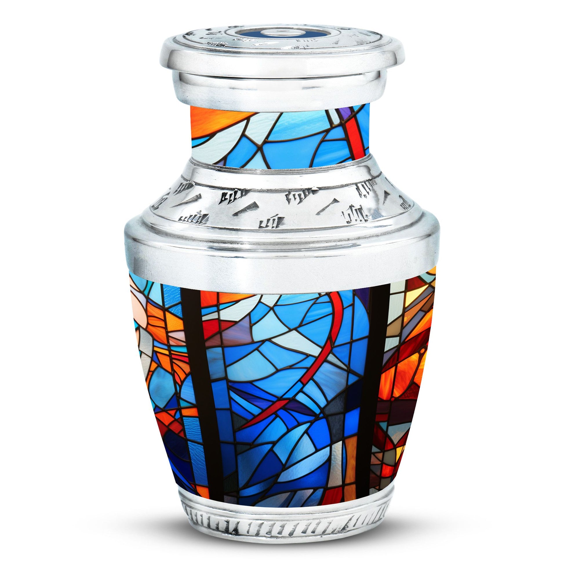 The **Stained Glass Mini Urn** features **intricate stained glass patterns, symbolizing the radiant spirit and lasting presence of a loved one**.