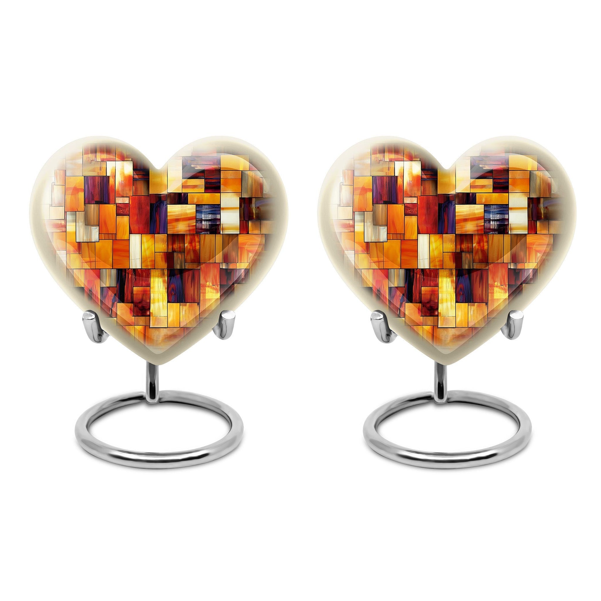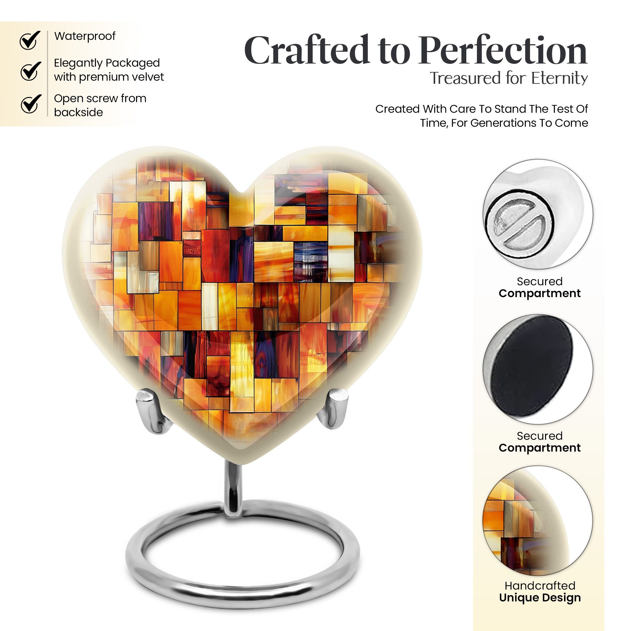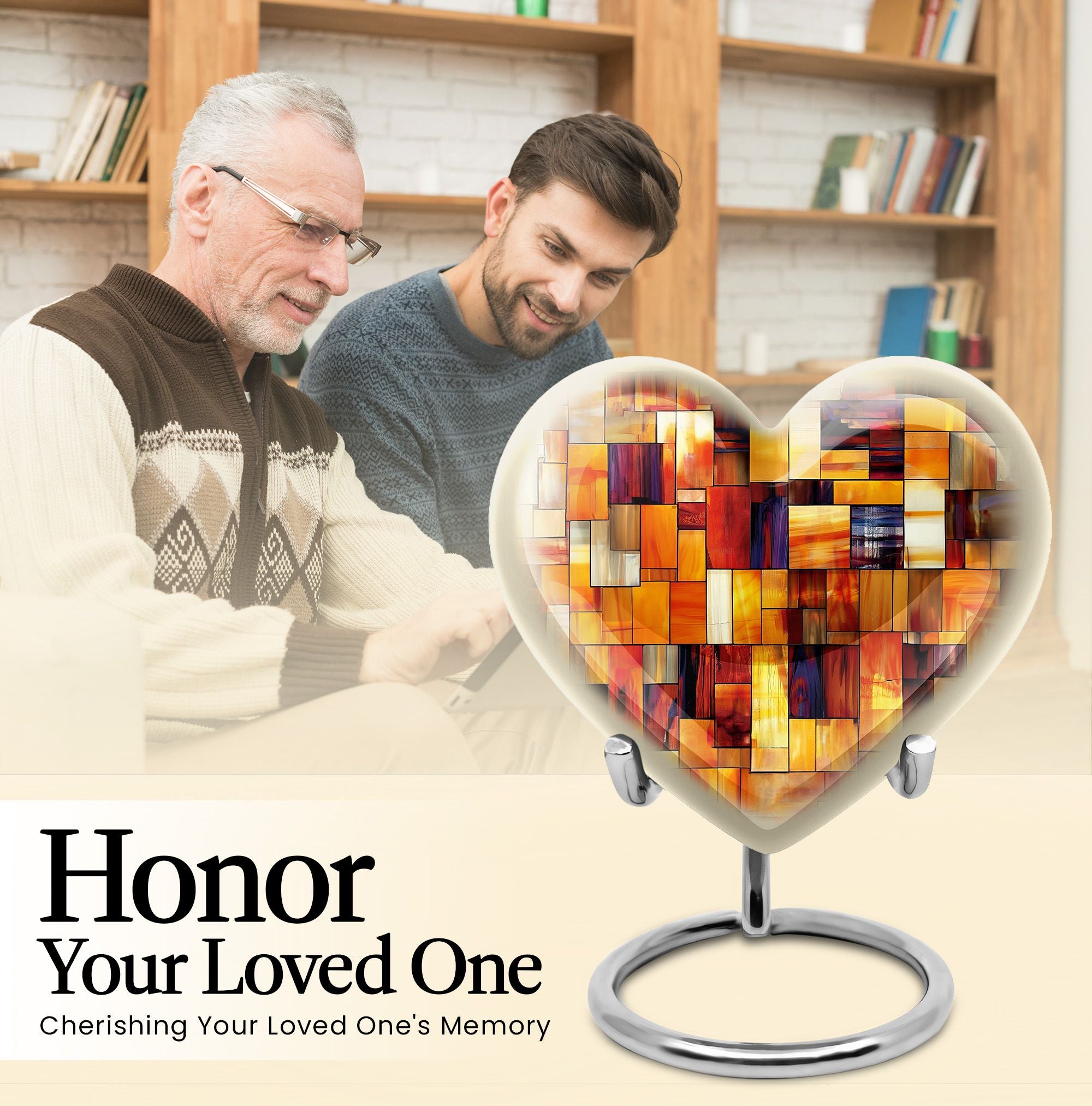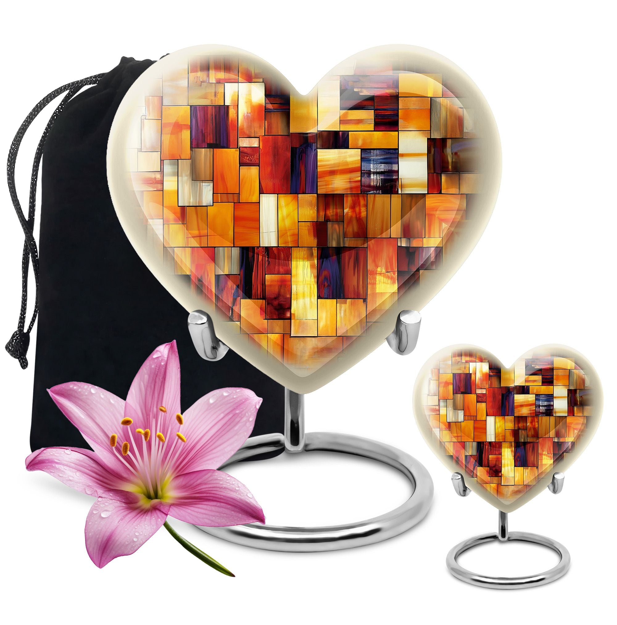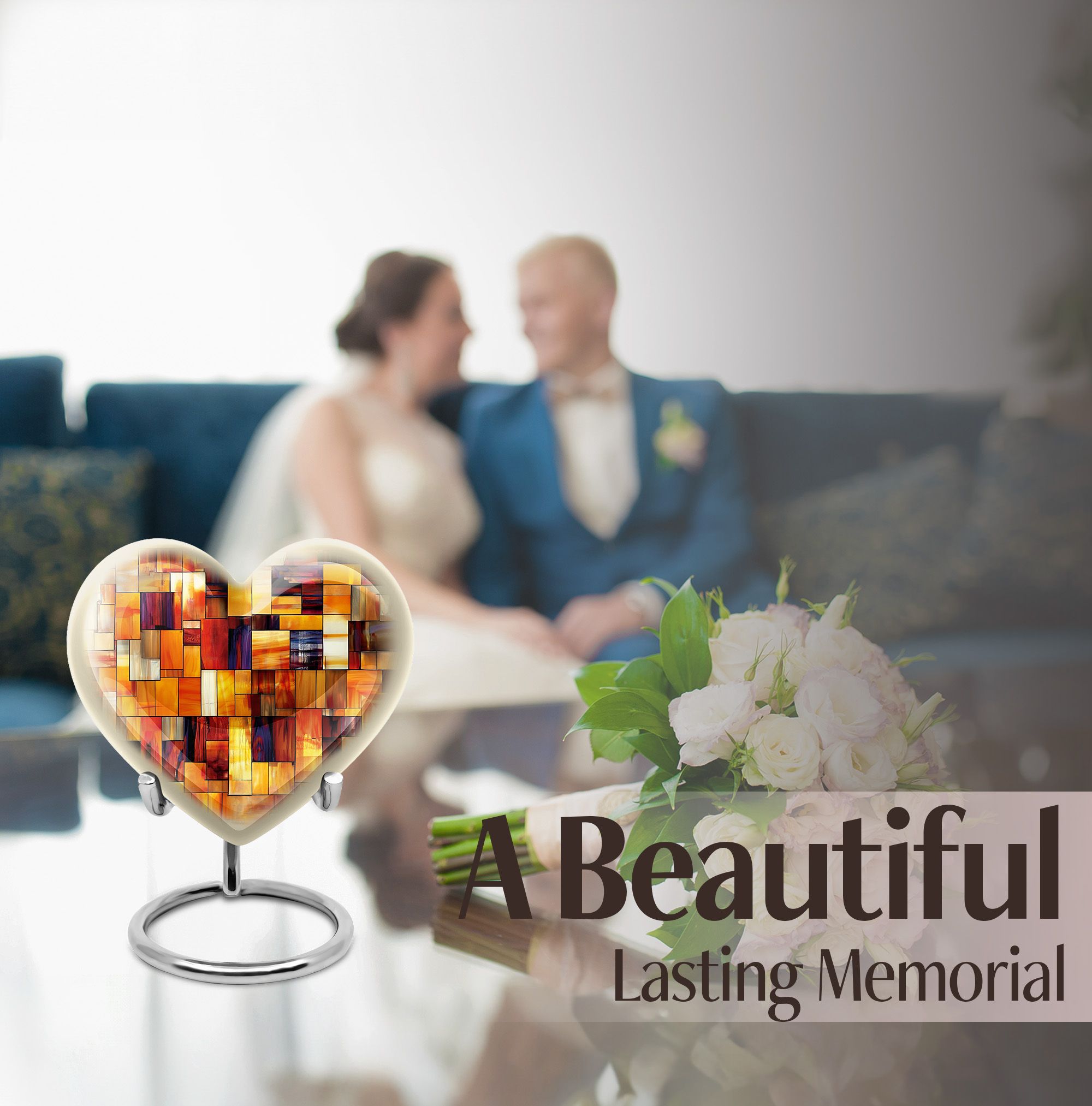 Captivate your cherished memories in our uniquely crafted, heart-shaped stained glass Urn. This funeral decorative urn offers a touching tribute to your departed loved ones. With its substantial size of 10 inches and a weight of 3.3 pounds, it effortlessly holds up to 200 cubic inches of ashes. The urn comes tastefully packaged with a complementary velvet pouch for safe and respectful containment of ashes. Crafted from durable aluminium, it provides a lasting memorial. The urn is extensively customizable, allowing you to personalize it with engraved names for a truly unique tribute. Whether you're seeking 'Memorial urns for human ashes adult female,' 'urn human adult male,' or 'urns for cremation ashes mother', this large urn fulfills these requirements impeccably. Reverently honour your fallen loved one today with our heartfelt stained glass Urn, a moving embodiment of timeless respect and love.