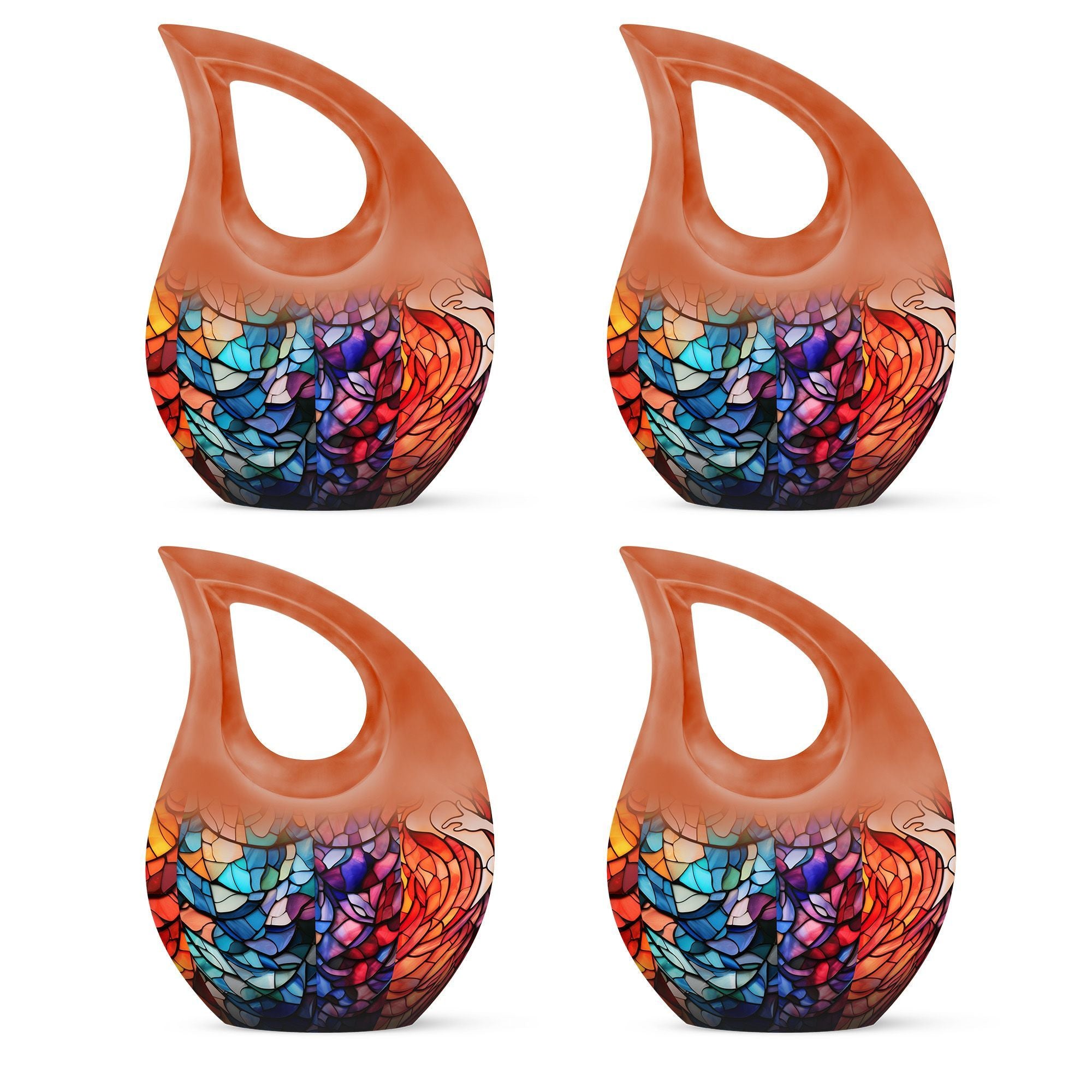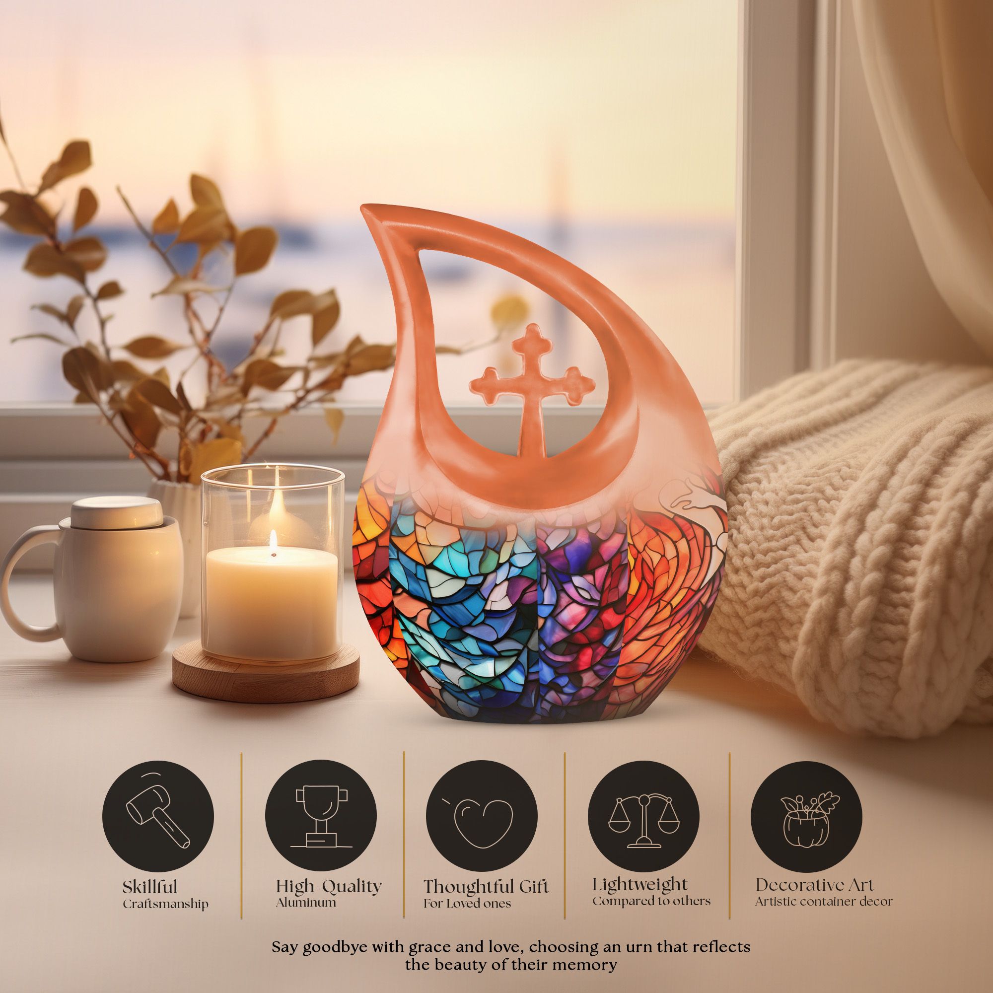 Crafted with meticulous detail, this adult cremation urn features a radiant stained-glass pattern that glows with hues of amber, blue, and gold. Made from high-quality aluminum, it’s both durable and refined, ideal for home display or ceremony use. Available as part of a cremation urns set or cremation ashes urns combo, it pairs beautifully with matching cremation mini urn keepsakes for family members to share in remembrance.