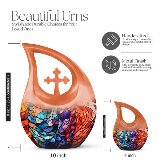Our Stained Glass Urns collection captures the elegance and artistry of traditional stained glass—through stunning printed or engraved designs on durable aluminum cremation urns. Though not made from real stained glass, each urn in this collection features a visually rich and colorful stained-glass-inspired motif that brings vibrancy, light, and symbolic meaning to your loved one's final resting place.