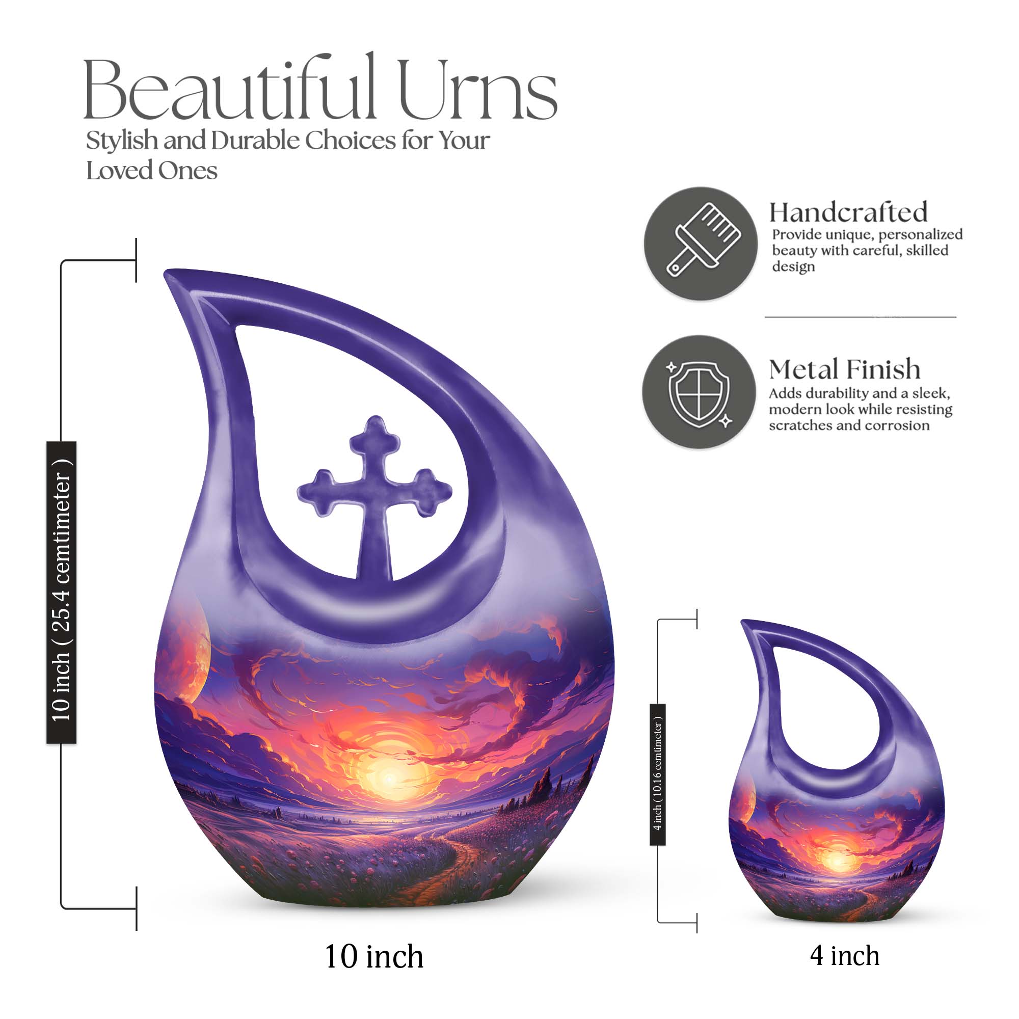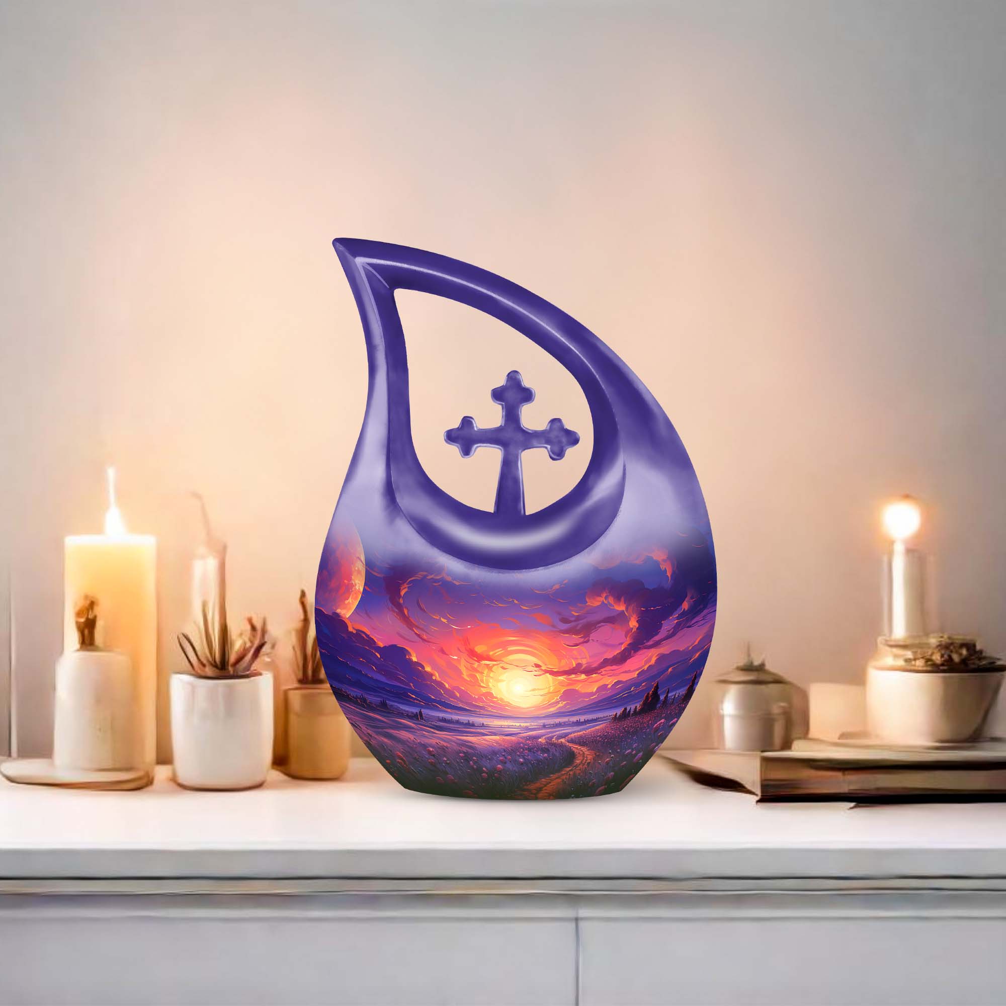 Expertly crafted from durable aluminium, this 10 inch urn features a soothing gradient of purple sunset tones that symbolize peace, transition, and everlasting comfort. With its secure screw-top lid, polished finish, and classic silhouette, it is ideal for families seeking a dependable large adult urn, urn human ashes large, or a refined large decorative urn for human ashes suitable for home display, memorial ceremonies, or burial. Its soft colors make it especially fitting as an urn for ashes for women, yet timeless enough for any loved one.