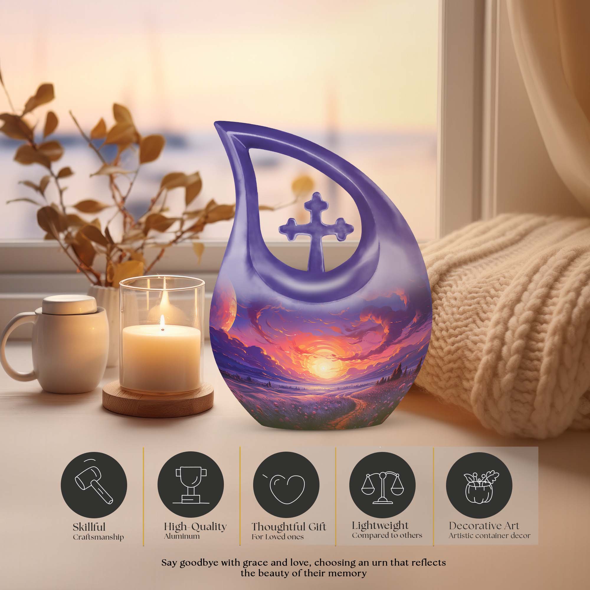 Graceful, comforting, and symbolic, the Purple Sunset urn helps preserve precious memories while keeping the presence of Mom, Dad, or a cherished loved one close.
