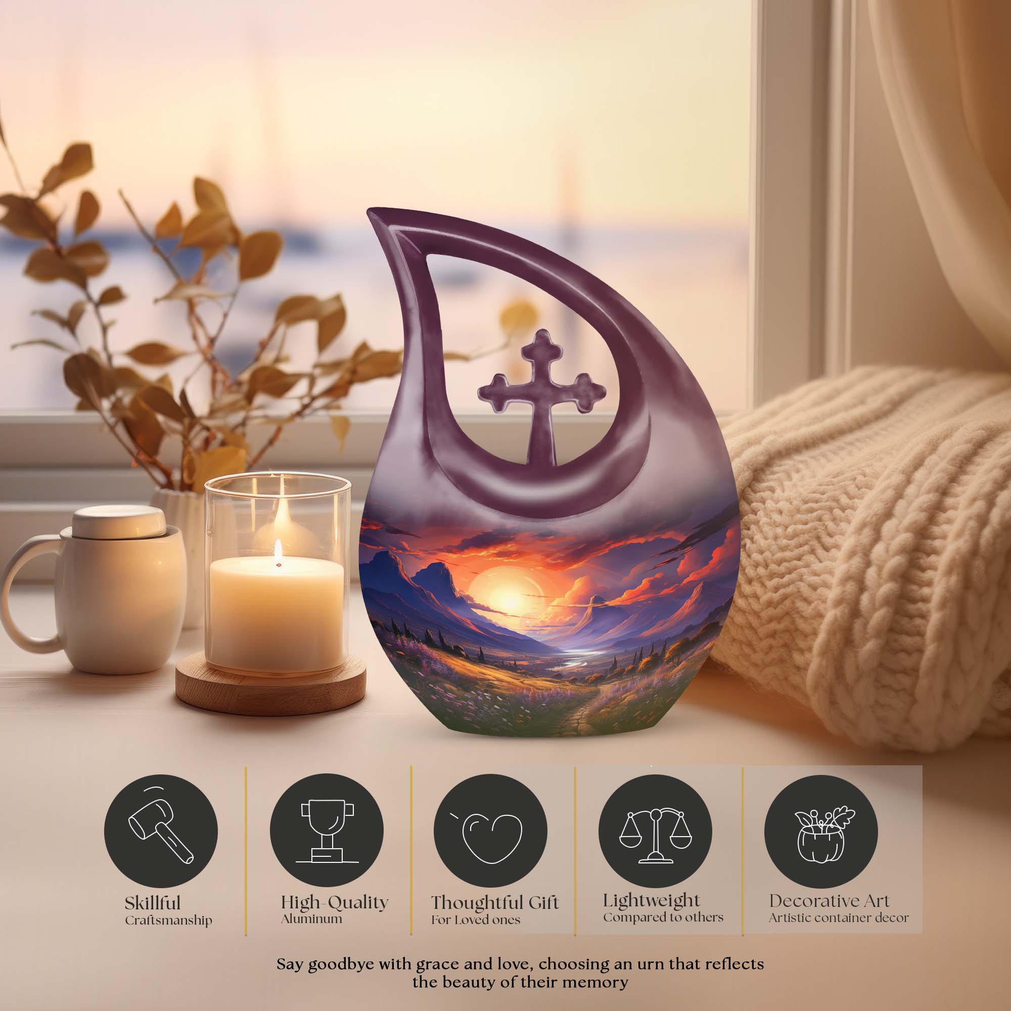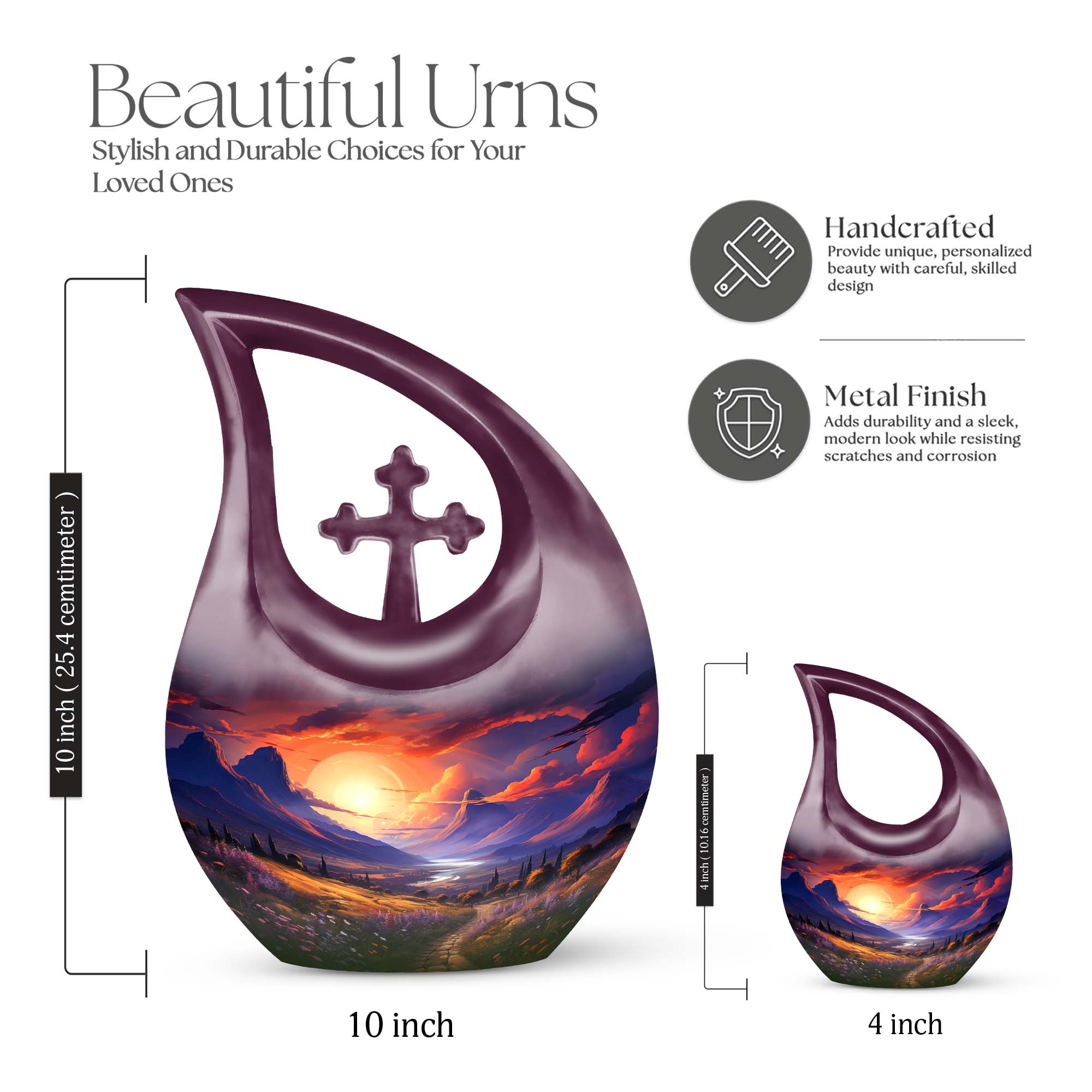 Carefully crafted from durable aluminium, this beautifully finished keepsake features sunset-inspired colors that symbolize peace, transition, and everlasting light. Though compact, it complements larger memorial pieces, including a coordinating 10 inch urn, giving families the option to create a unified remembrance set. With its secure screw-top lid and smooth design, it serves as an elegant small decorative urn or a thoughtful small urns for human ashes keepsake memorial for sharing ashes.