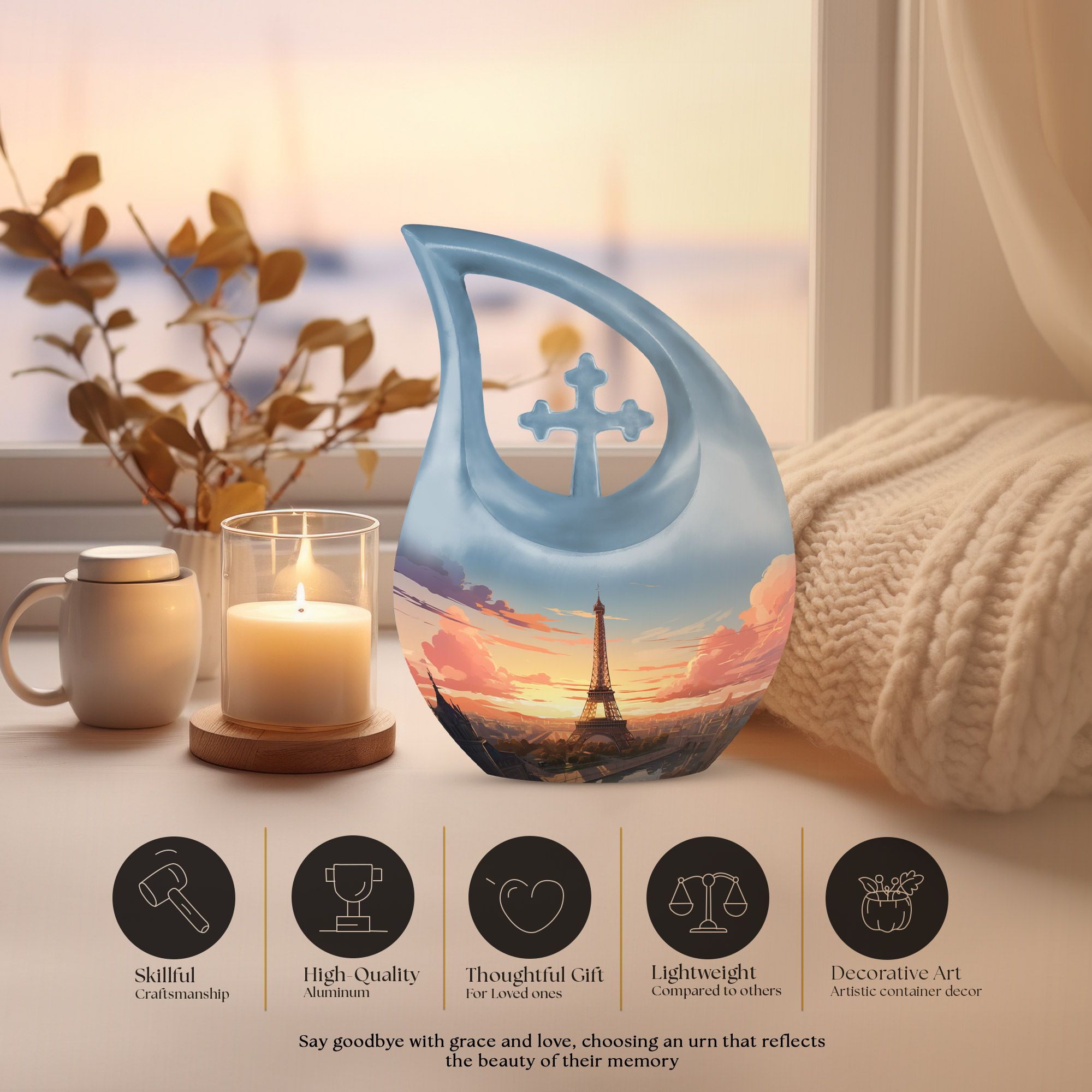 Expertly handcrafted, this urn embodies superior artistry and enduring beauty. The smooth aluminum body features a breathtaking Eiffel Tower design against a serene sunset backdrop, symbolizing peace and eternal connection. Ideal for Urns For Ashes Adult Male Small or Urn For Human Ashes Adult Female, its secure screw-top lid ensures that your loved one’s remains are kept safe. This versatile piece is suitable for display at home or for ceremonial remembrance.