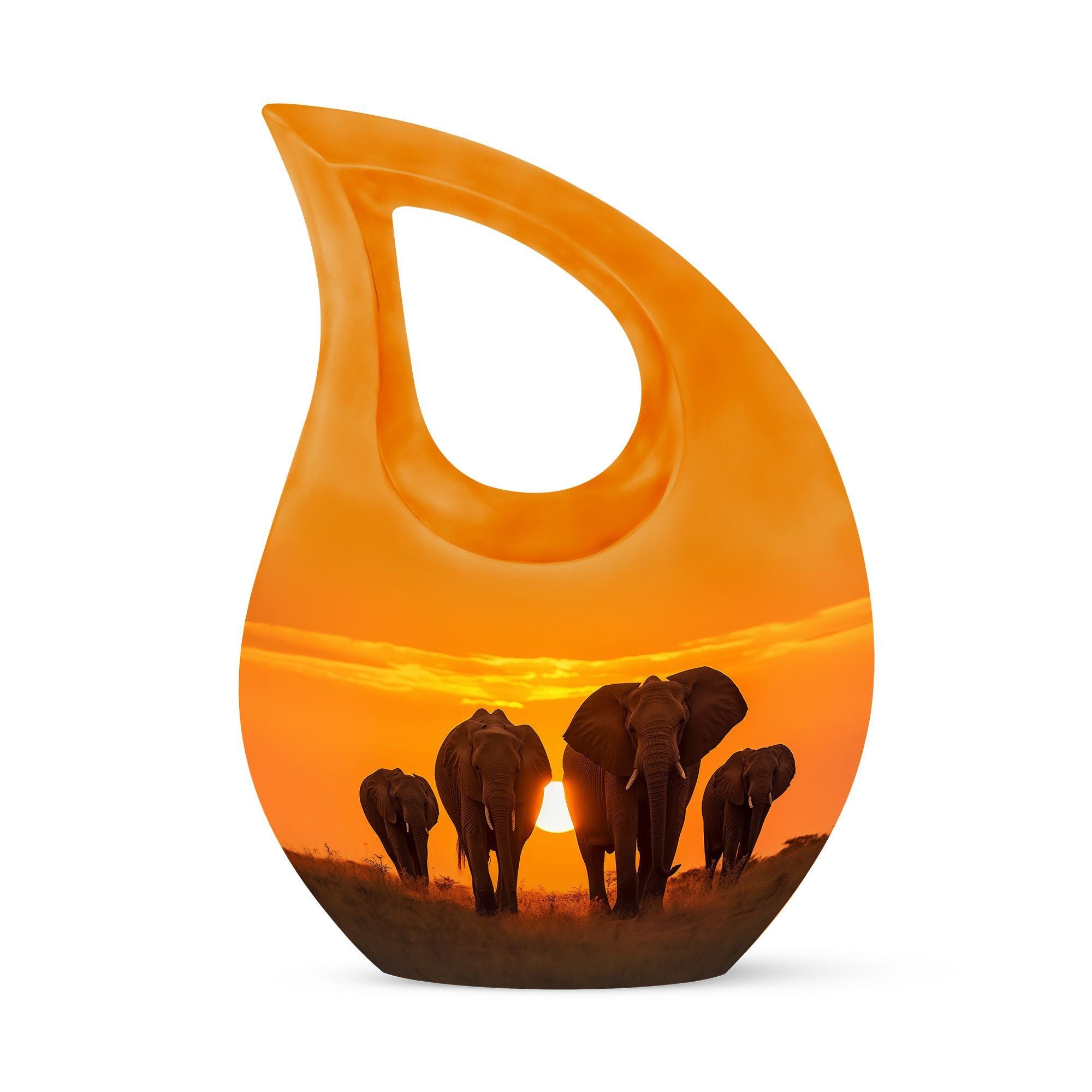 Celebrate a life well-lived with the Elephant Family Sunset Themed Urn — a touching symbol of love, unity, and eternal togetherness. Designed to hold the ashes of your beloved, this adult large urn represents both strength and serenity. It’s a heartfelt way to honor memories and provide a lasting resting place through a stunning display of craftsmanship and compassion.