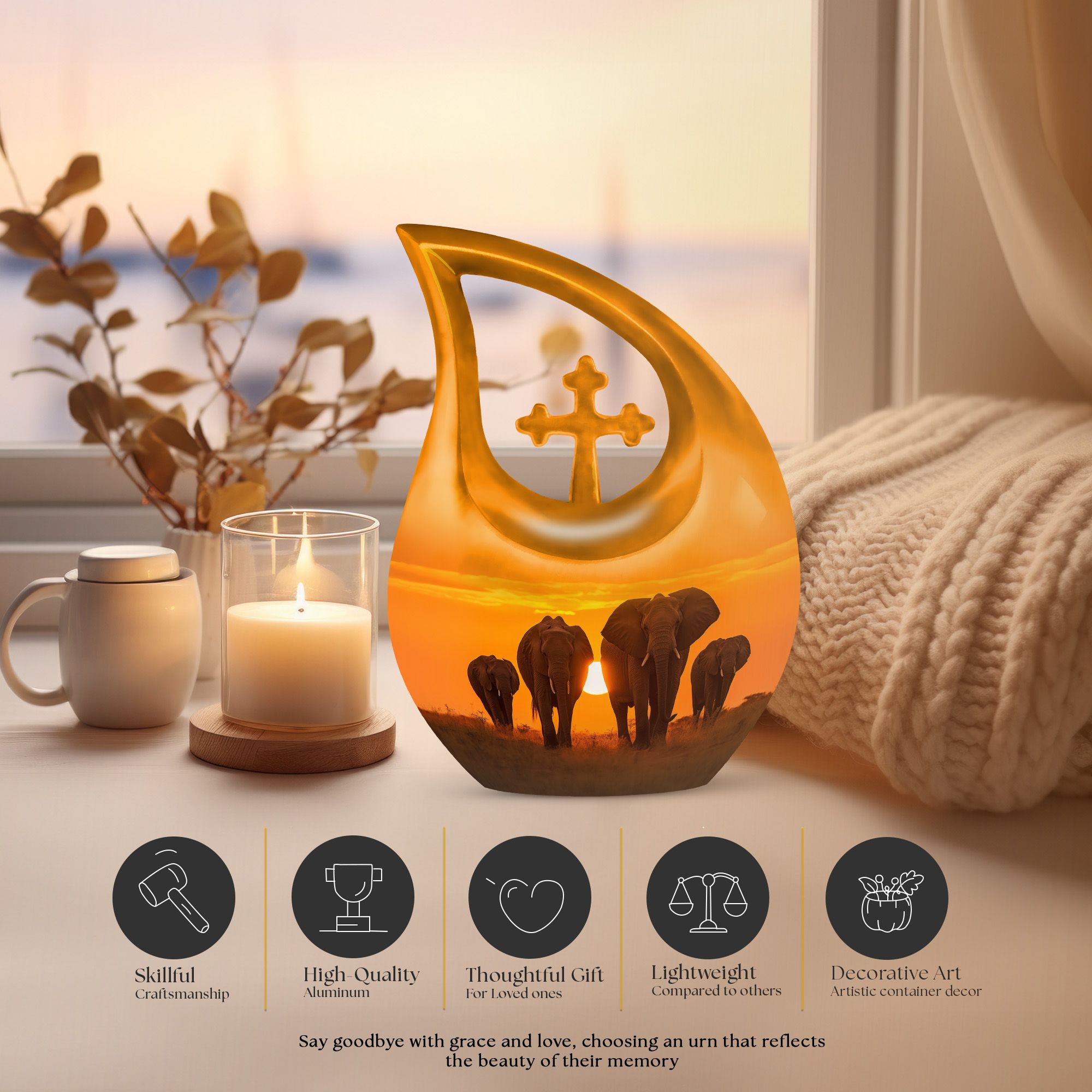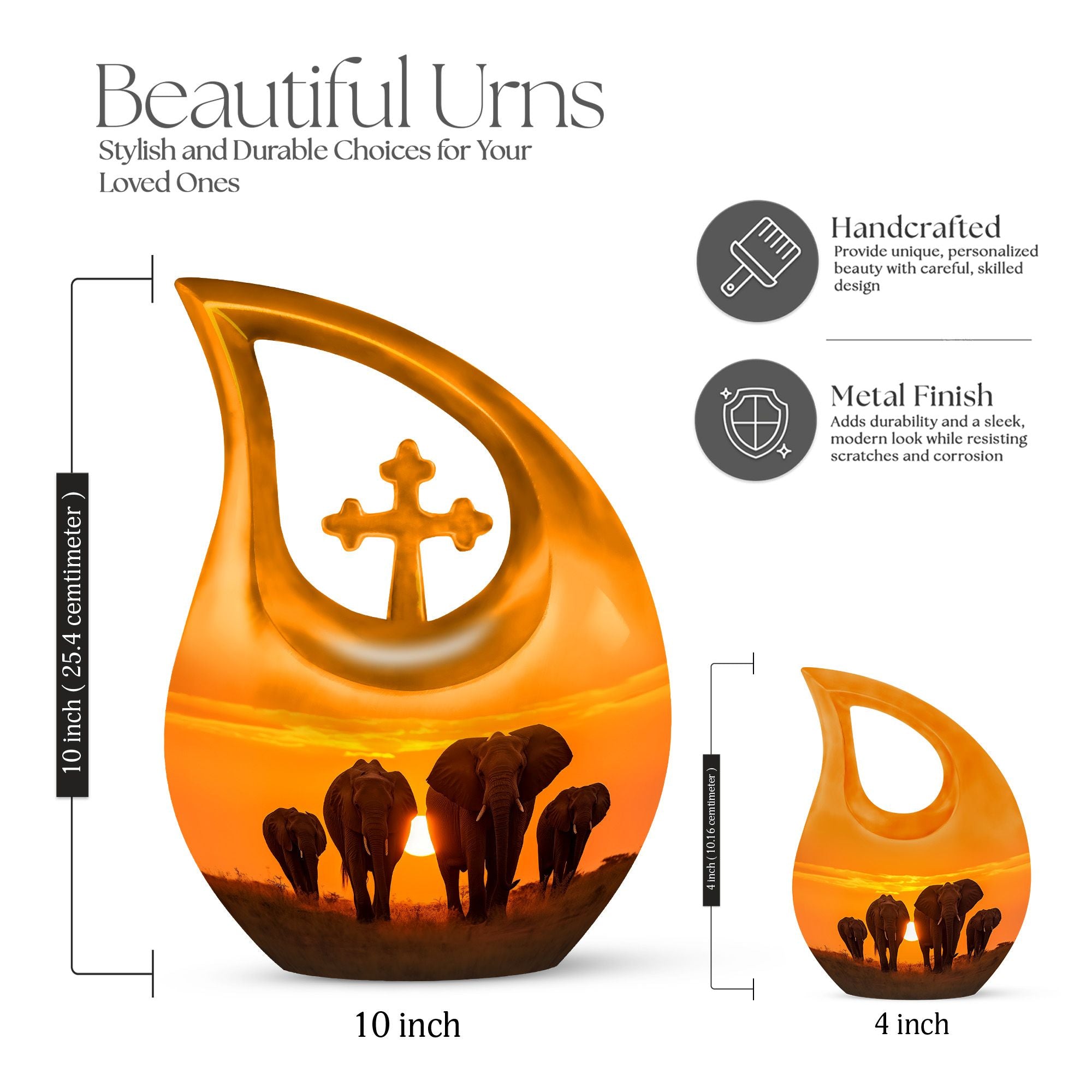 Expertly handcrafted from durable aluminum, this large decorative urn showcases a mesmerizing sunset backdrop featuring a majestic elephant family walking together, symbolizing loyalty and eternal bonds. The urn’s fine detailing and warm tones make it one of the most meaningful large urns for human ashes available. Its smooth finish and high-quality polish ensure both beauty and longevity, making it ideal for display in your home or as part of a memorial ceremony.