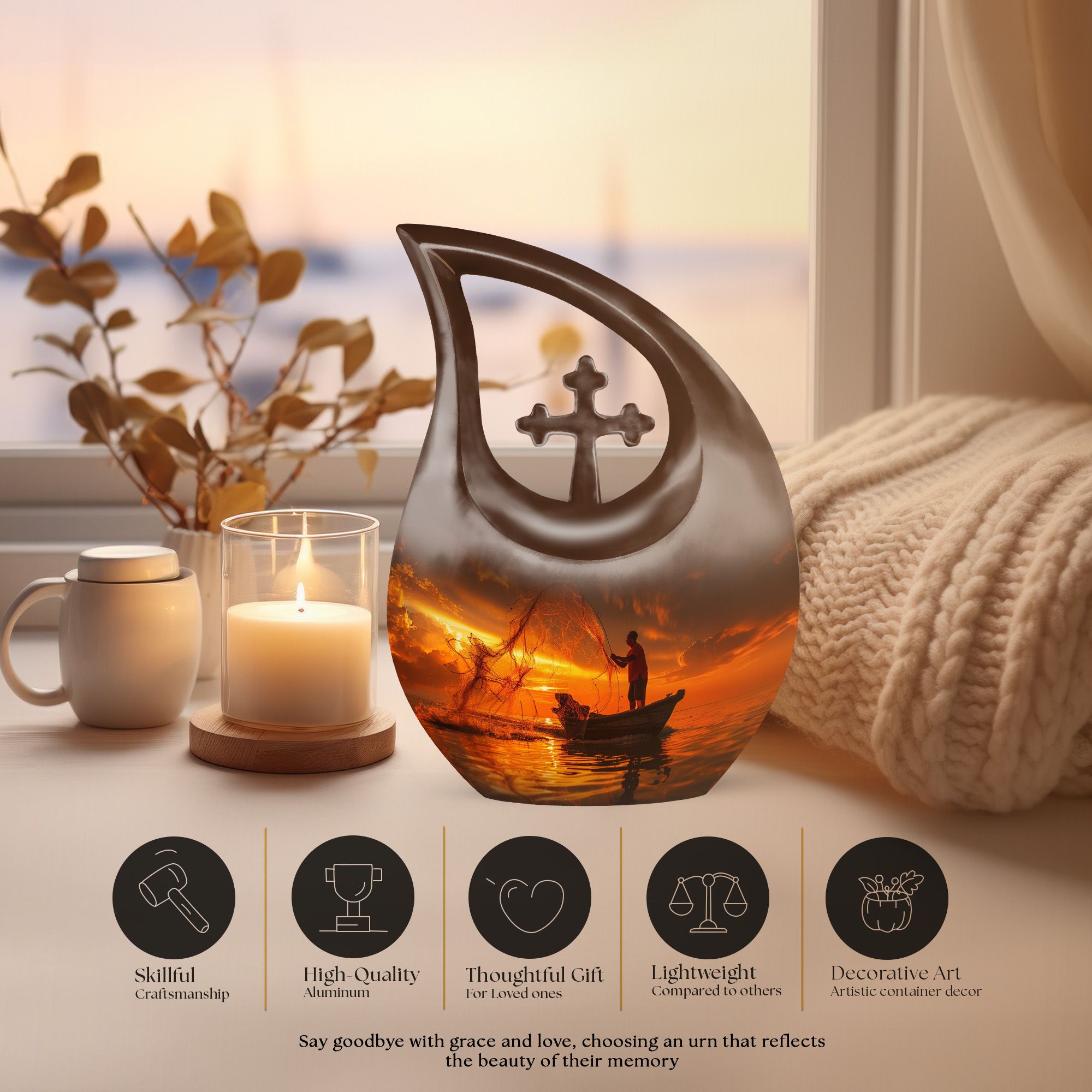 Crafted from durable aluminium, this urn showcases a vivid sunset fishing scene that symbolizes tranquility, reflection, and a life well lived. Its secure construction and polished finish make it a dependable choice for cremation burial urns or cremation urns for burial in ground, offering both beauty and long-lasting protection. The generous size and elegant artwork make it suitable for home display or formal burial ceremonies.