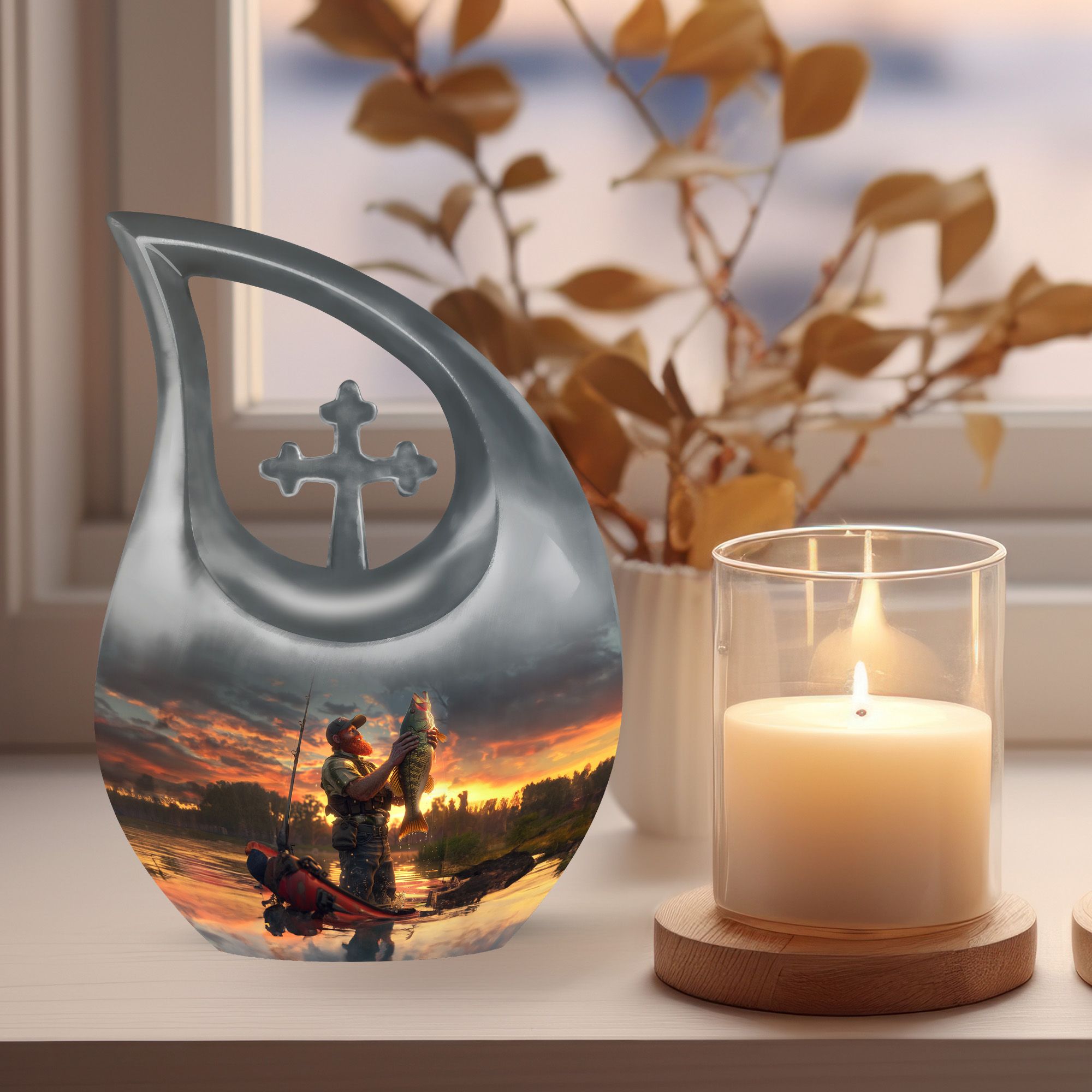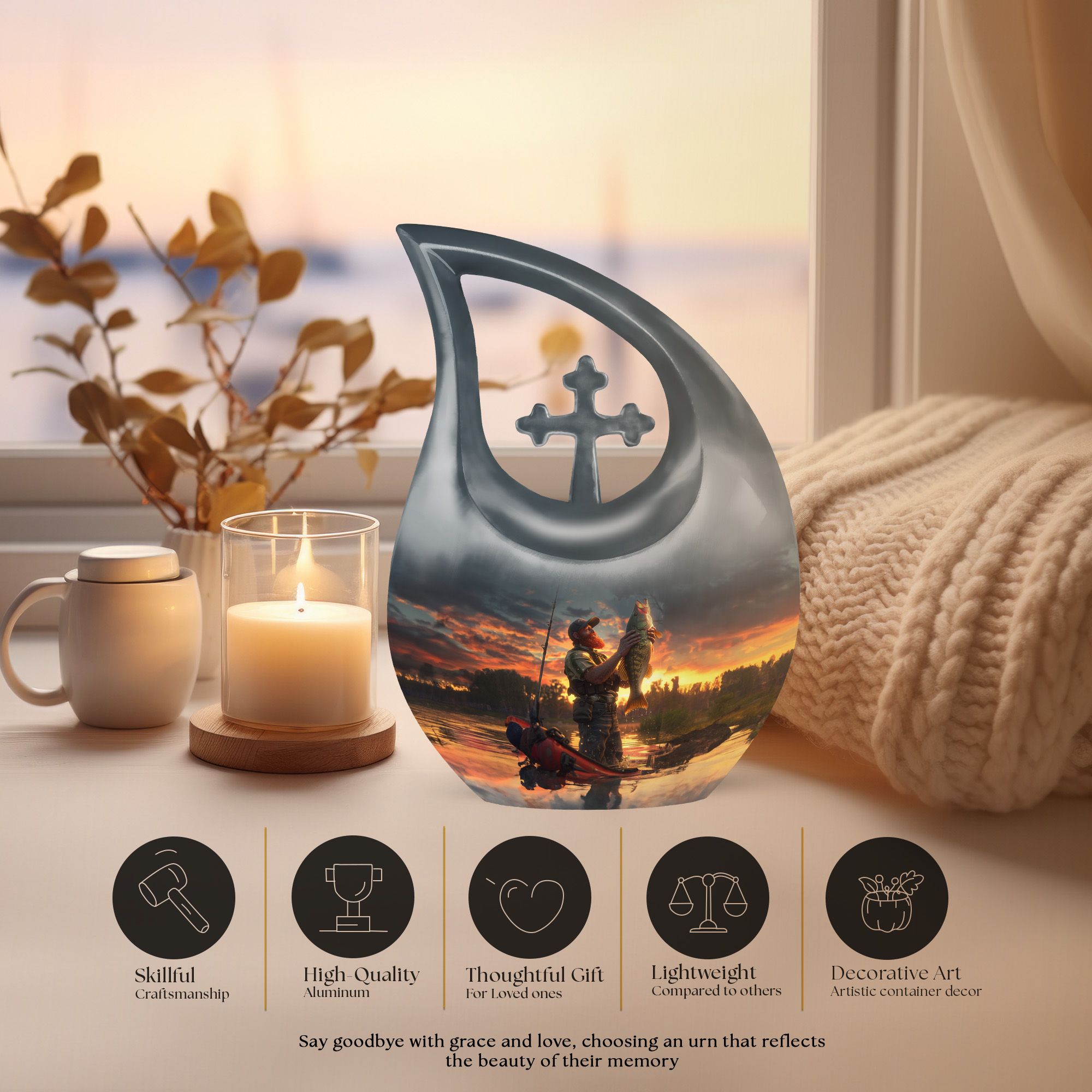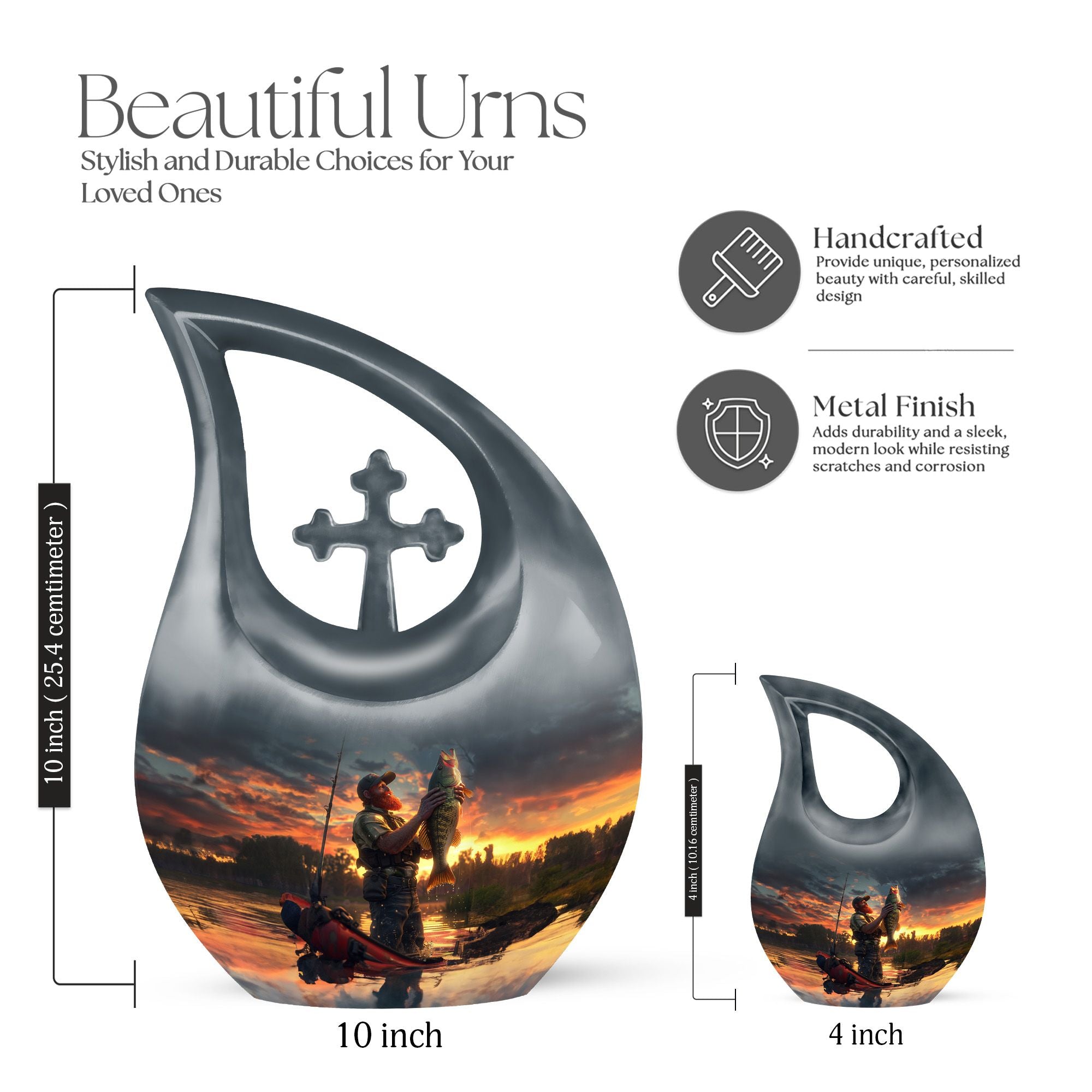 Expertly crafted from durable aluminum, this urn features a warm sunset backdrop with a fisherman proudly holding his catch—symbolizing accomplishment, serenity, and the beauty of a life well-lived. Ideal for those needing urns for human ashes large, a cremation urn adult large, or large cremation urns for human ashes, its secure screw-top lid keeps ashes protected while offering a visually striking tribute. With a full 200-cu-in capacity, it suits families seeking a large urn for adult ashes, human urns for ashes adult large, or an urn large adult male for Dad.