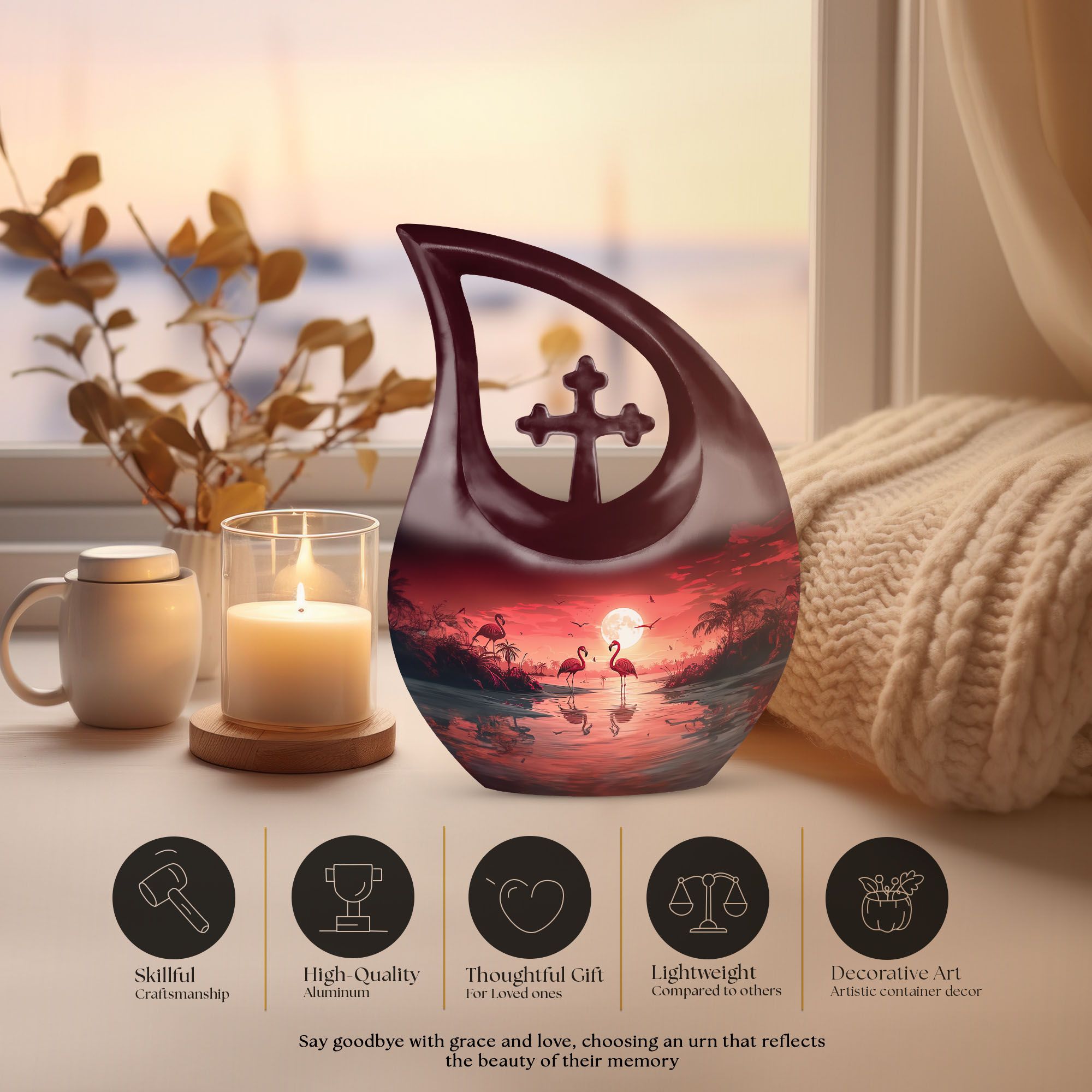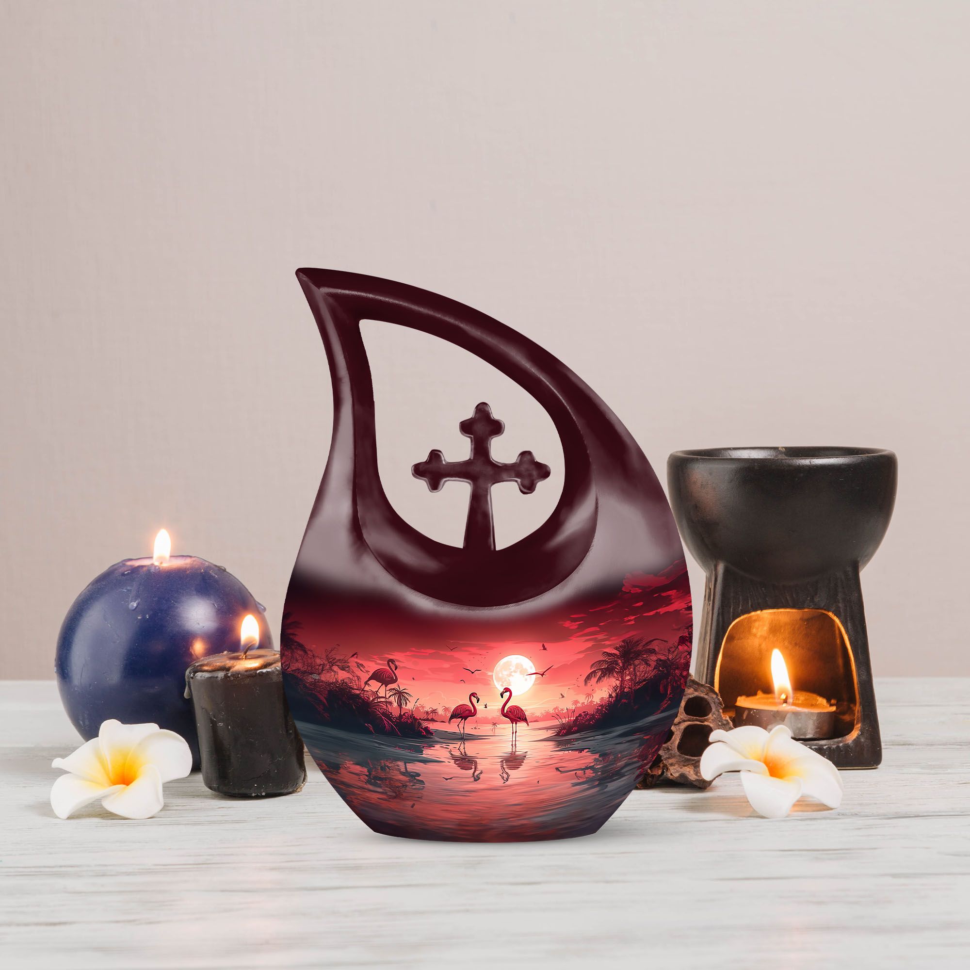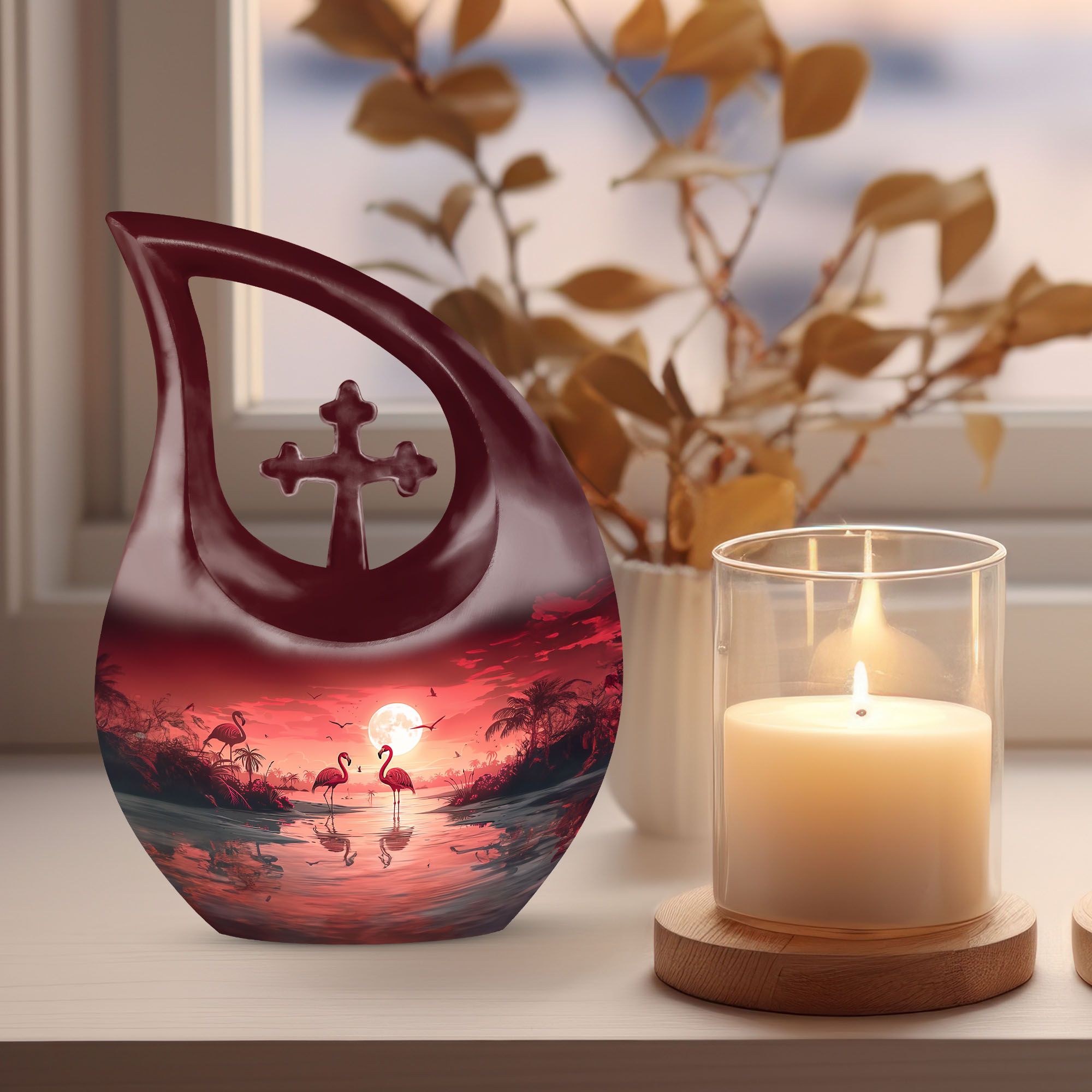 Honor a cherished life with this Flamingo Funeral Urn, a serene sunset-inspired memorial symbolizing peace, grace, and everlasting love. Its warm tones and elegant flamingo artwork make it a meaningful choice for families seeking a large cremation urn, a comforting large urn for adult ashes, or a heartfelt tribute for men, women, and loved ones of any age.