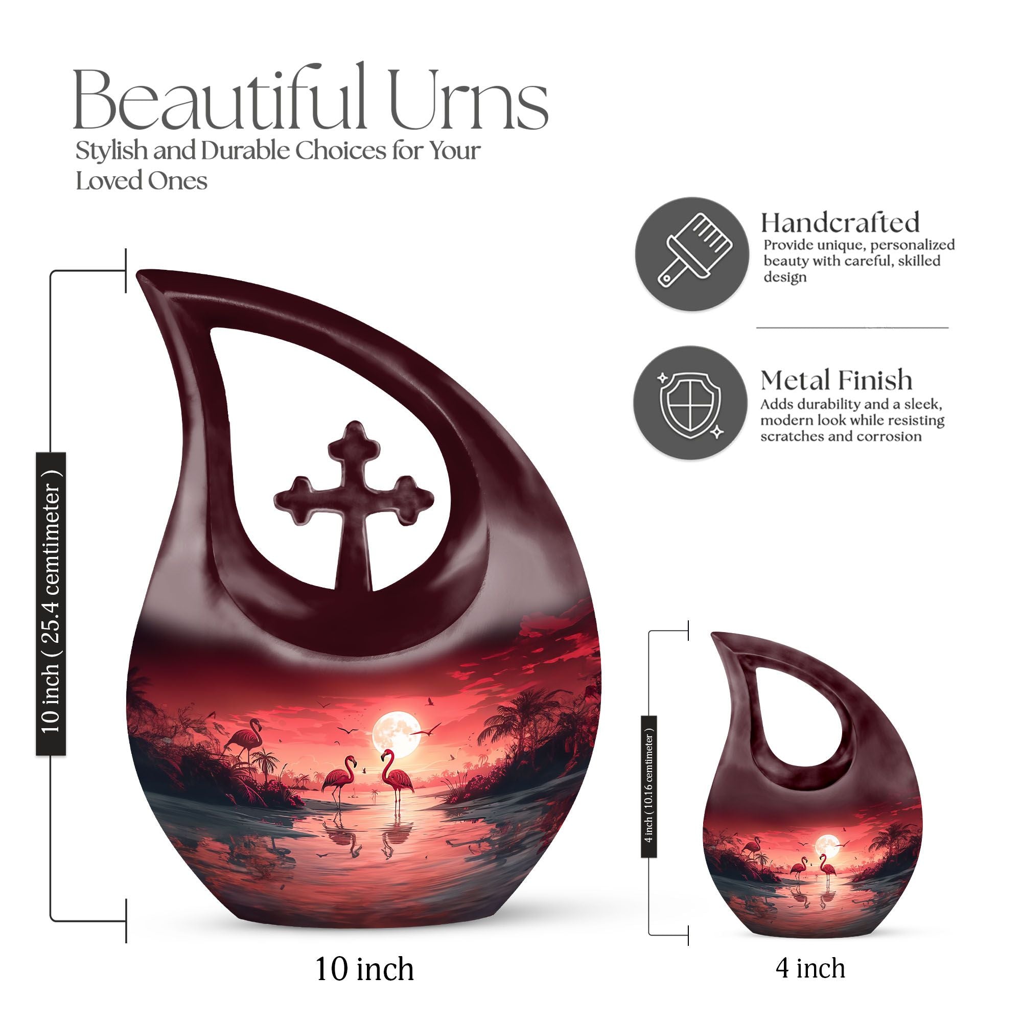 Crafted from durable aluminum, this 10 inch urn features sunset hues blended with a graceful flamingo design representing harmony and healing. Its secure screw-top lid and spacious interior make it ideal for those searching for an urn large adult male, human urns for ashes adult large, adult urns for human ashes large, or beautifully crafted large human urns. Thoughtfully made, it provides long-lasting protection and a beautiful presence in any memorial space.