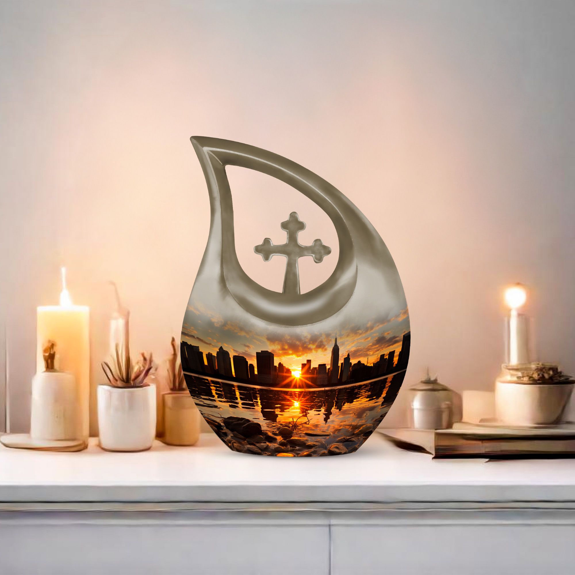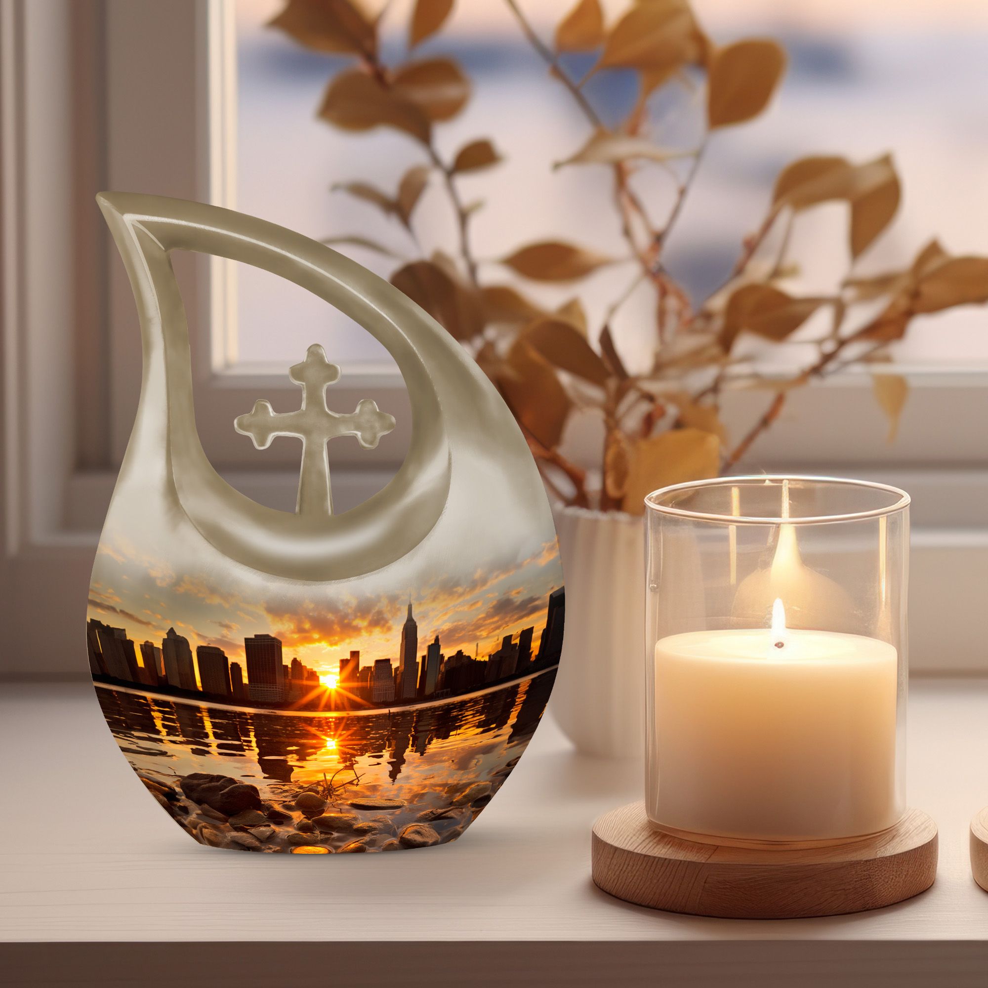The Sunset City Skyline Scenic Urn offers a touching way to honor a cherished life. Designed with love and care, this exquisite piece symbolizes eternal peace beneath a warm evening sky. Ideal for urns adult male dad or funeral urns for adult ashes women, it beautifully preserves memories while providing comfort and dignity to every farewell.