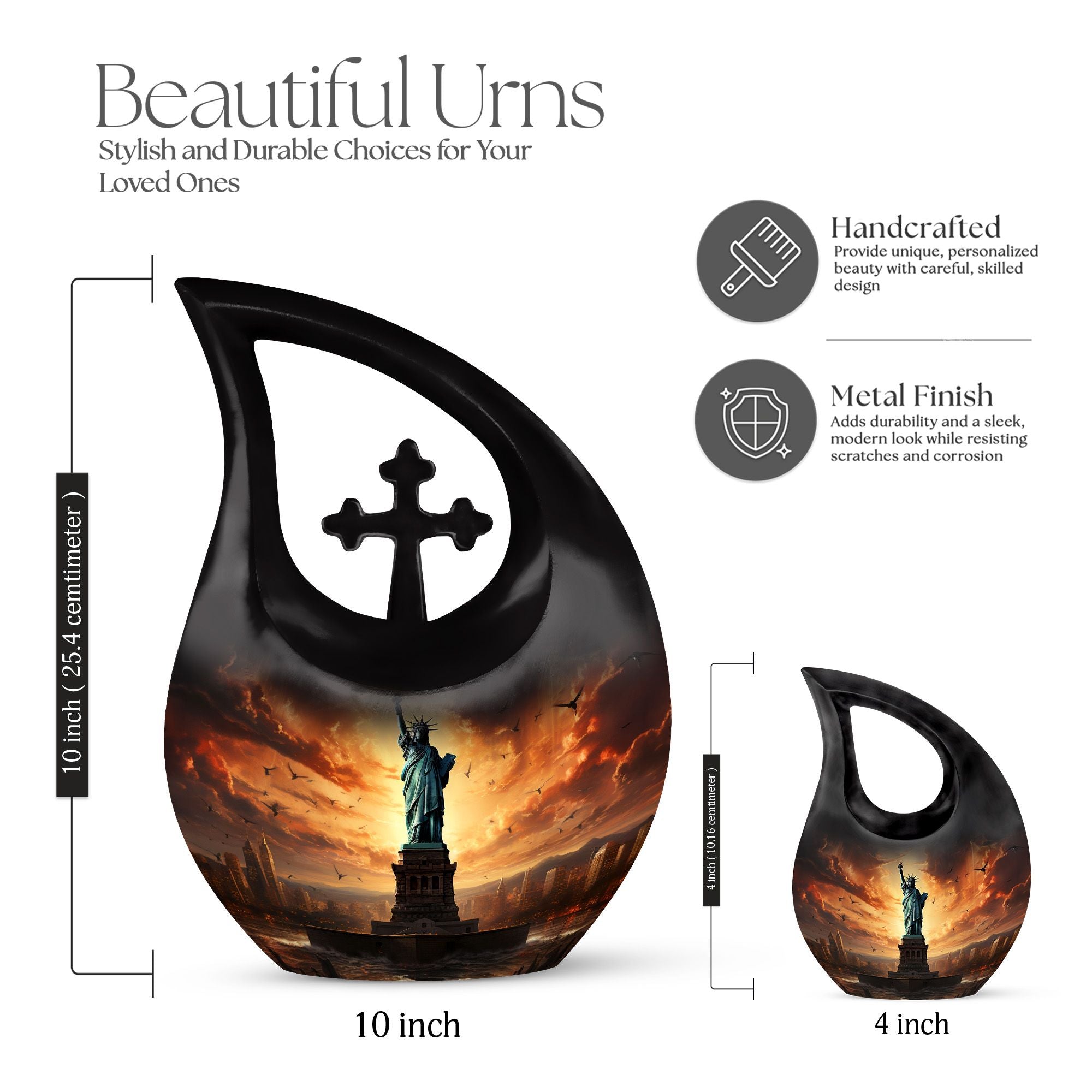 Expertly handcrafted, this urn for human ashes adult male features a breathtaking sunset design that glows with warmth, paired with the iconic Statue of Liberty as a symbol of hope and peace. Made from durable aluminum, it ensures lasting protection for your loved one’s ashes. Its secure screw-top lid and polished surface make it an elegant choice for display, burial, or as a cherished small urn for human ashes adult female keepsake.