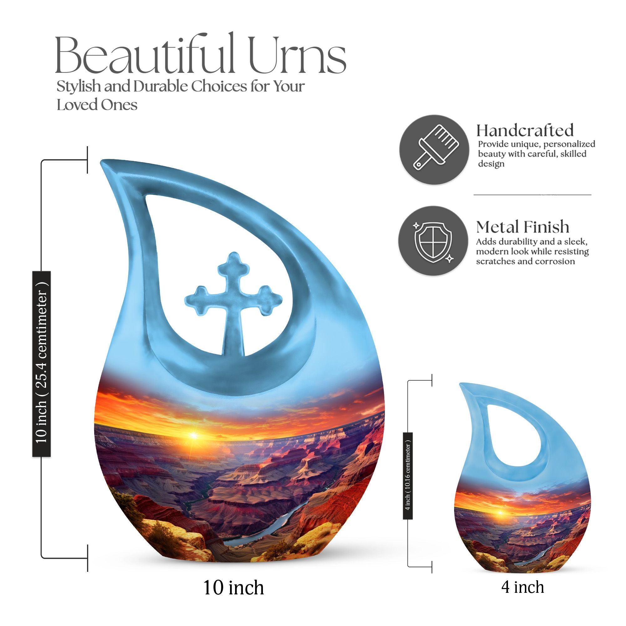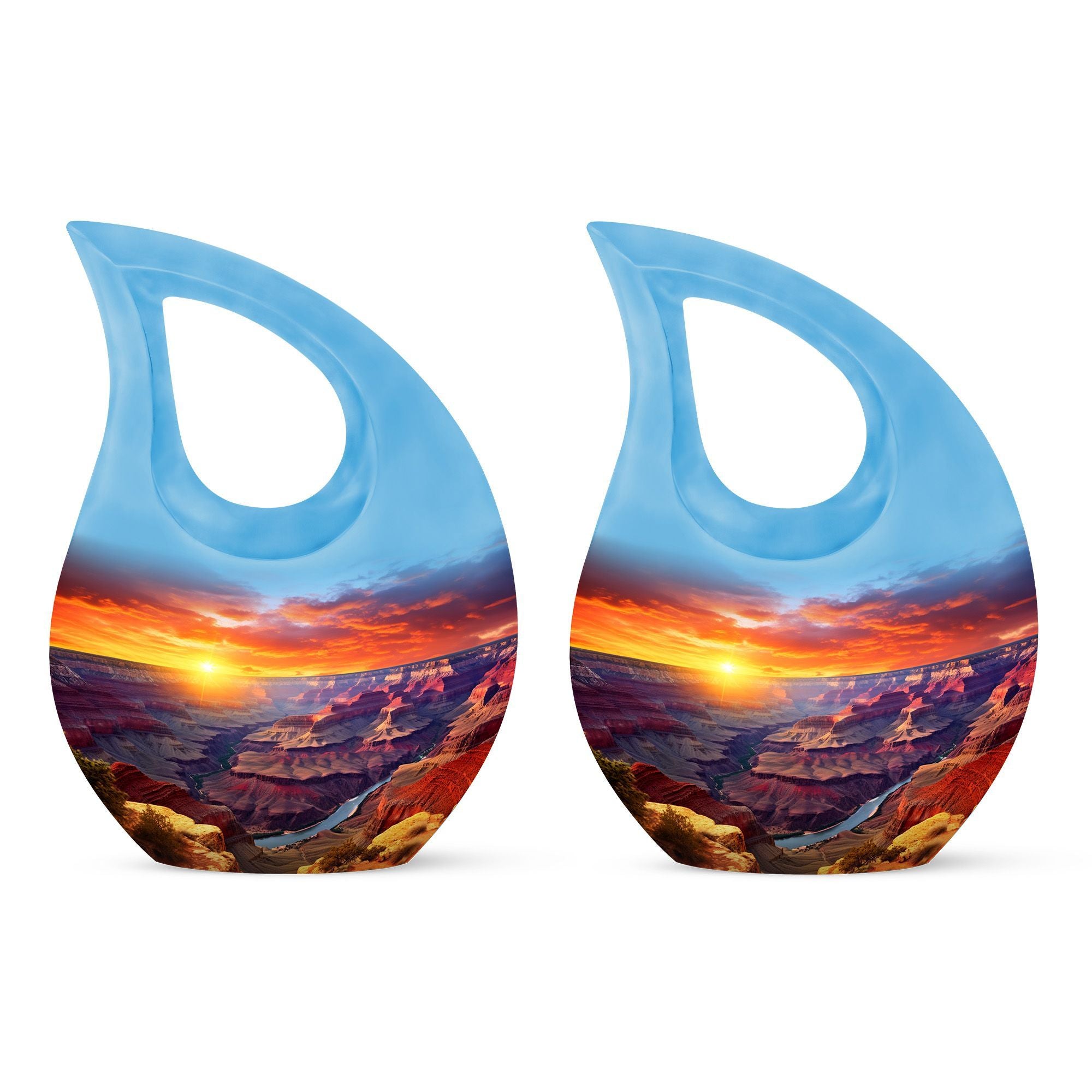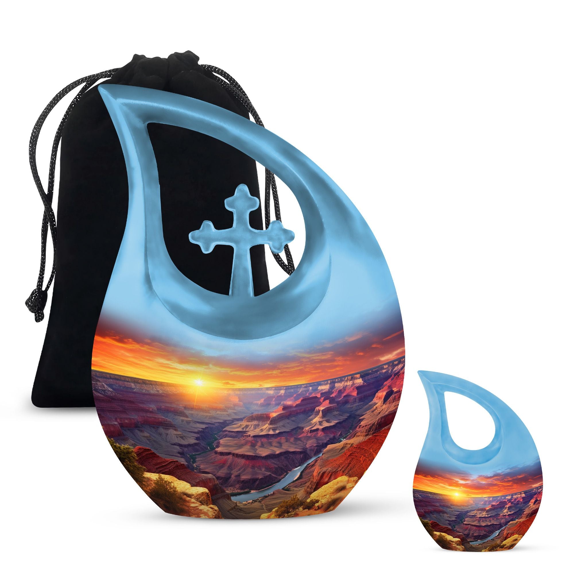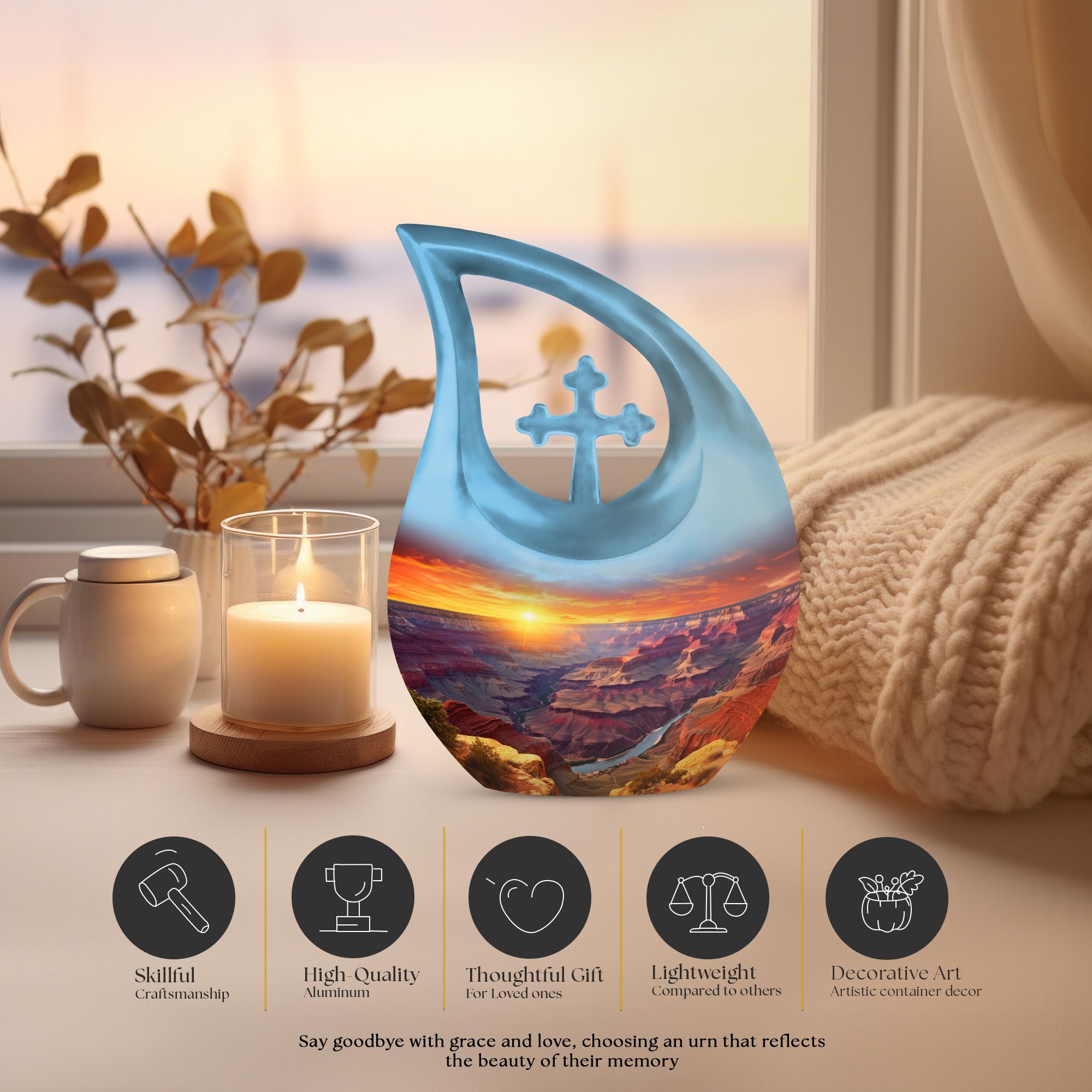 Expertly handcrafted, this large cremation urn features a captivating blend of deep blue and amber hues that mirror the glowing sunset over the Grand Canyon. Made from durable aluminum, it offers both strength and elegance. The smooth finish, secure screw-top lid, and graceful shape make it one of the finest large urns for ashes for women and men alike. Thoughtfully designed for long-term preservation, it provides a meaningful way to safeguard your loved one’s remains.