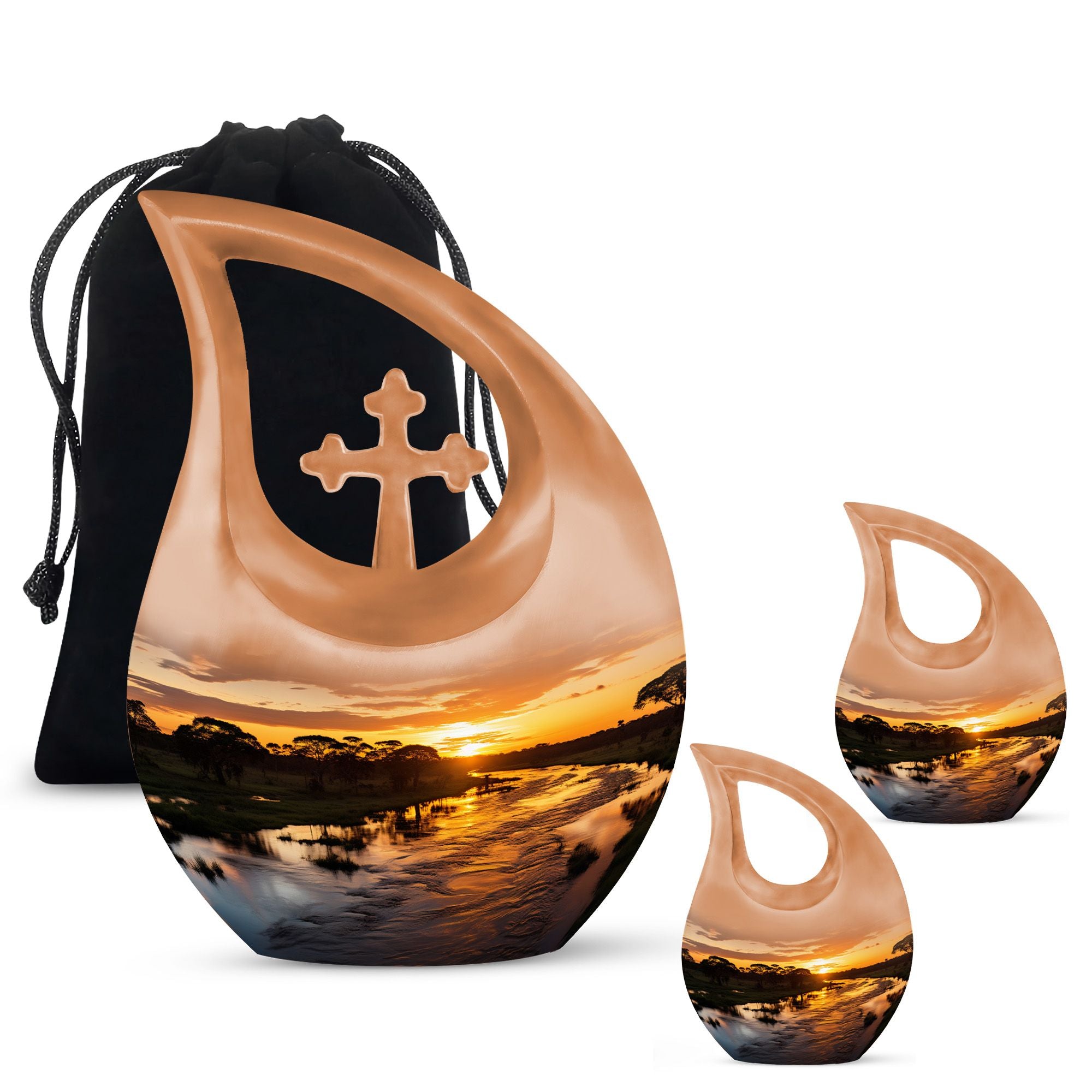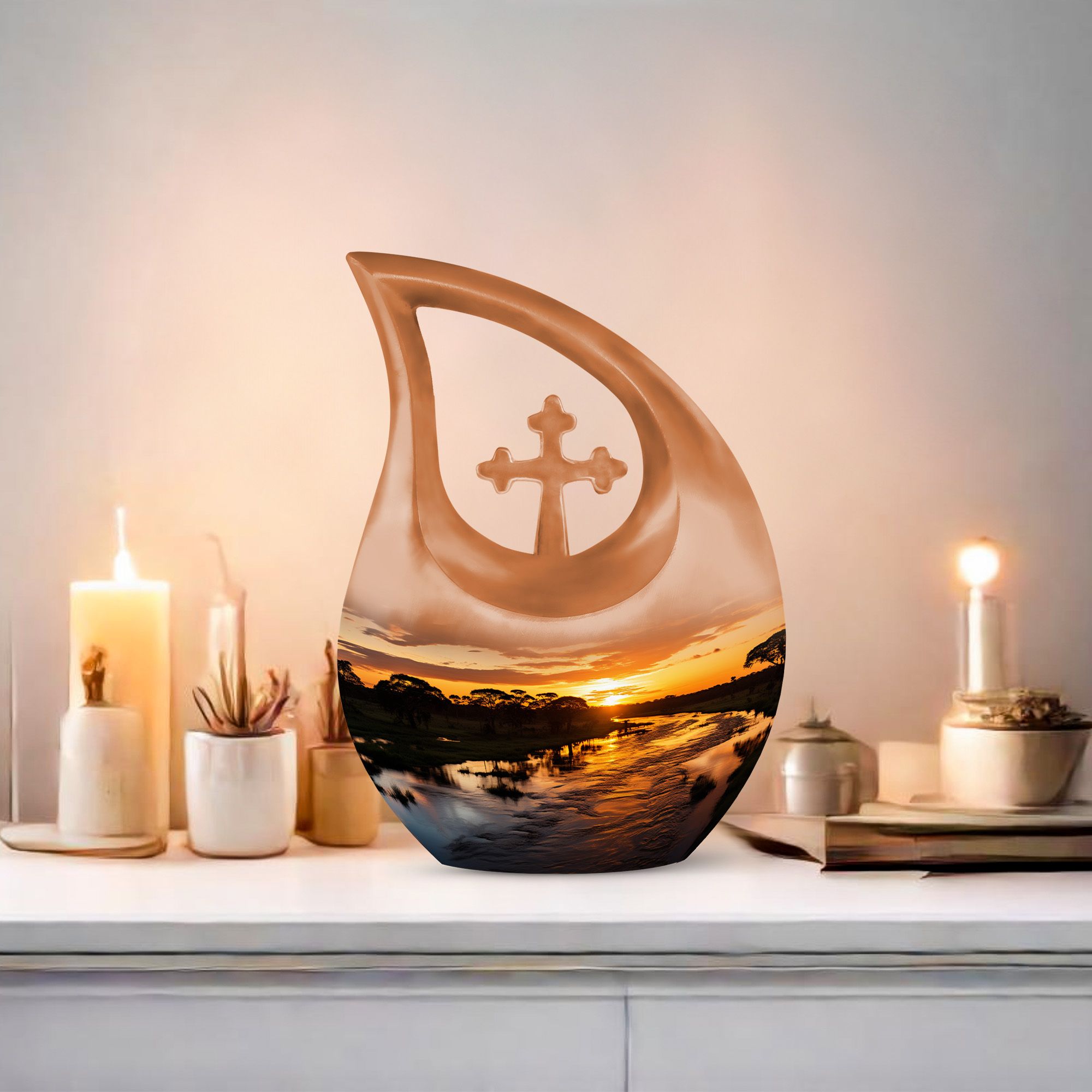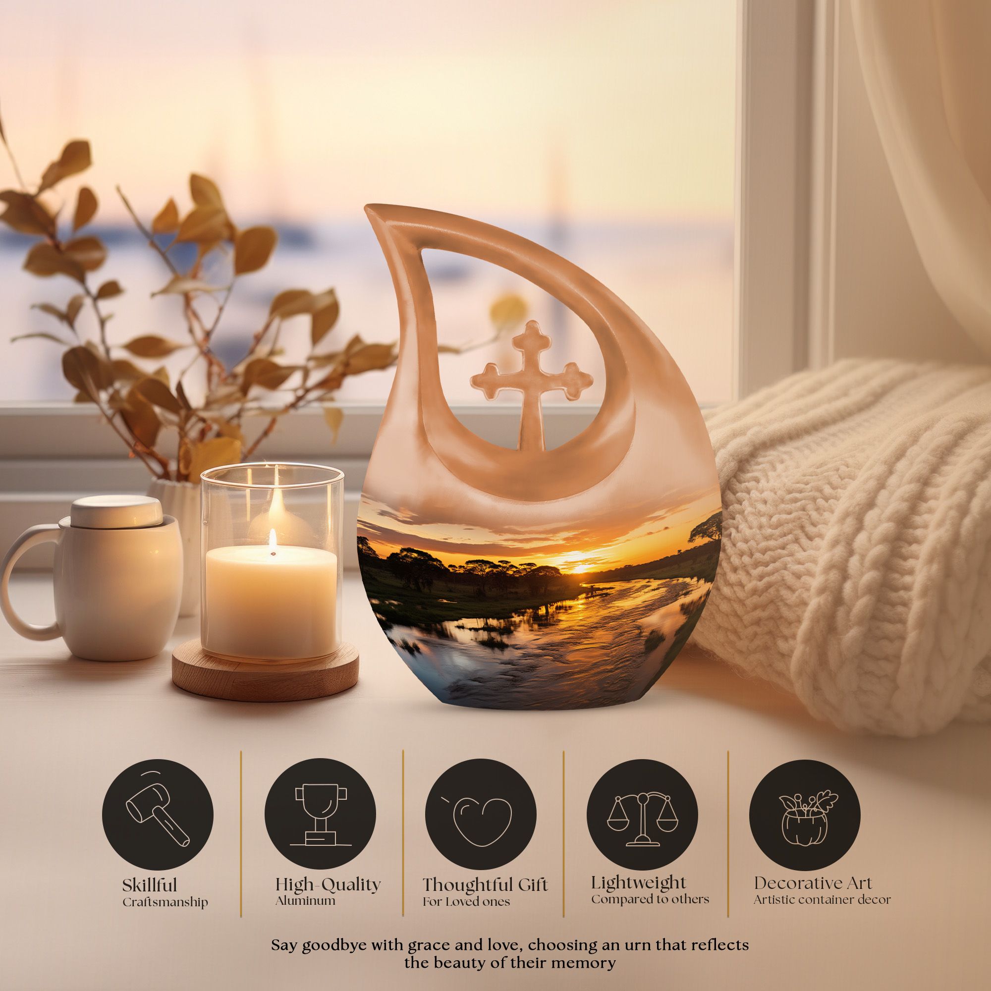 Crafted from durable aluminum, this large adult urn features a radiant sunset landscape with soft river accents, blending artistry with emotional comfort. Its secure screw-top lid provides long-term protection, making it ideal for families needing large human urns, large urn for adult ashes, or adult urns for human ashes large. The generous capacity fits beautifully into memorial displays or burial arrangements while offering a dignified tribute.