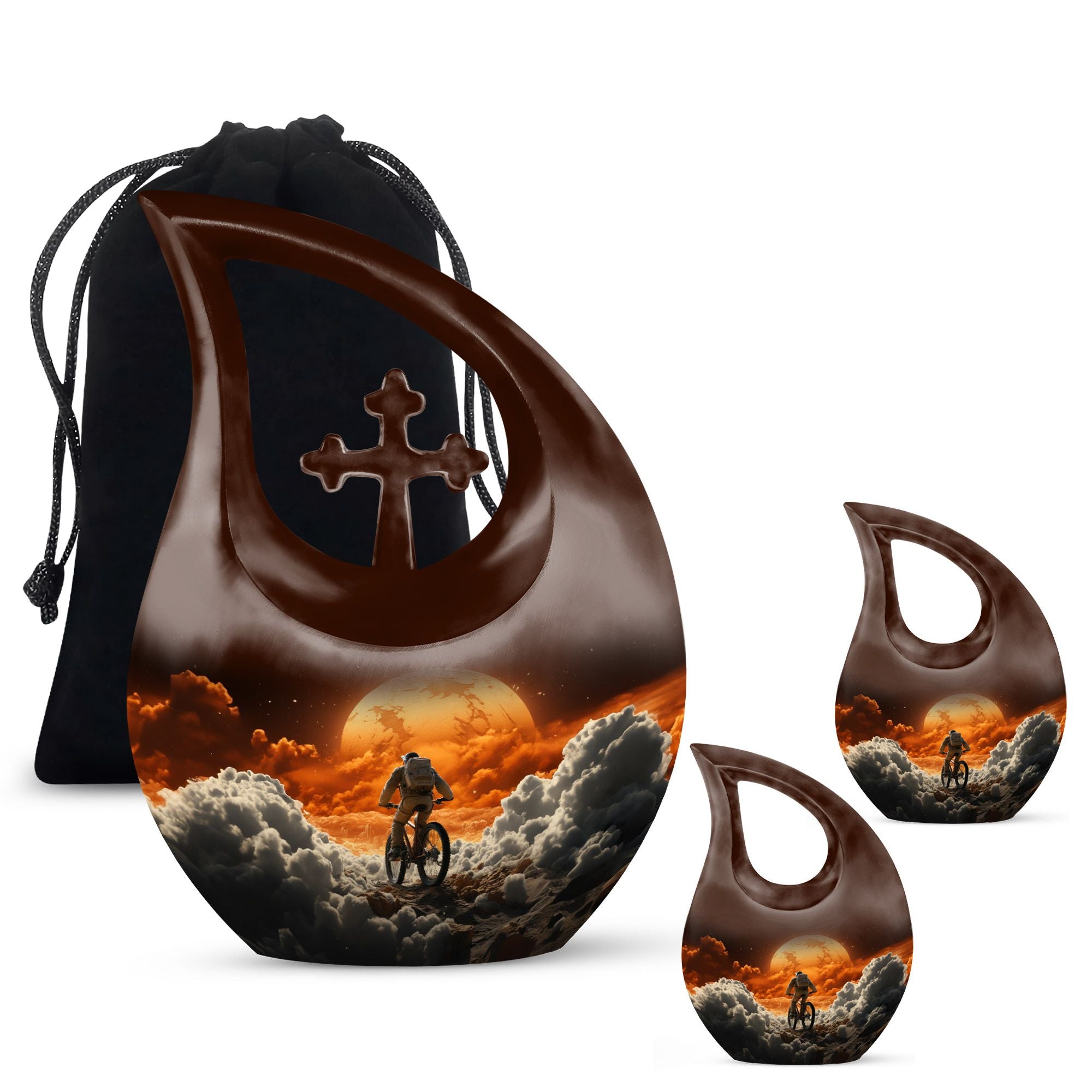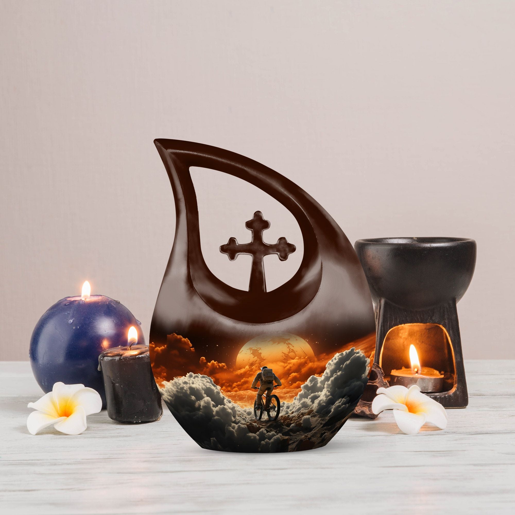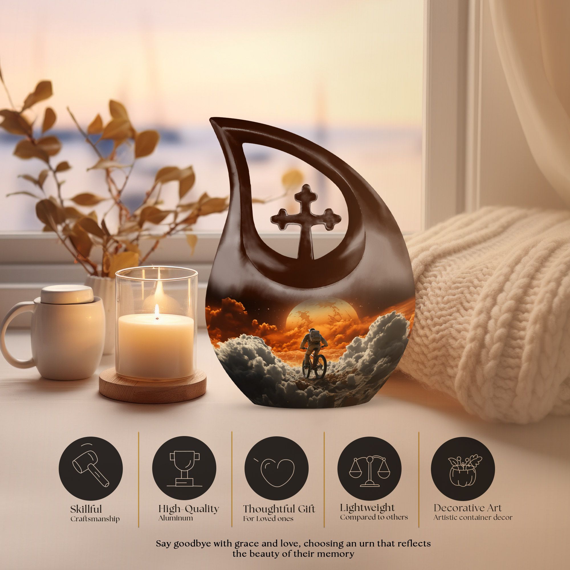 Honor a loved one who embraced the joy of the open road with our Sunset Ride Memorial Urn, a touching tribute designed for those whose spirit was fueled by adventure and motion. This cyclist theme cremation urn for human ashes beautifully captures the essence of a life lived with passion, courage, and love. Perfect for families seeking urns for human ashes adult large or a dignified large urn mom ashes memorial, it symbolizes life’s beautiful journey continuing beyond the horizon.