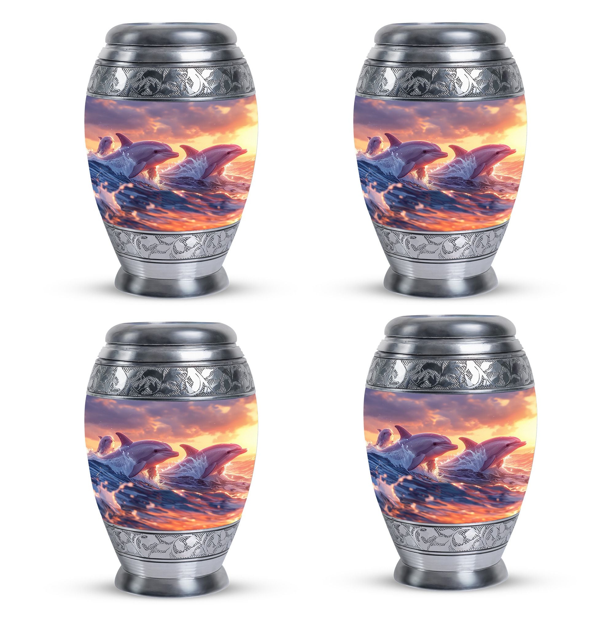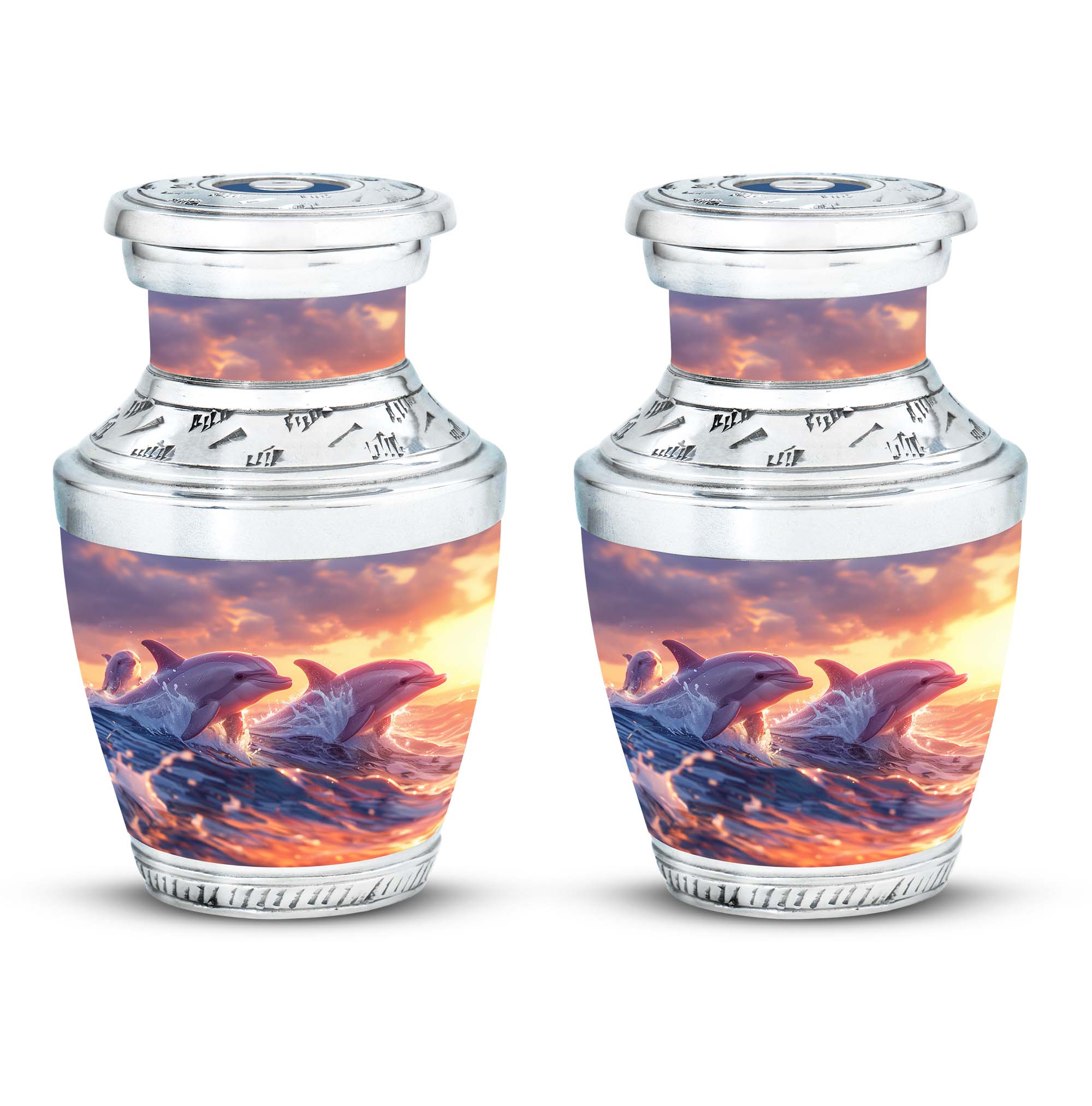 Expertly crafted from durable aluminium, this urn features a stunning sunset background with dolphins in motion, making it one of the most beautiful urns women and men alike will cherish. Suitable as keepsake urns for men ashes, tiny urns for women & men, or small urns women, it offers both elegance and functionality. With its secure screw-top lid and spacious design, it ensures a safe and lasting tribute for your loved one’s ashes.