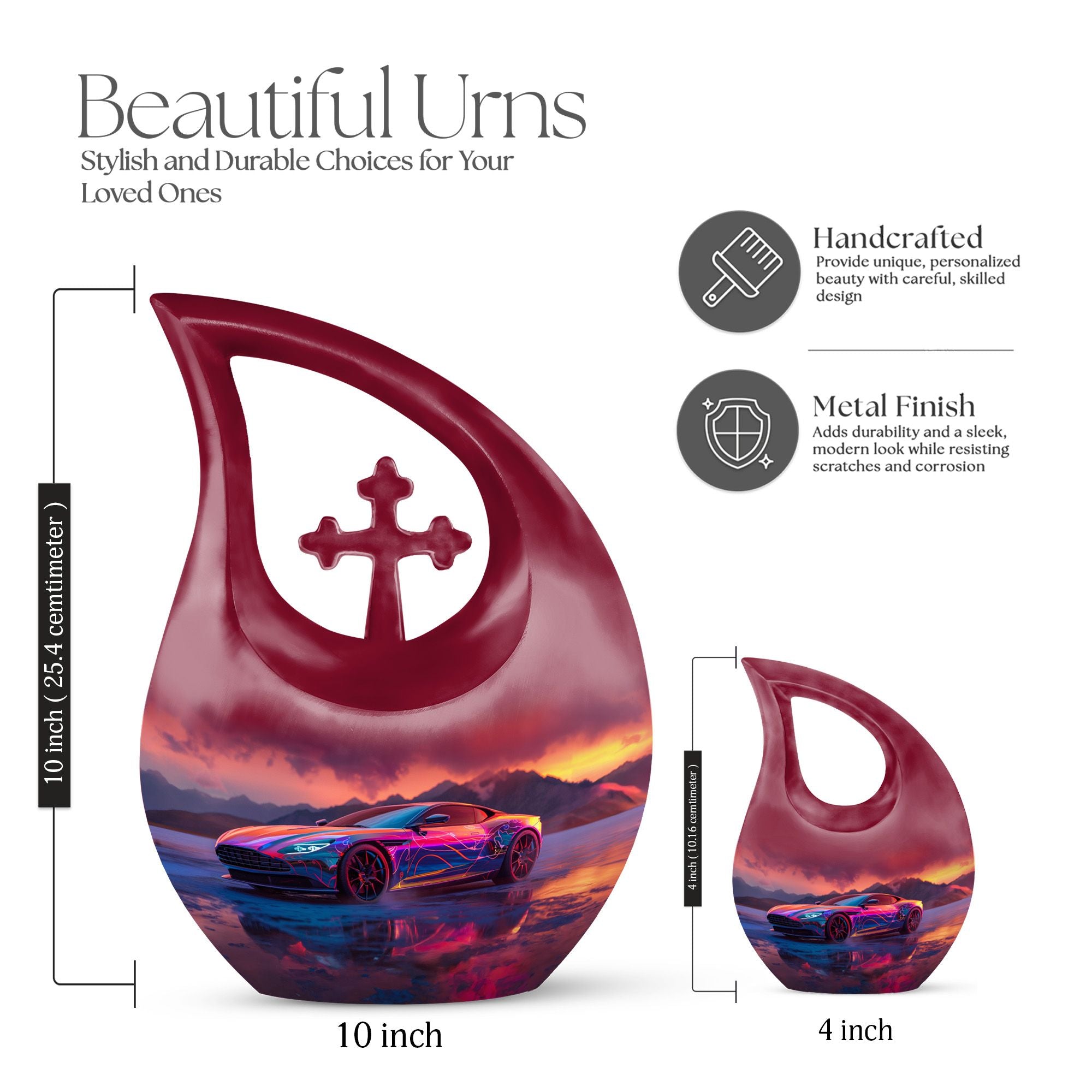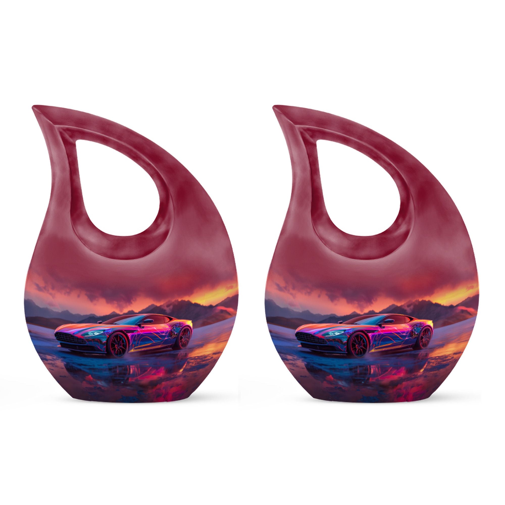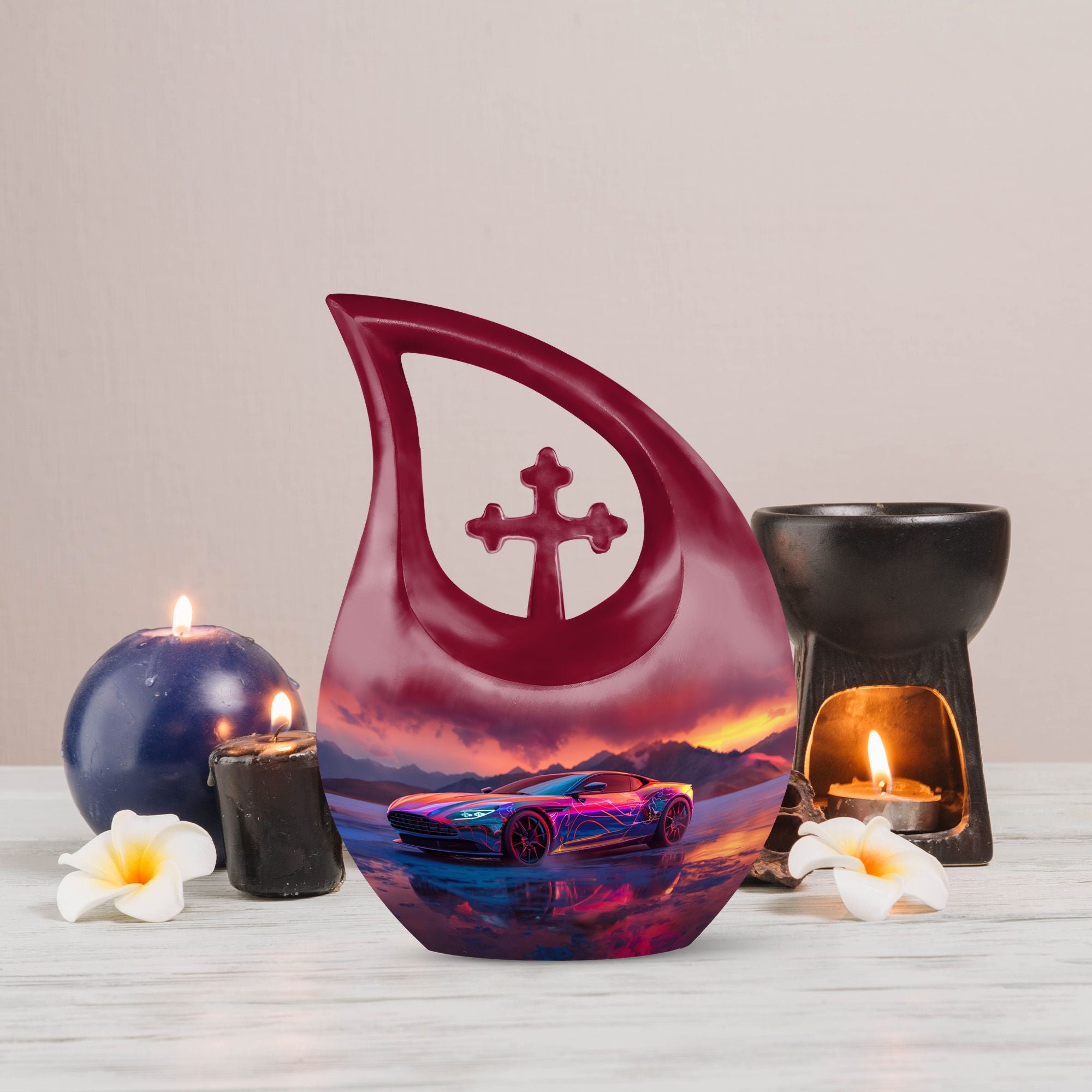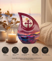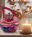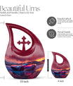 Create a long-lasting tribute to your loved one with our 10-inch-size Neon Sunset Dreamscape Urn, a truly remarkable apparatus among memorial urns. Primarily crafted from sturdy Aluminium, this cremation ash vase weighs a solid 3.3 pounds, offering a reminisce of the calming and protective essence your loved one. The urn is perfectly sized with a capacity to hold up to 200 cubic inches of ashes, safely secured in an accompanying velvet pouch. We offer you the opportunity to add a personal touch to these large urns by engraving names onto it, making it wholly unique. Its distinct theme of the 'Neon Sunset Dreamscape', coupled with the rare 'Cross Drop' shape, adds an elegant edge to its presence. With its vibrant color and aesthetic design, this urn serves as a beautiful, respectful home for the ashes of your loved ones. Our urns aren't just containers; they are a celebratory memory of lives spent with love and harmony.