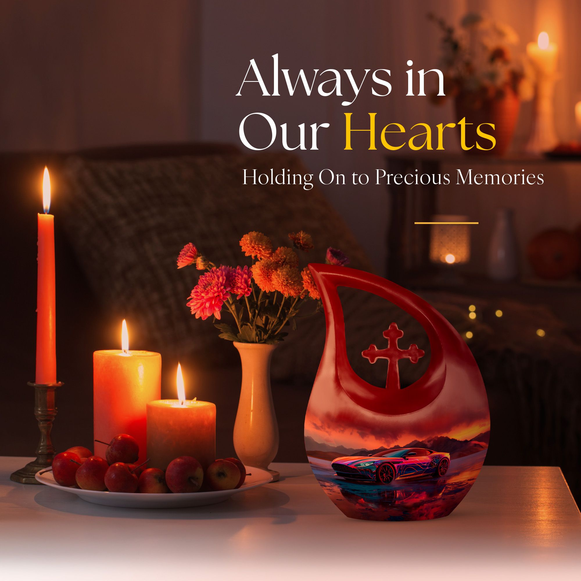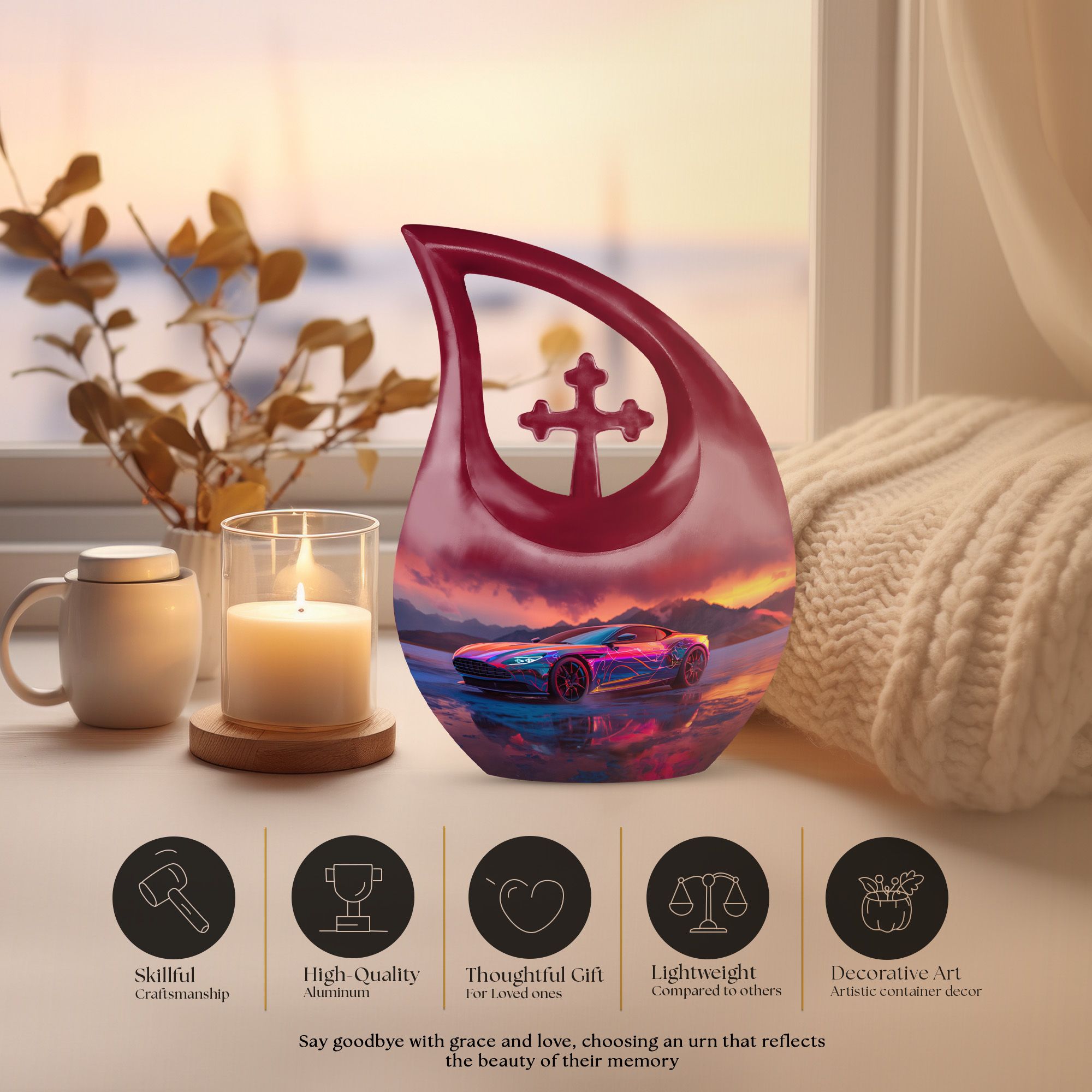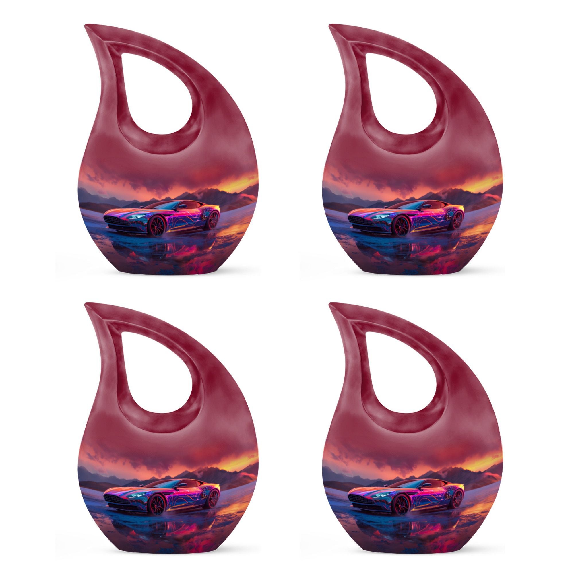 Create a long-lasting tribute to your loved one with our 10-inch-size Neon Sunset Dreamscape Urn, a truly remarkable apparatus among memorial urns. Primarily crafted from sturdy Aluminium, this cremation ash vase weighs a solid 3.3 pounds, offering a reminisce of the calming and protective essence your loved one. The urn is perfectly sized with a capacity to hold up to 200 cubic inches of ashes, safely secured in an accompanying velvet pouch. We offer you the opportunity to add a personal touch to these large urns by engraving names onto it, making it wholly unique. Its distinct theme of the 'Neon Sunset Dreamscape', coupled with the rare 'Cross Drop' shape, adds an elegant edge to its presence. With its vibrant color and aesthetic design, this urn serves as a beautiful, respectful home for the ashes of your loved ones. Our urns aren't just containers; they are a celebratory memory of lives spent with love and harmony.