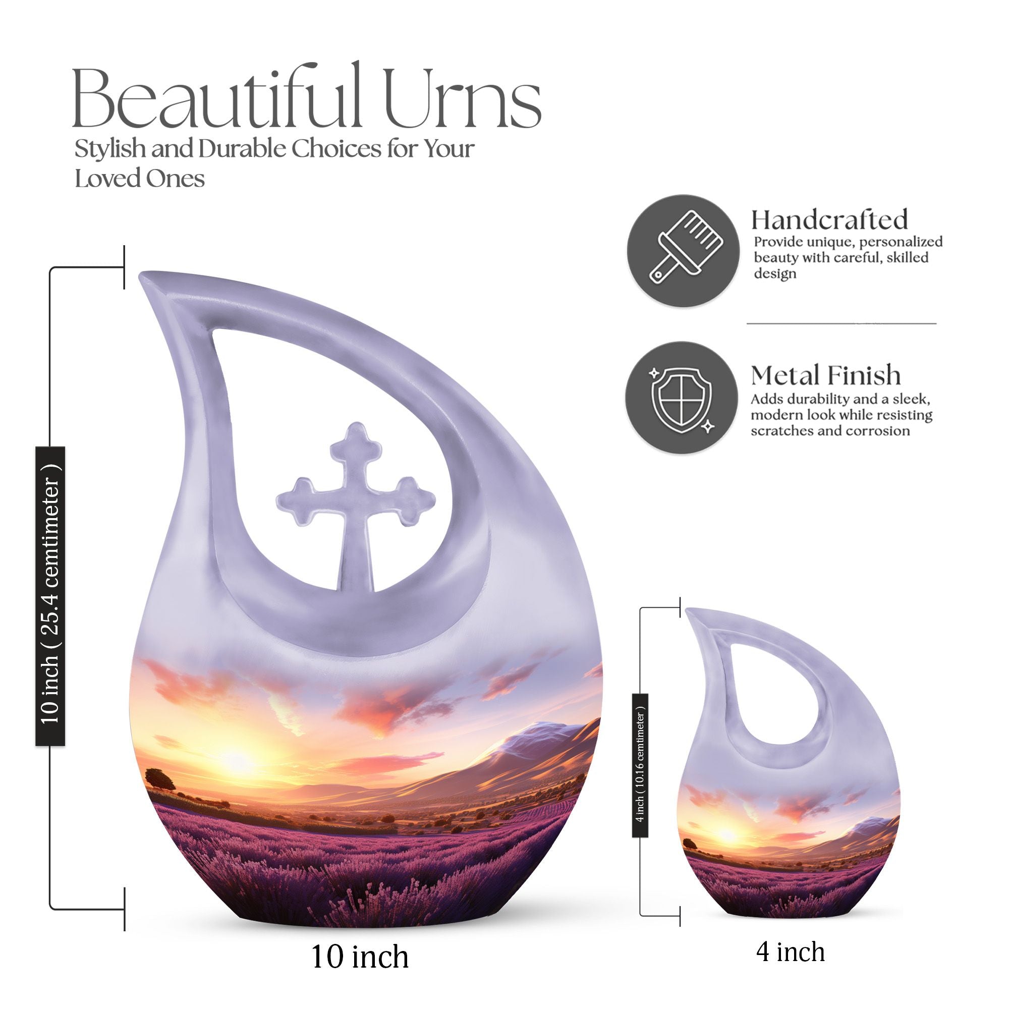 Crafted from durable aluminum, this full-size urn blends artistry with secure functionality. The soothing farm landscape design makes it ideal for home display or burial services, while its 10-inch height provides ample capacity for adult remains. This urn is also suitable for families searching for cremation urn women, burial urns urn for ashes for women, or a dignified tribute for men, including urn for human ashes adult men, mens urns for human ashes, and funeral urns men. The secure screw-top lid ensures long-term protection and peace of mind.