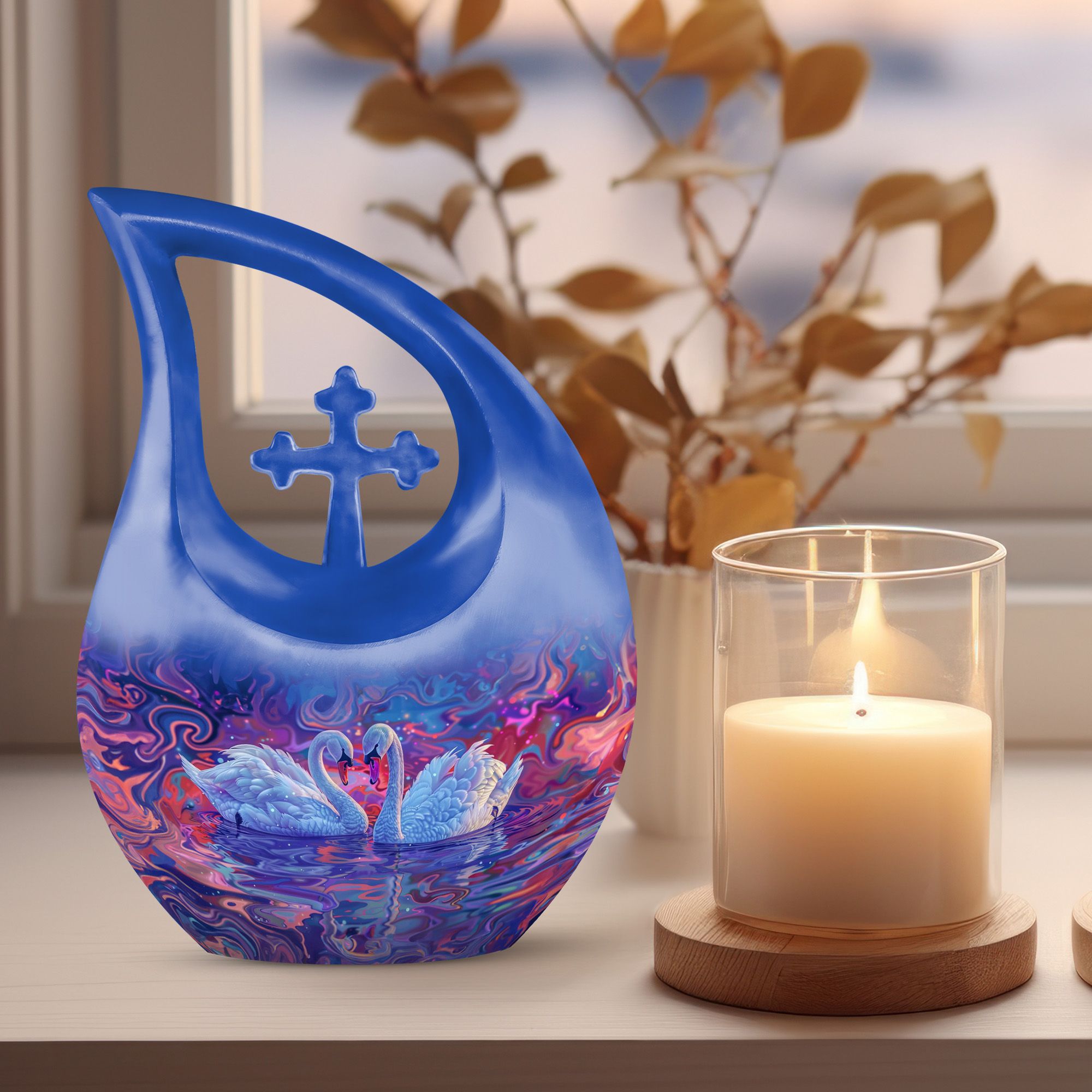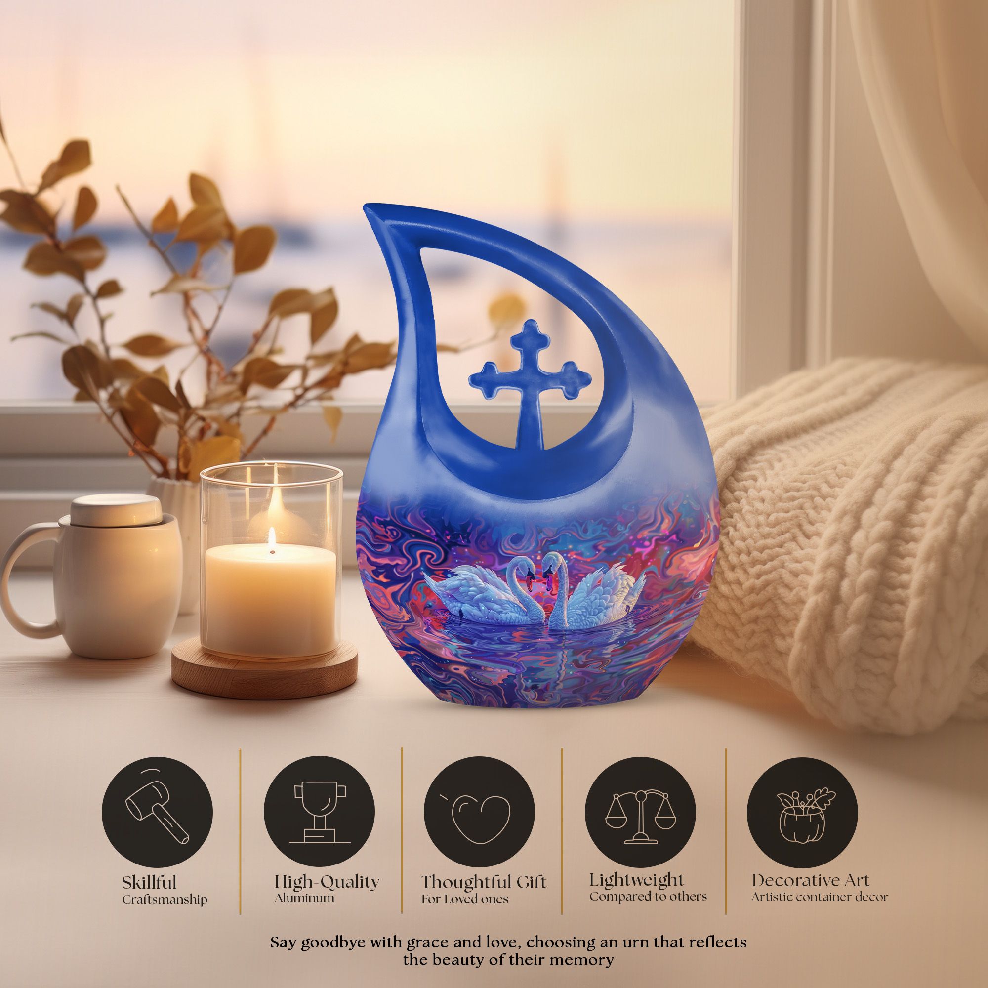 Surreal Swan Reflections Urn is a revered tribute to the dearly departed, blending aesthetic allure with loving utility. This elegant 10-inch aluminium funeral urn carries the Cross Drop design, signifying a stirring resolution towards spiritual solace. The urn has a capacity of 200 cubic inches, capable of safely containing ashes in the accompanying velvet pouch. This inexpensive cremation urn weighs a manageable 3.3 pounds, making it a versatile option for your memorial urn requirements. What's more, add an intimate touch to the urn by personalizing it with engraved names. A dynamic piece in the Large Urns category, its surreal theme is sure to captivate the hearts of adults and seniors alike. Notable as one of the most resplendent funeral urns for adults and pretty urns, it is also regarded as an exceptional choice among extra large cremation Urns and blue urns for human ashes.