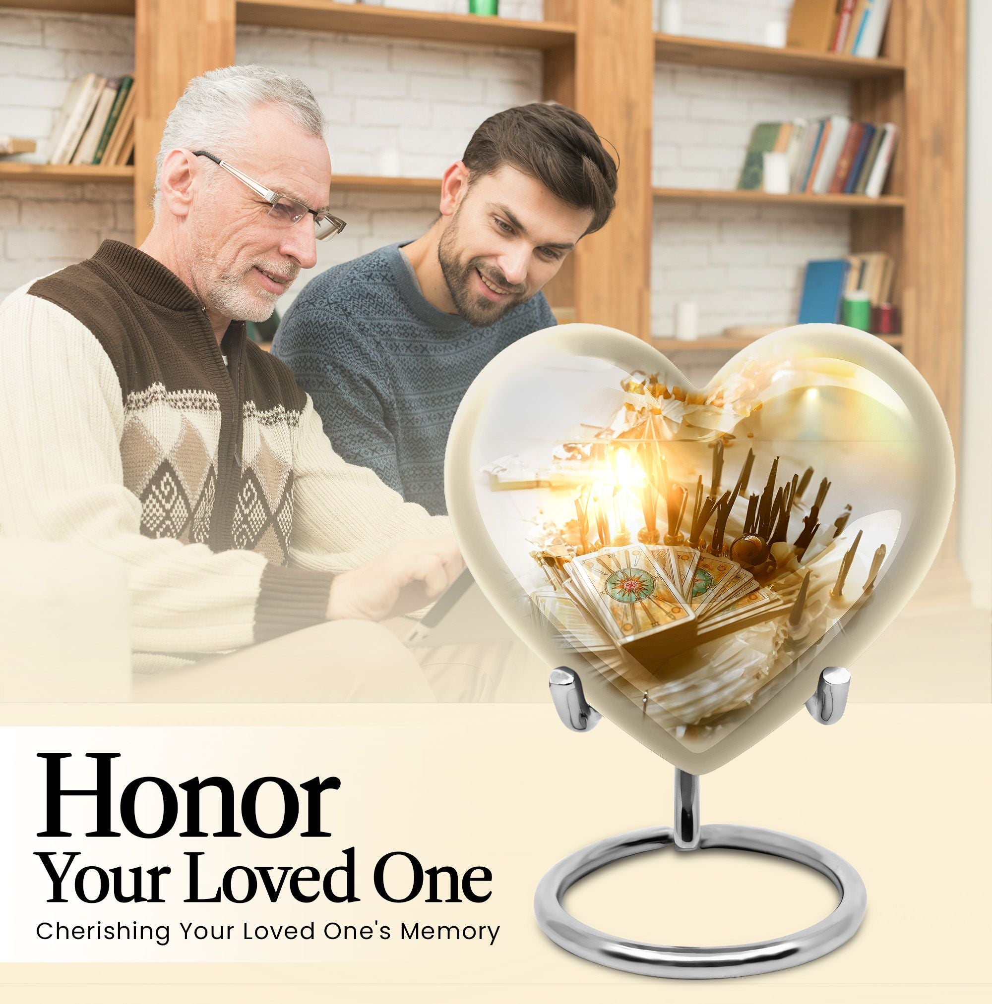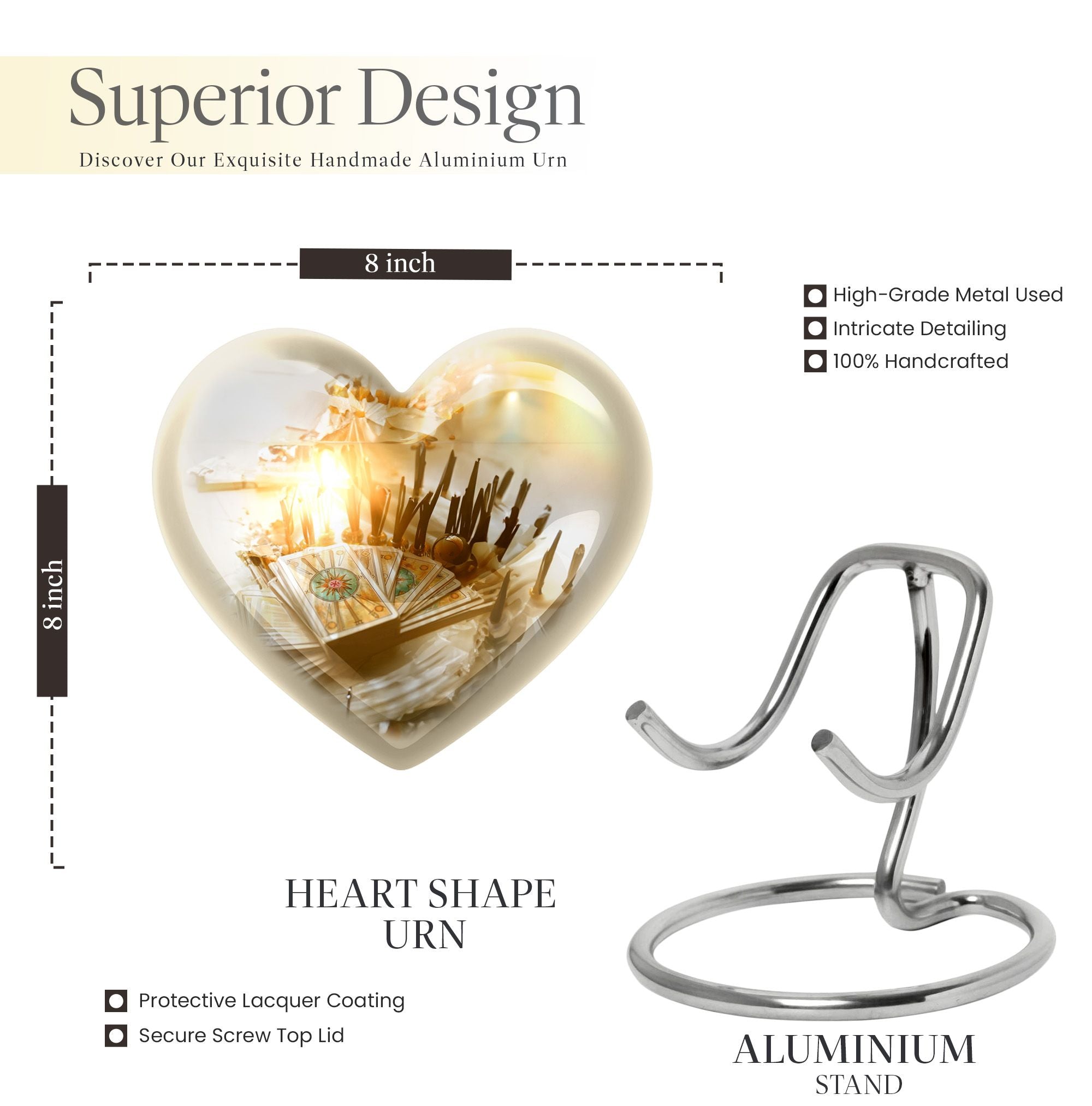 Experience serenity and peace during a poignant time with our abstract-themed Tarot Urn. This striking Large Urn stands at 10 inches in height and weighs 3.3 pounds. With a capacity of 200 cubic inches, it provides ample space for holding the remains of your dearly departed. Purposefully crafted from durable aluminium, this transcendent funeral urn for ashes for men ensures secure containment. Each shipment includes a plush velvet pouch for respectful and dignified holding of the ashes. Personalization options are available, allowing you to engrave the names of your loved ones onto the urn, creating a lasting, tangible memory. Despite its metal construct, this urn doesn't compromise on style or emotional appeal. Whether you're seeking memorial human urns for ashes, traditional urns, or burial urns, our Tarot Urn encapsulates the solemnity you seek. Please note: design has not been attributed as per request.