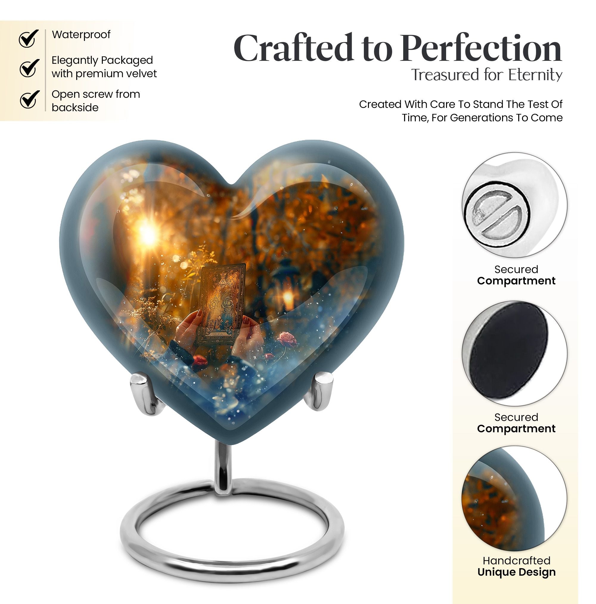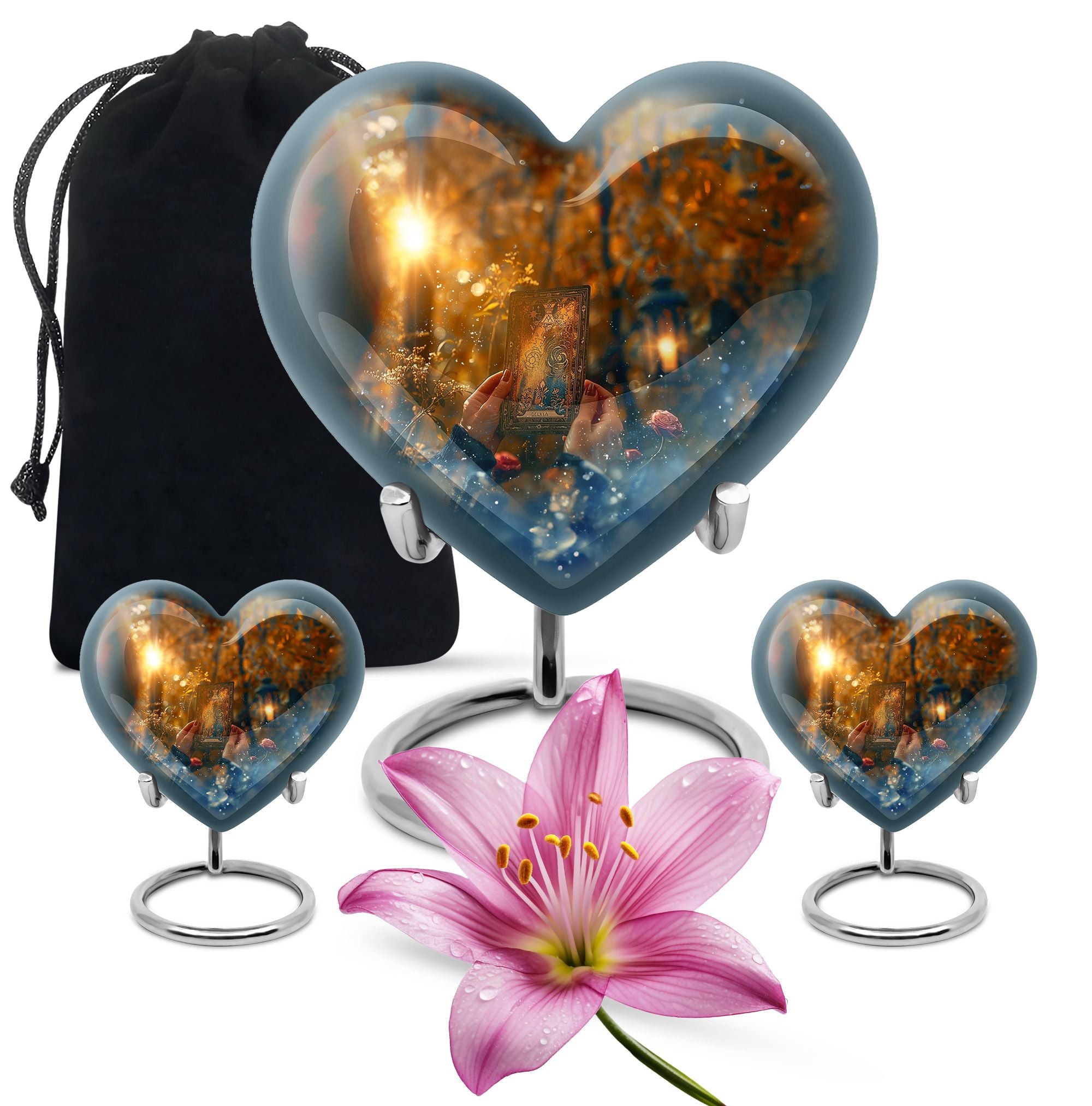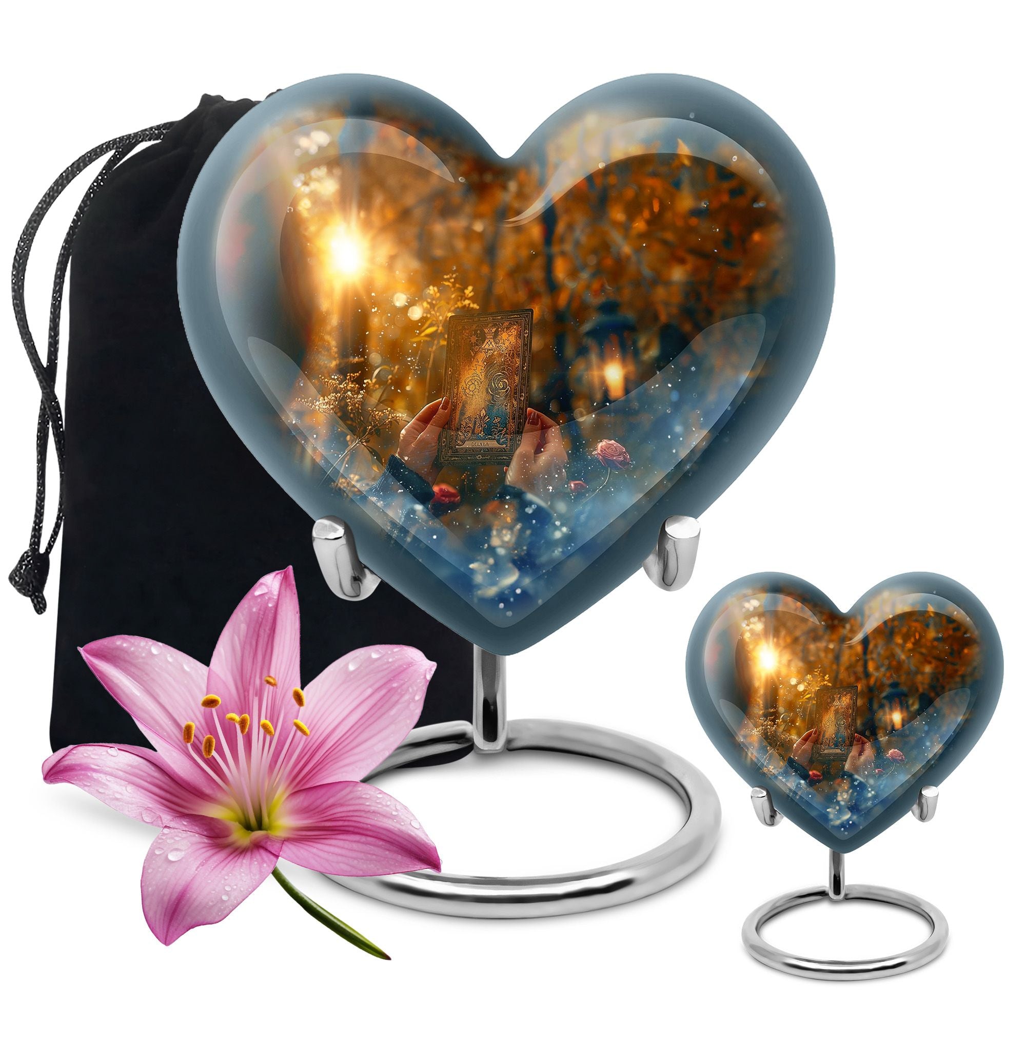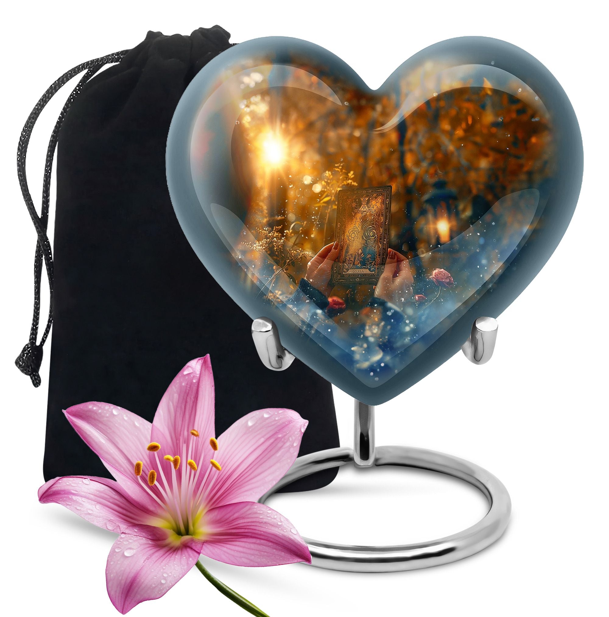 An elegant piece of remembrance, our 10 Inch Tarot Urn makes for a beautiful choice of burial funeral urns for adult ashes, suitable for both men and women. With the heart urn design reflecting your heartfelt memories, its abstract theme adds a unique touch. This large urn is meticulously crafted from durable and lightweight aluminium, giving it longevity to honor your loved ones. Weighing a manageable 3.3 pounds and standing at 10 inches in height, it has a capacity of 200 cubic inches, making it a substantial piece. Personalize it with engraved names to honor the memory of your loved one, enhancing its sentimental value. The package also includes a velvet pouch for secure containment of ashes, adding an extra layer of protection. The Tarot Urn transcends ordinary memorial urns, providing a beautiful way to pay tribute. Keywords that serve as compact summaries; cremation large urn for ashes, ash adult ashes women, earn cremation, metal urns for burial in ground.