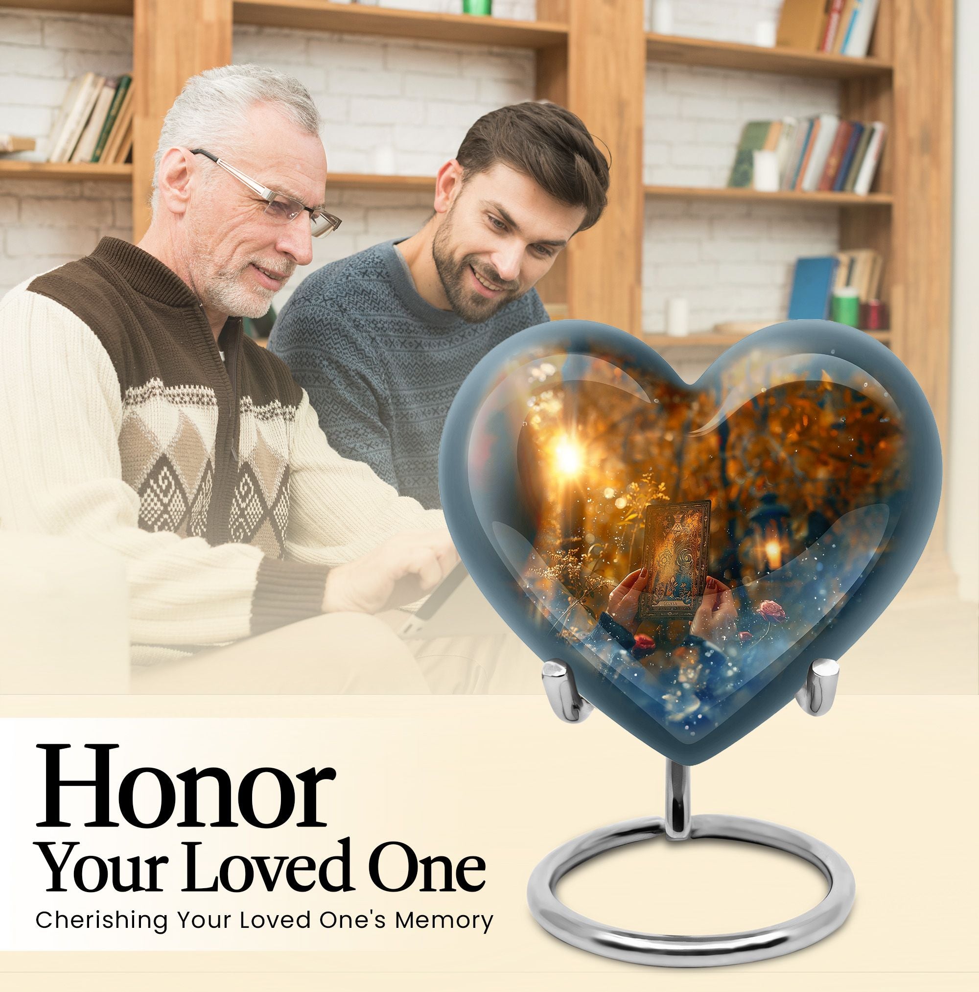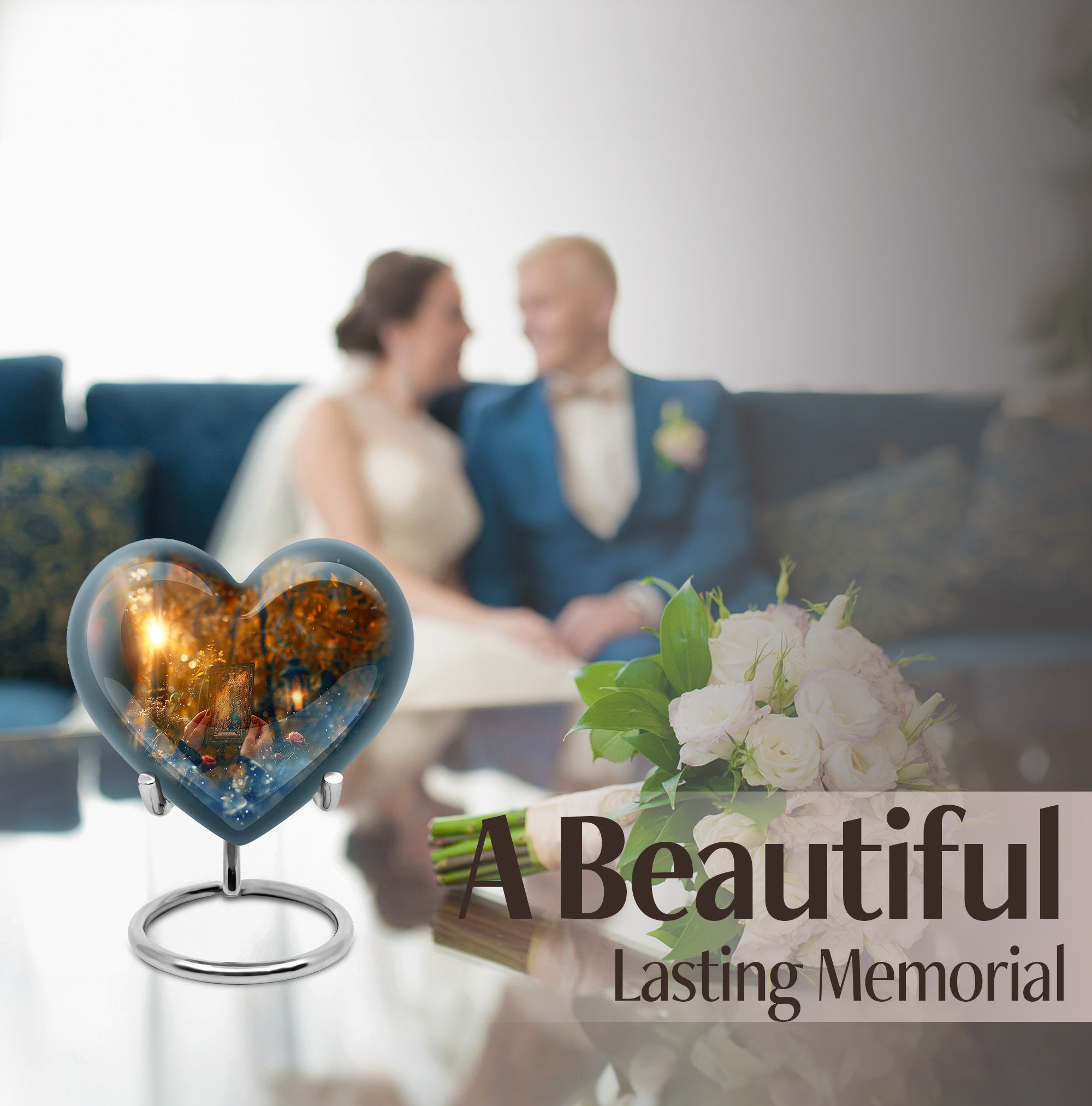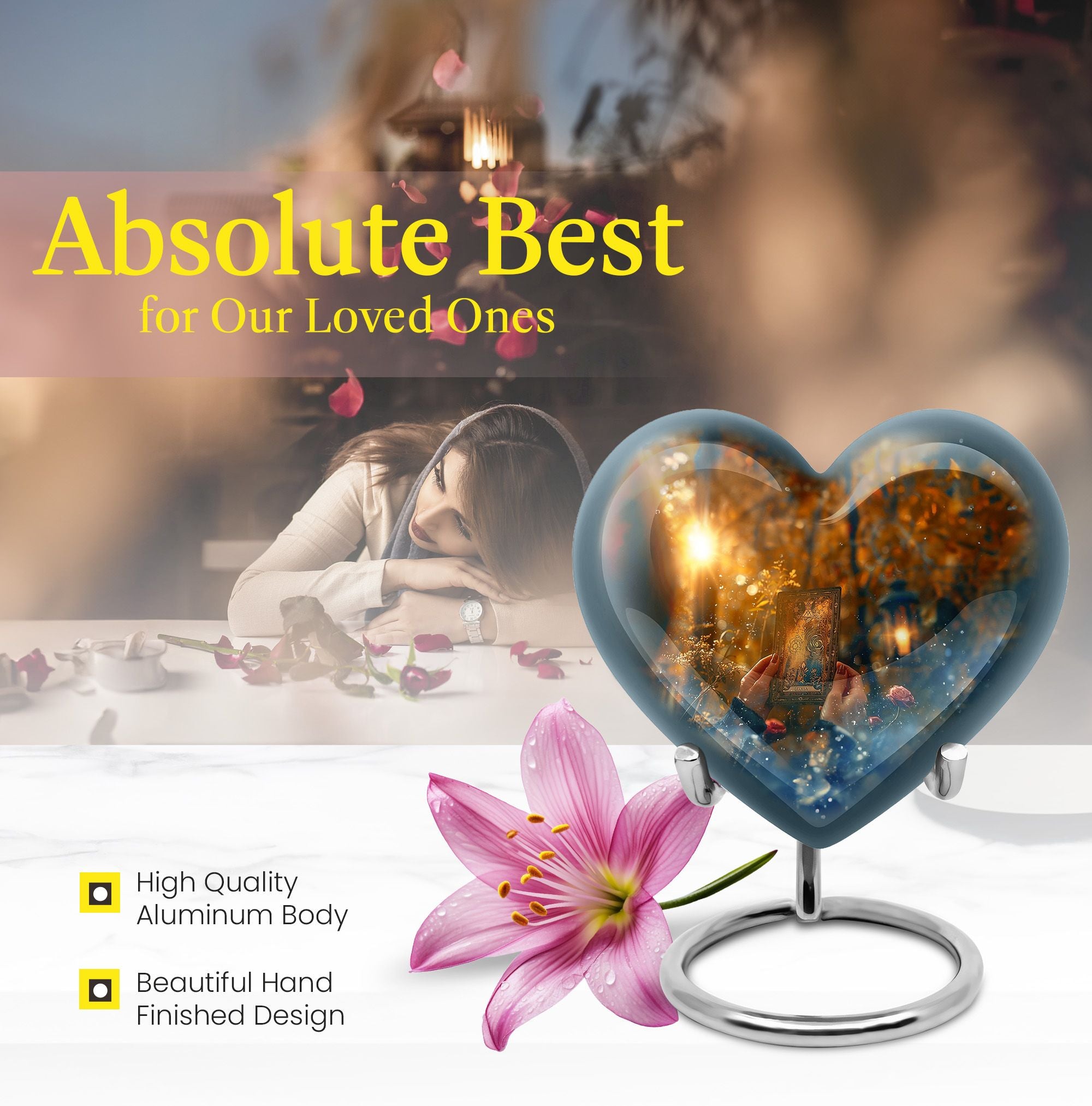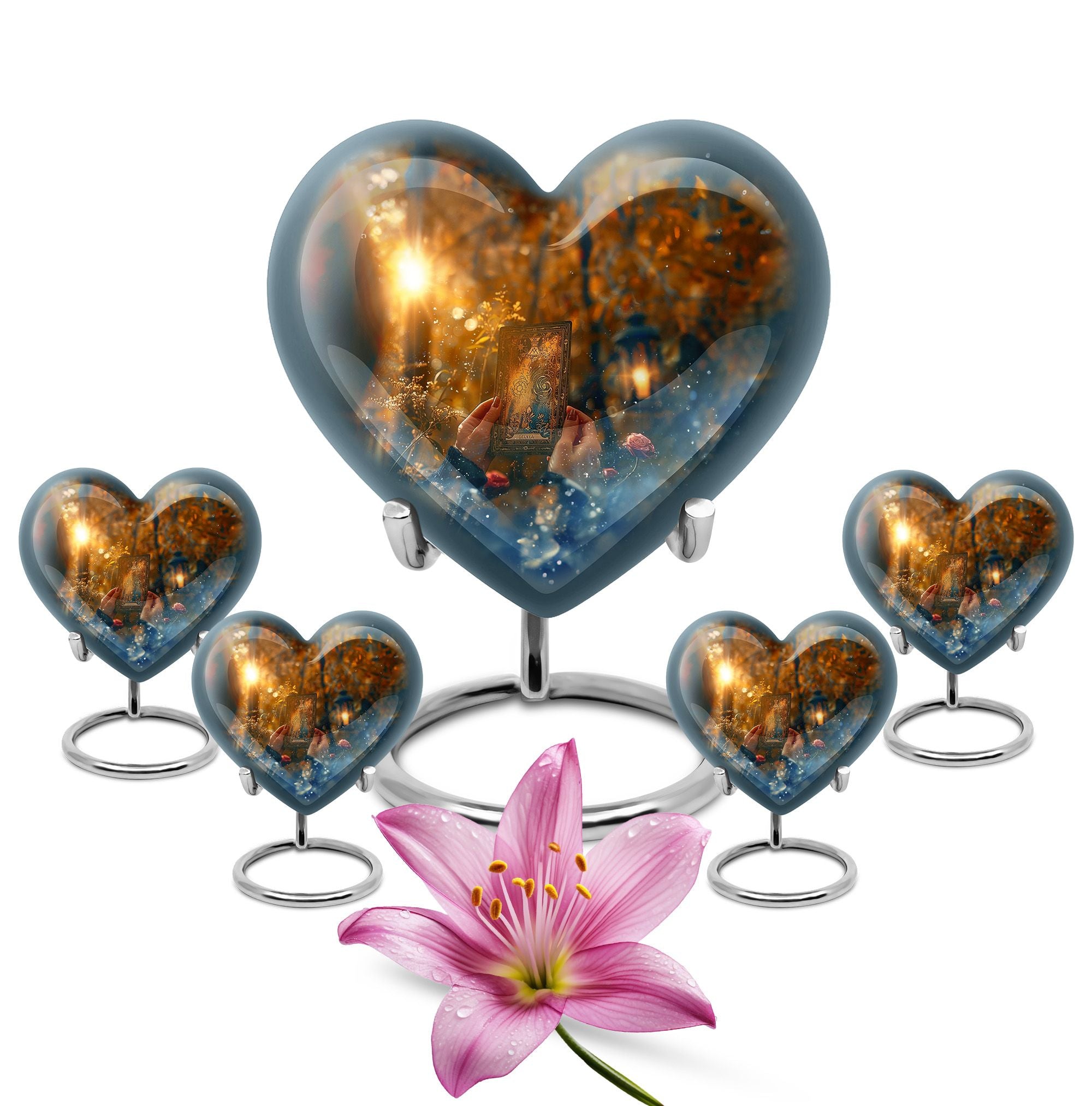 An elegant piece of remembrance, our 10 Inch Tarot Urn makes for a beautiful choice of burial funeral urns for adult ashes, suitable for both men and women. With the heart urn design reflecting your heartfelt memories, its abstract theme adds a unique touch. This large urn is meticulously crafted from durable and lightweight aluminium, giving it longevity to honor your loved ones. Weighing a manageable 3.3 pounds and standing at 10 inches in height, it has a capacity of 200 cubic inches, making it a substantial piece. Personalize it with engraved names to honor the memory of your loved one, enhancing its sentimental value. The package also includes a velvet pouch for secure containment of ashes, adding an extra layer of protection. The Tarot Urn transcends ordinary memorial urns, providing a beautiful way to pay tribute. Keywords that serve as compact summaries; cremation large urn for ashes, ash adult ashes women, earn cremation, metal urns for burial in ground.