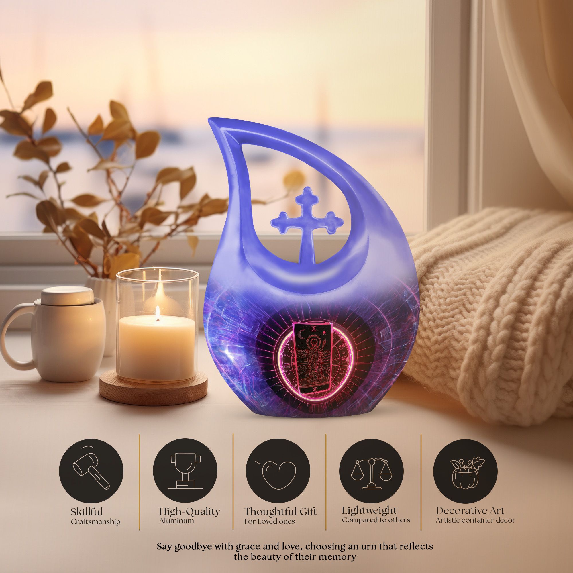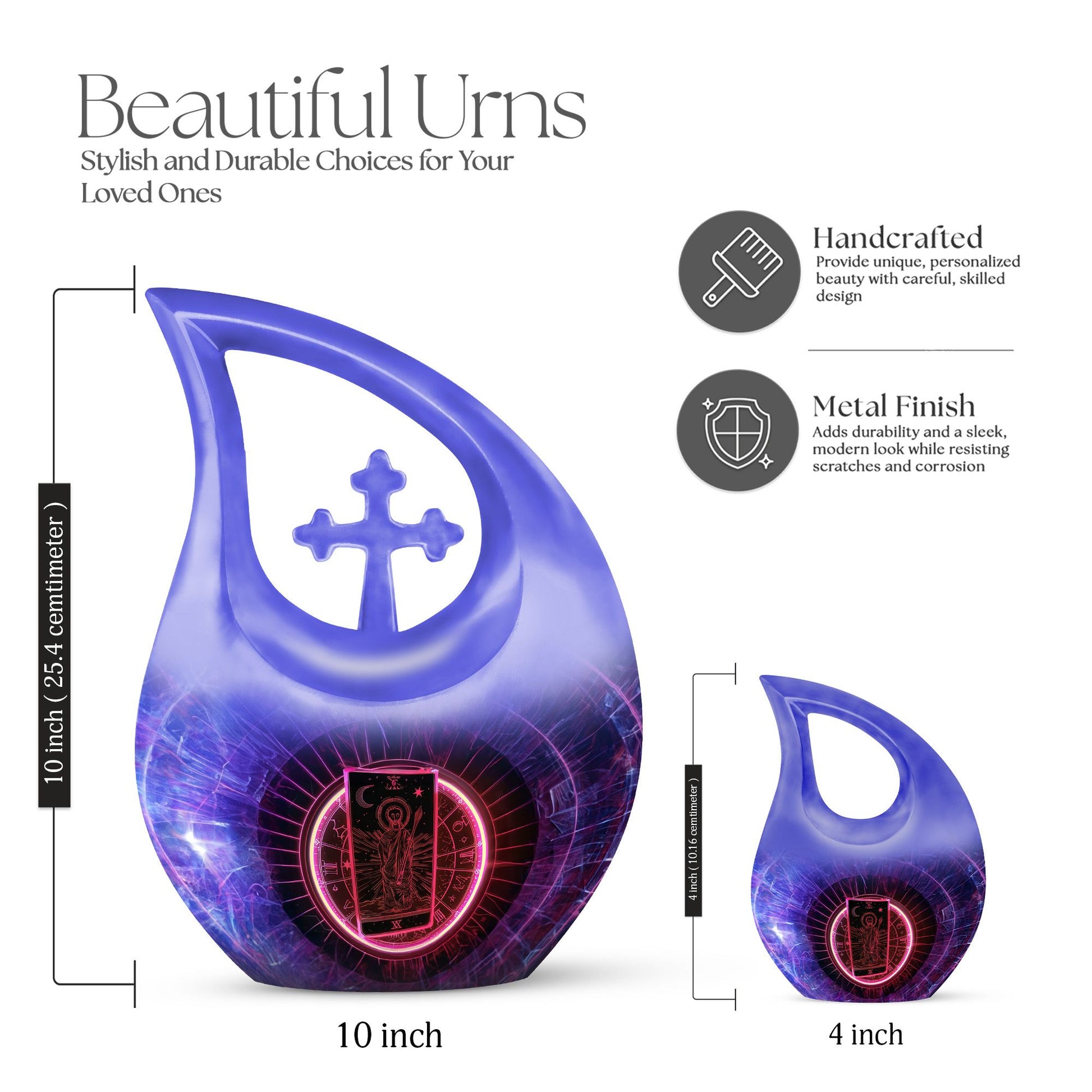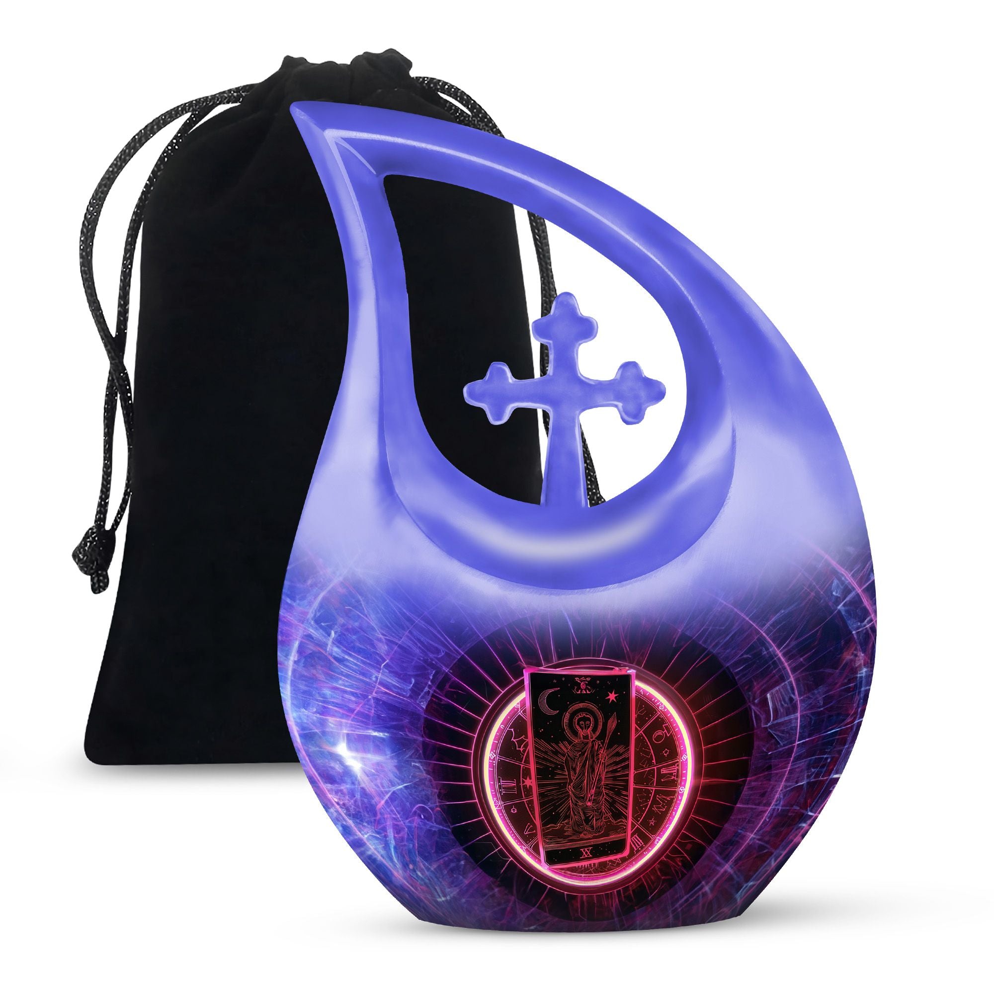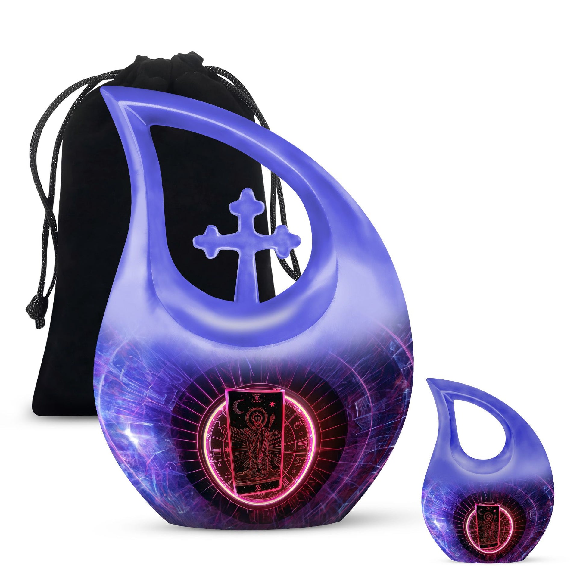 Experience a profound sense of tranquility with our Tarot Urn, a sacred artifact of high-quality aluminum designed to tenderly cradle the ashes of your loved ones. Of a petite 10-inch stature and weighing a sturdy 3.3 pounds, the beautifully styled Cross Drop motif illustrates a meaningful connection to the spiritual realm, mirroring the tranquil journey of the soul. The urn's impressive 200 cubic inch capacity accommodates ashes tactfully, and comes complete with a plush velvet pouch, ensuring safe and dignified containment. This exquisite piece is fully customizable, offering the unique feature to personalize with engraved names, allowing for a deeply touching tribute. Perfect for adults and seniors in search of small cremation urns or memorial urns, every detail of this respectful receptacle resonates with heartfelt narrative. Poised and elegant, our Tarot Urn is not only an artifact but a vessel for indispensable memories, bringing solace to the heart and soul.