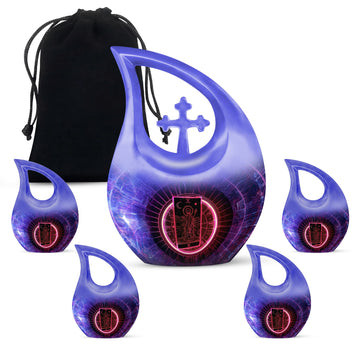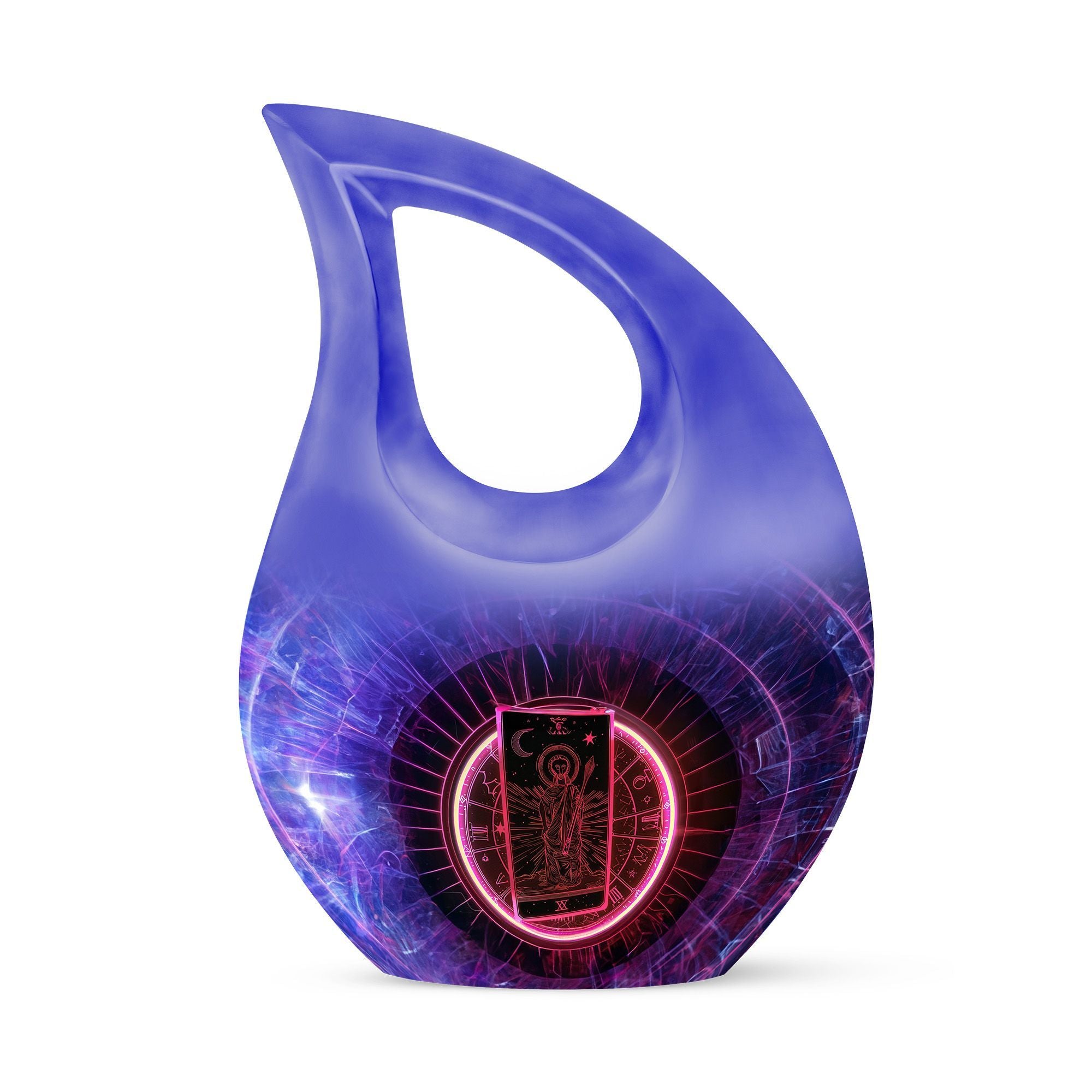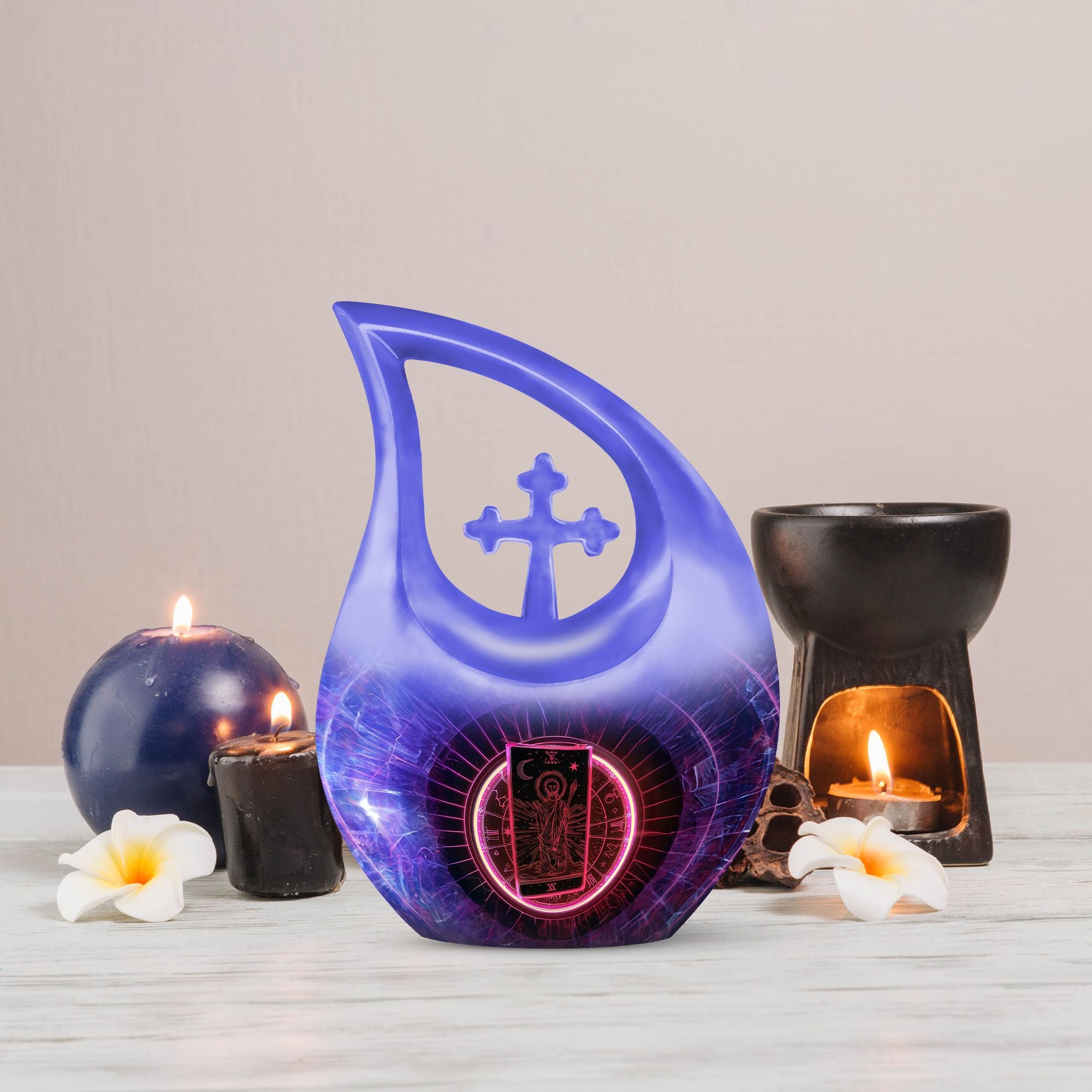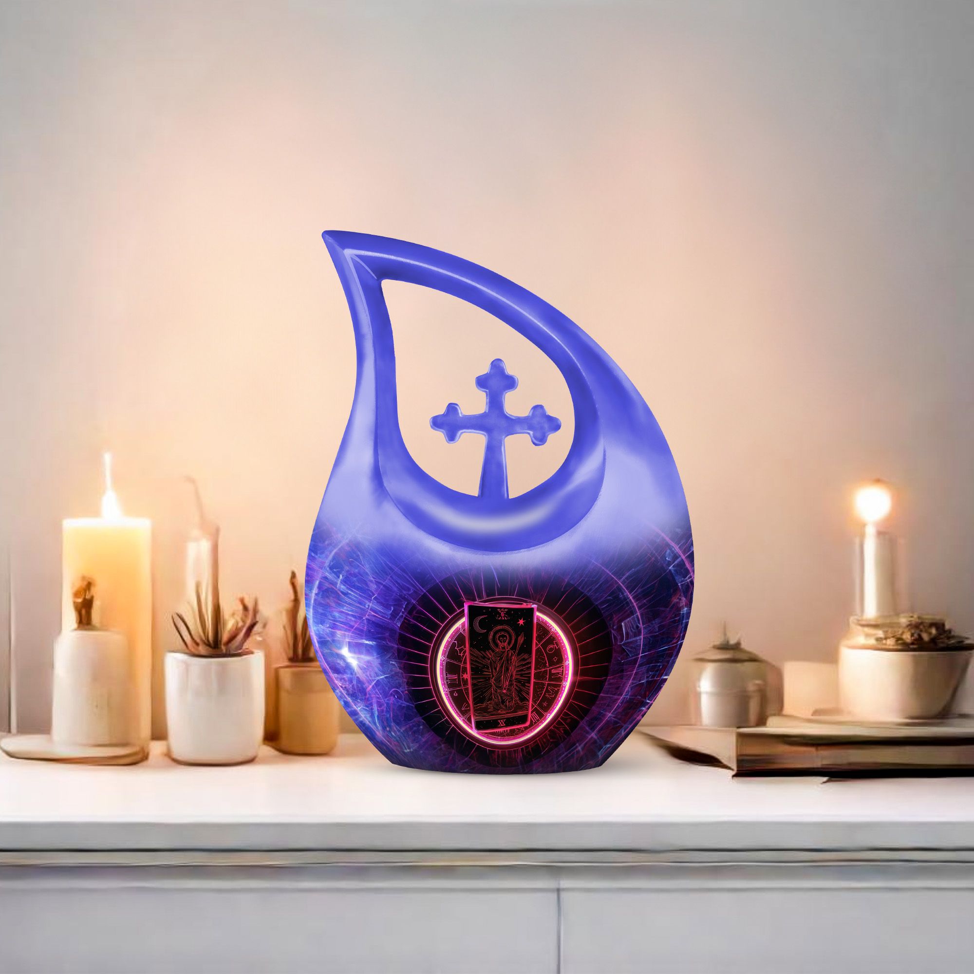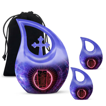 Experience a profound sense of tranquility with our Tarot Urn, a sacred artifact of high-quality aluminum designed to tenderly cradle the ashes of your loved ones. Of a petite 10-inch stature and weighing a sturdy 3.3 pounds, the beautifully styled Cross Drop motif illustrates a meaningful connection to the spiritual realm, mirroring the tranquil journey of the soul. The urn's impressive 200 cubic inch capacity accommodates ashes tactfully, and comes complete with a plush velvet pouch, ensuring safe and dignified containment. This exquisite piece is fully customizable, offering the unique feature to personalize with engraved names, allowing for a deeply touching tribute. Perfect for adults and seniors in search of small cremation urns or memorial urns, every detail of this respectful receptacle resonates with heartfelt narrative. Poised and elegant, our Tarot Urn is not only an artifact but a vessel for indispensable memories, bringing solace to the heart and soul.