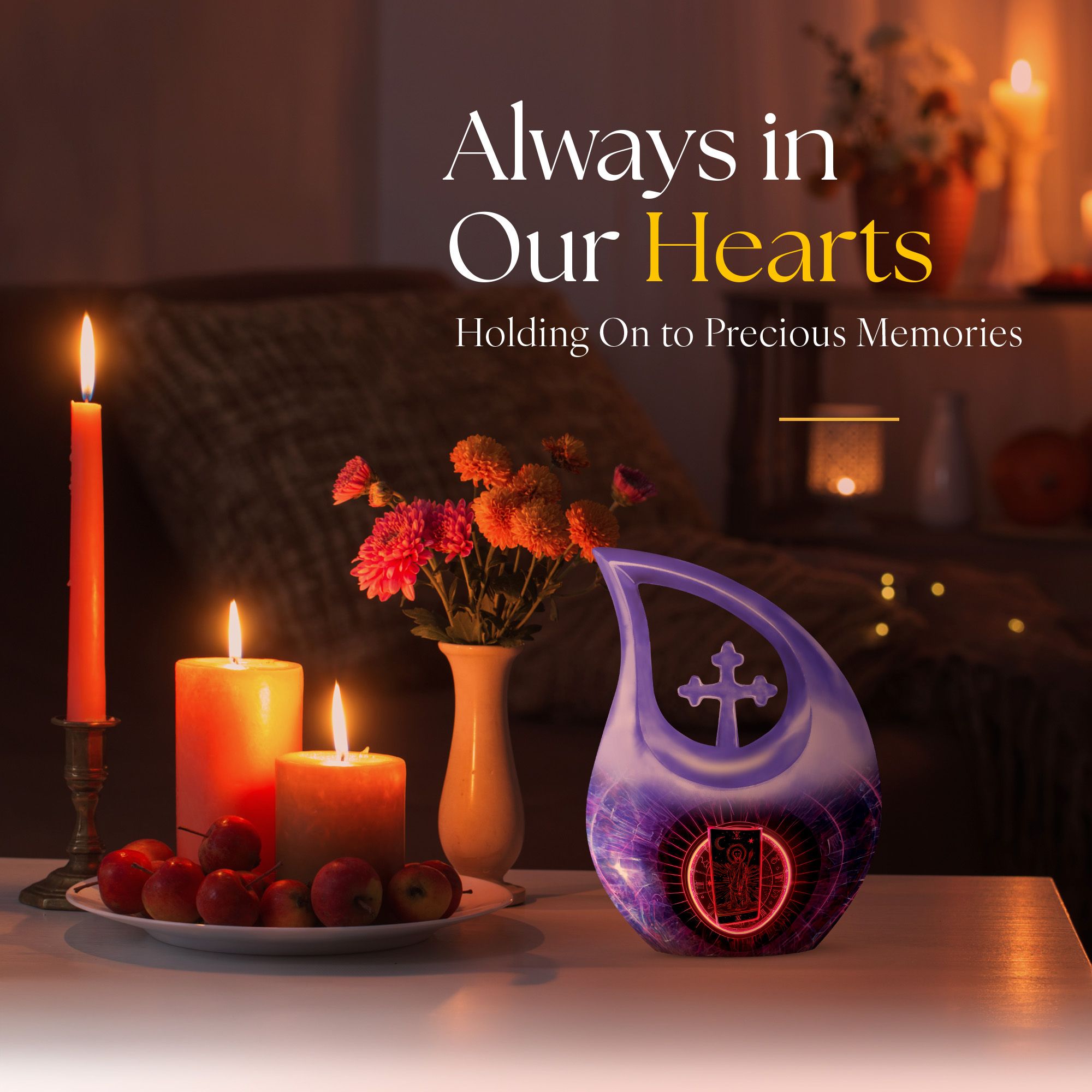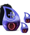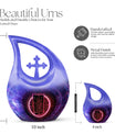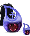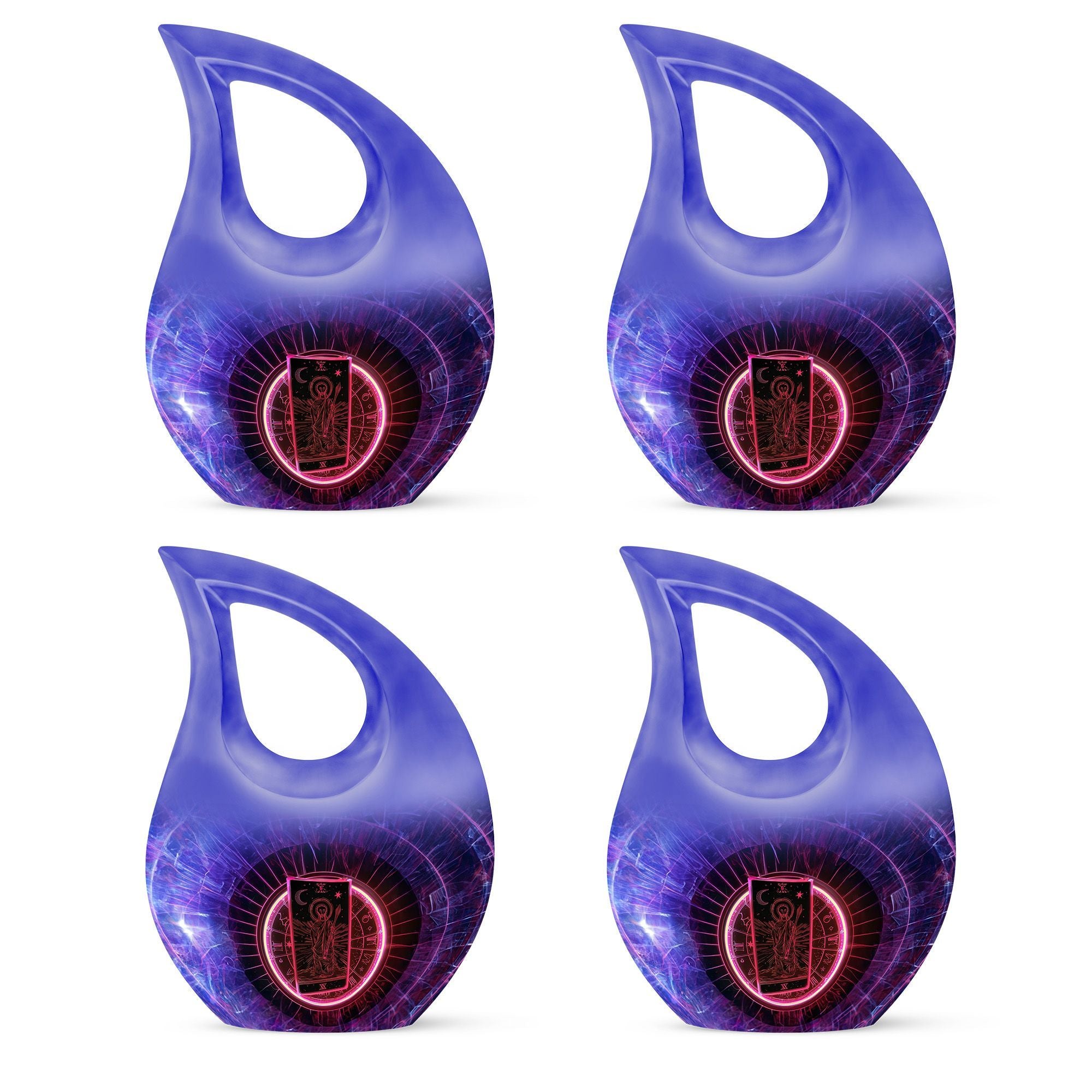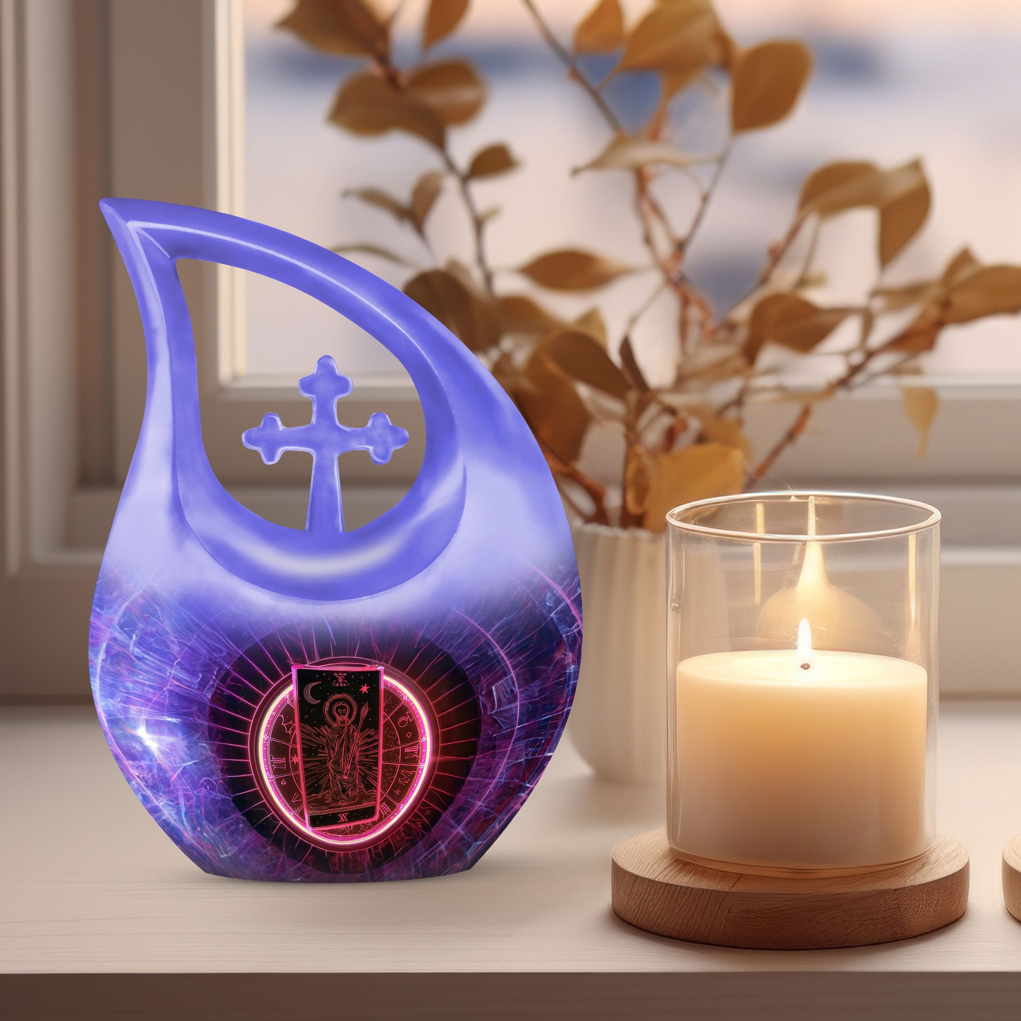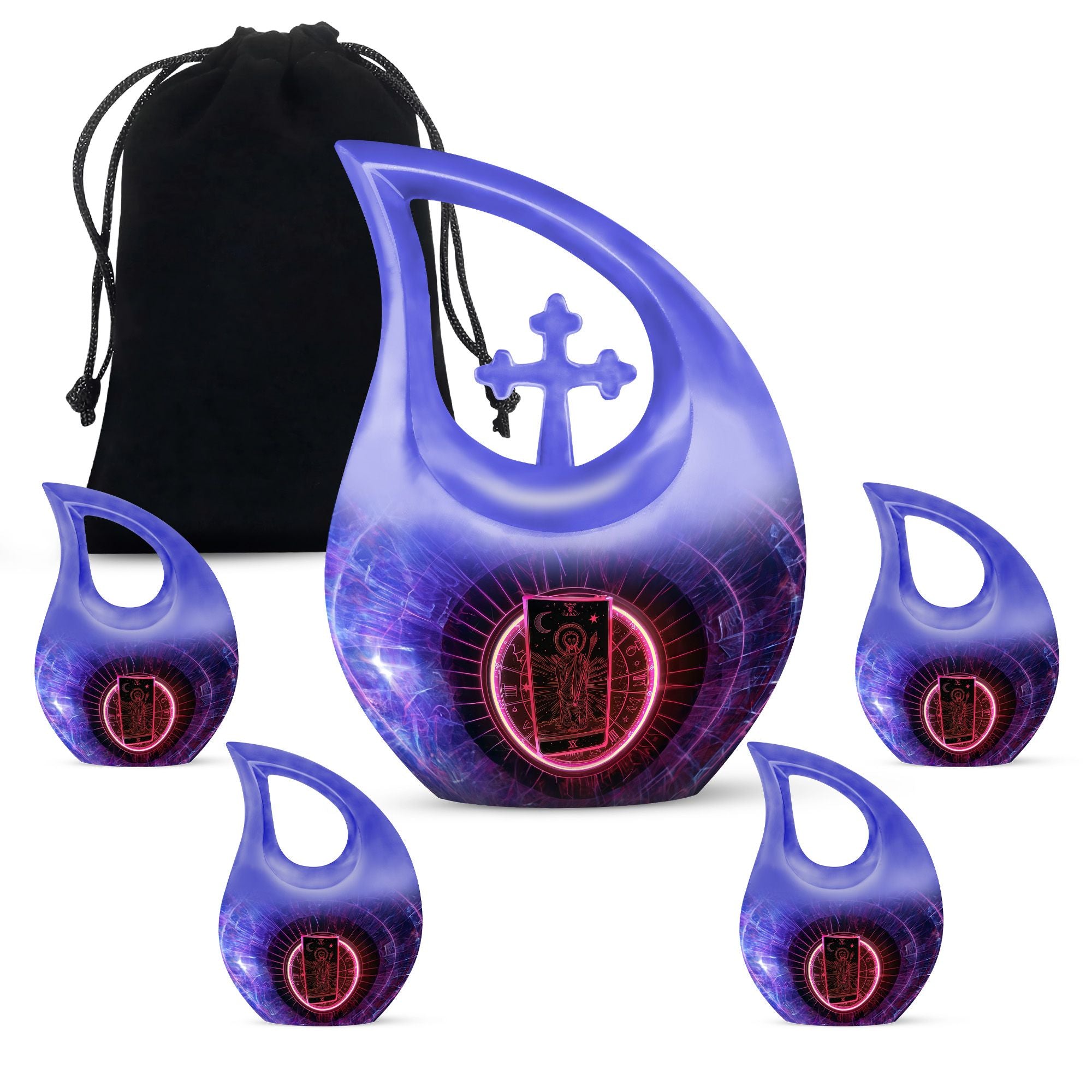 Experience a profound sense of tranquility with our Tarot Urn, a sacred artifact of high-quality aluminum designed to tenderly cradle the ashes of your loved ones. Of a petite 10-inch stature and weighing a sturdy 3.3 pounds, the beautifully styled Cross Drop motif illustrates a meaningful connection to the spiritual realm, mirroring the tranquil journey of the soul. The urn's impressive 200 cubic inch capacity accommodates ashes tactfully, and comes complete with a plush velvet pouch, ensuring safe and dignified containment. This exquisite piece is fully customizable, offering the unique feature to personalize with engraved names, allowing for a deeply touching tribute. Perfect for adults and seniors in search of small cremation urns or memorial urns, every detail of this respectful receptacle resonates with heartfelt narrative. Poised and elegant, our Tarot Urn is not only an artifact but a vessel for indispensable memories, bringing solace to the heart and soul.