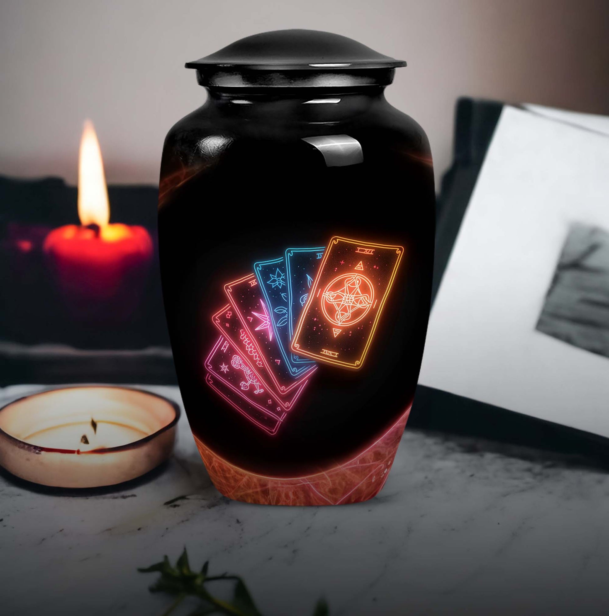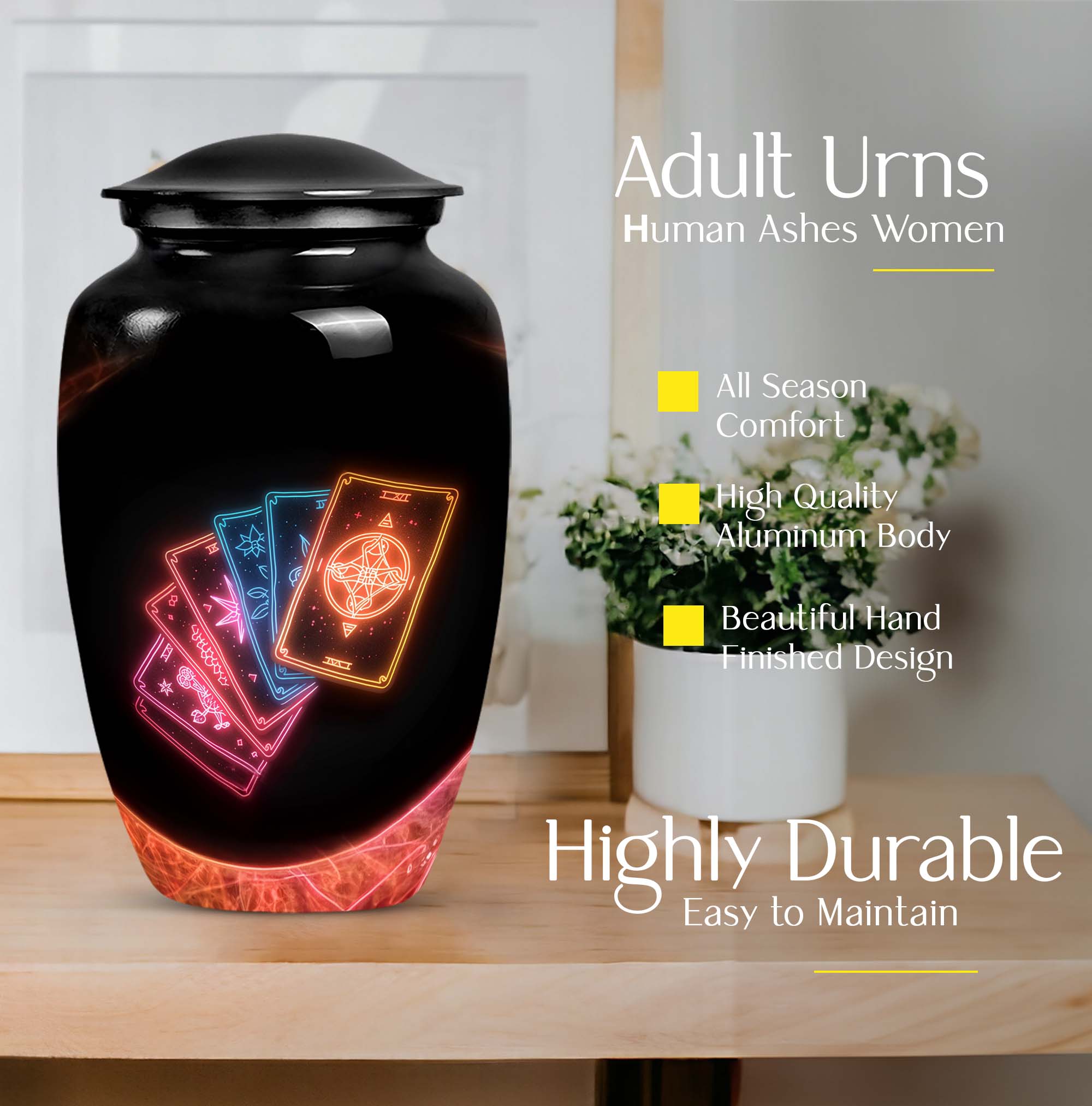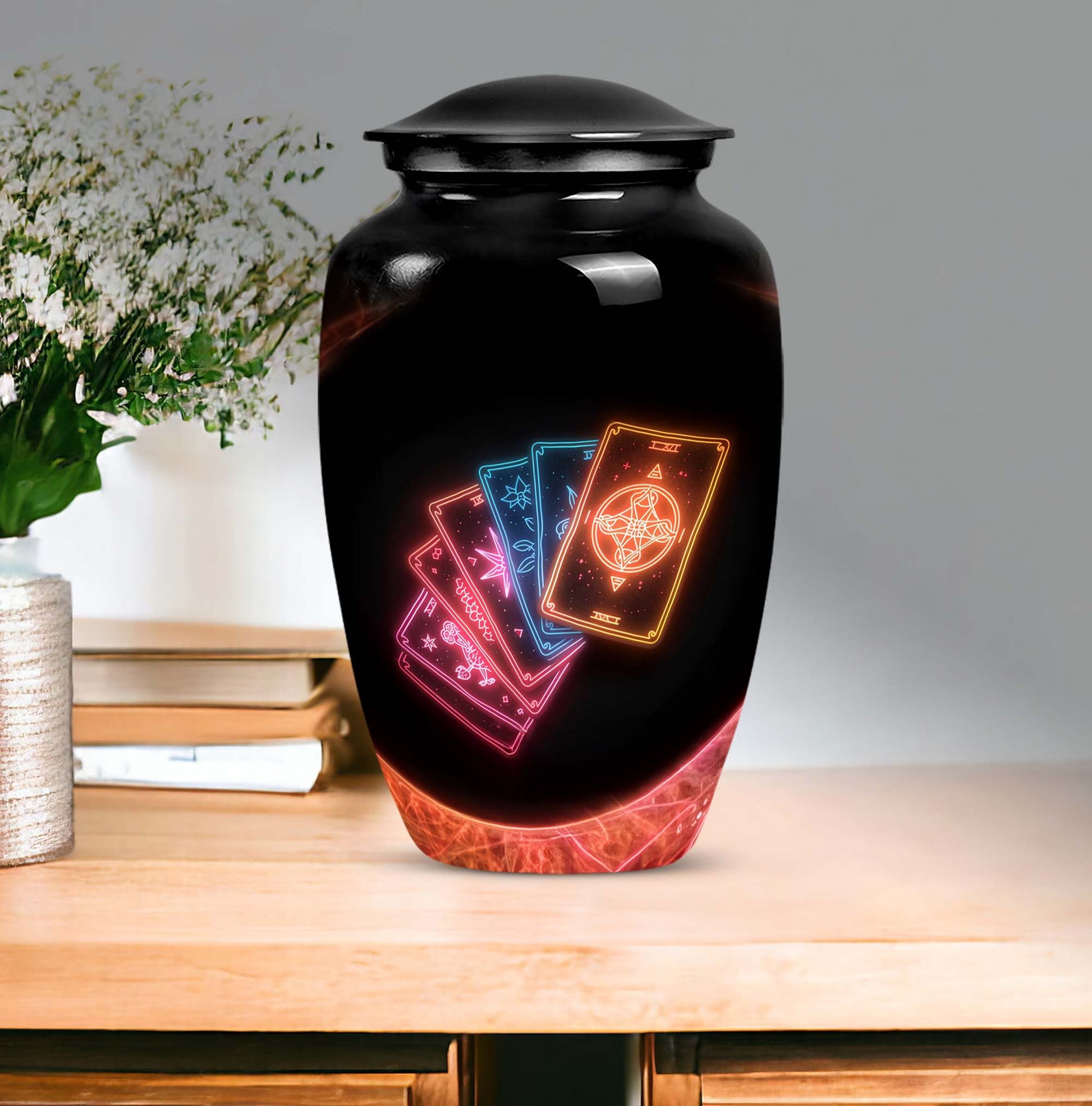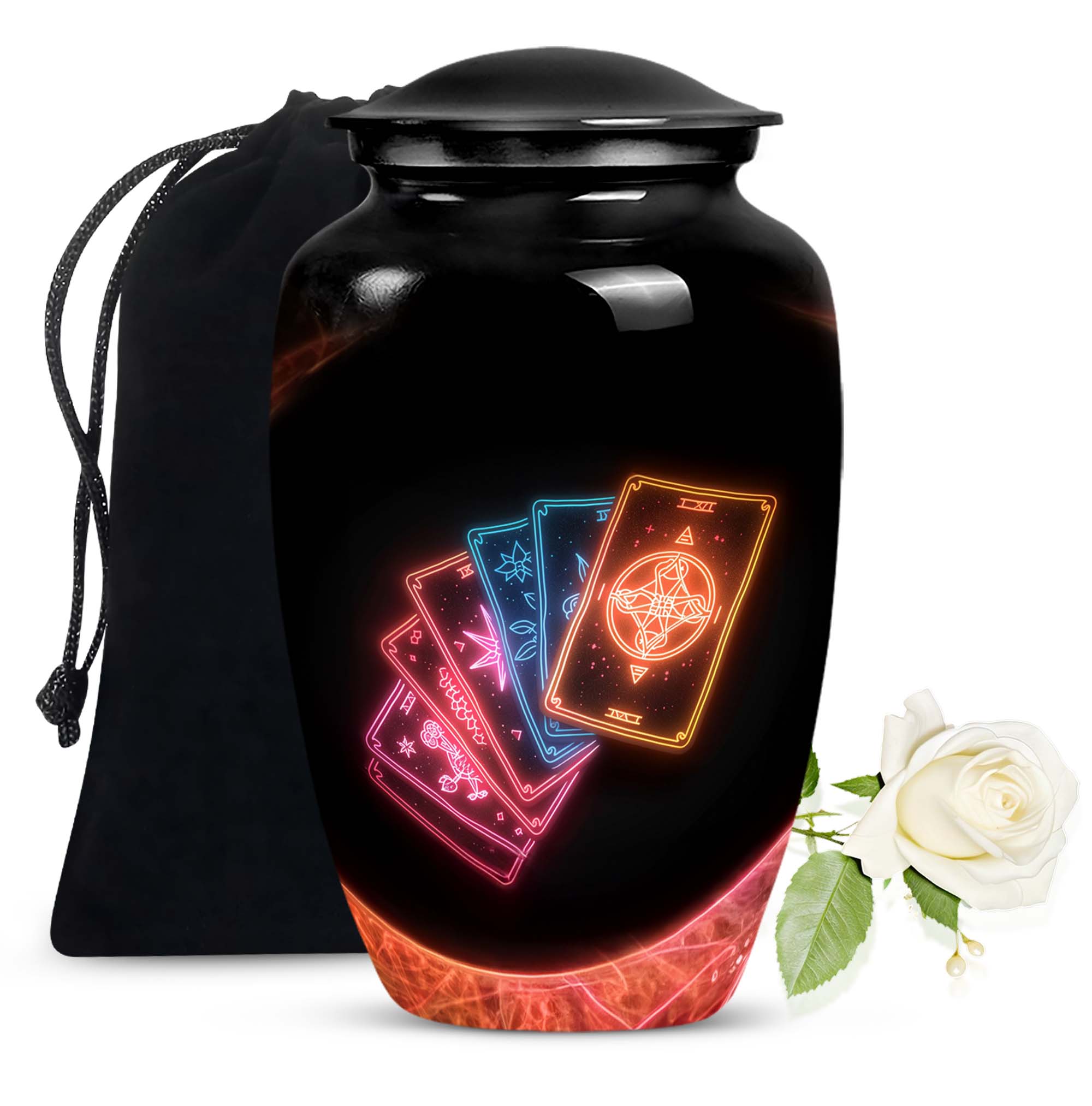 Discover the Tarot Urn, a magnificent symbol of remembrance. Crafted with care from high-grade aluminium, this cremation urn is specially designed to hold the memory of your loved ones close. Sitting at 10 inches in height and weighing 3.3 pounds, the aesthetic appeal of this large urn is unparalleled. Its theme, abstract yet classic, elegantly radiates grace and thoughtfulness. The thoughtful consideration is reflected in its spacious capacity of 200 cubic inches, large enough to cherish the remains of your dearly departed. An additional benefit is the customization feature that allows you to personalize the urn with engraved names creating a one-of-a-kind keepsake. Packaged with a velvet pouch, it aids in safe containment of ashes reinforcing the urn's purpose as a sacred memorial. This aluminium urn, a perfect synthesis of artistry and class, is more than a commodious receptacle. It is not just for women but also stands as a thoughtful unisex gift. So, remember your loved ones with grace by making this Tarot urn a part of your memorial ceremony traditions.