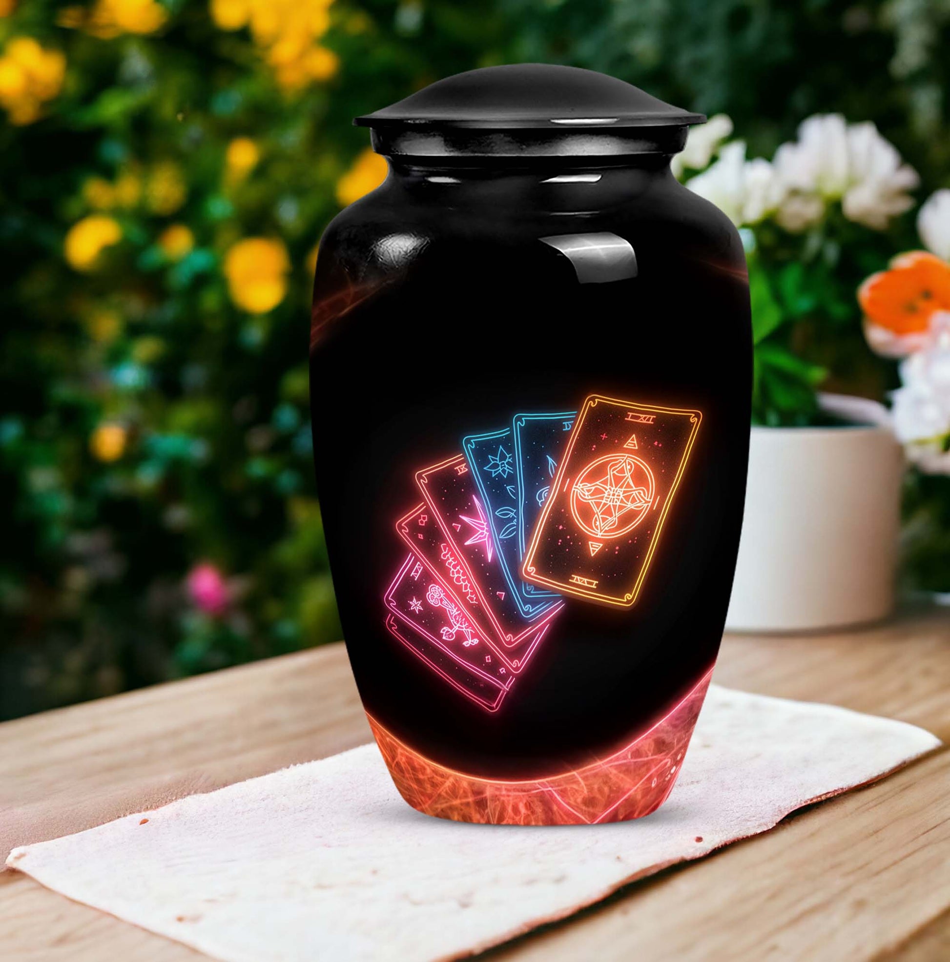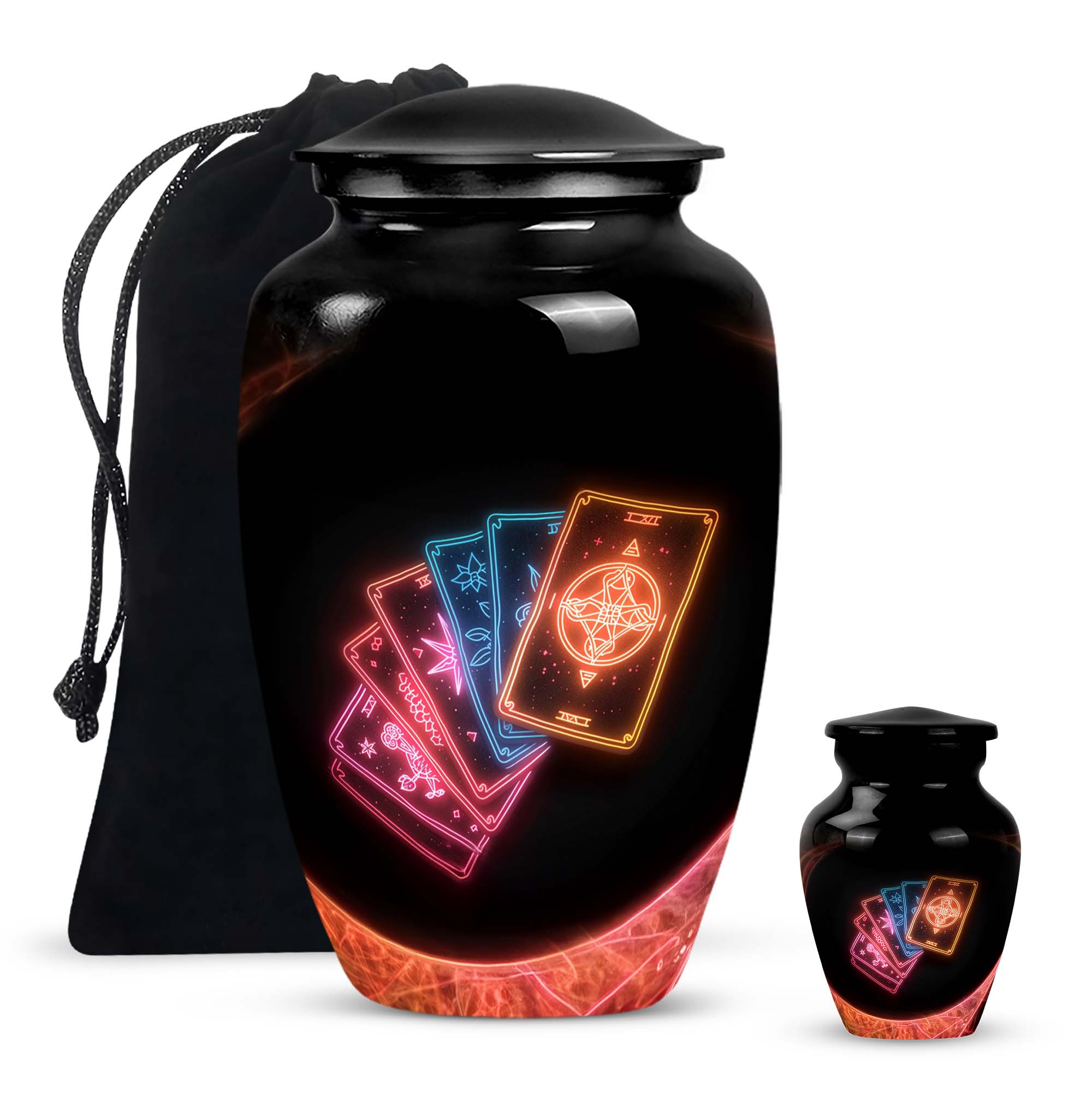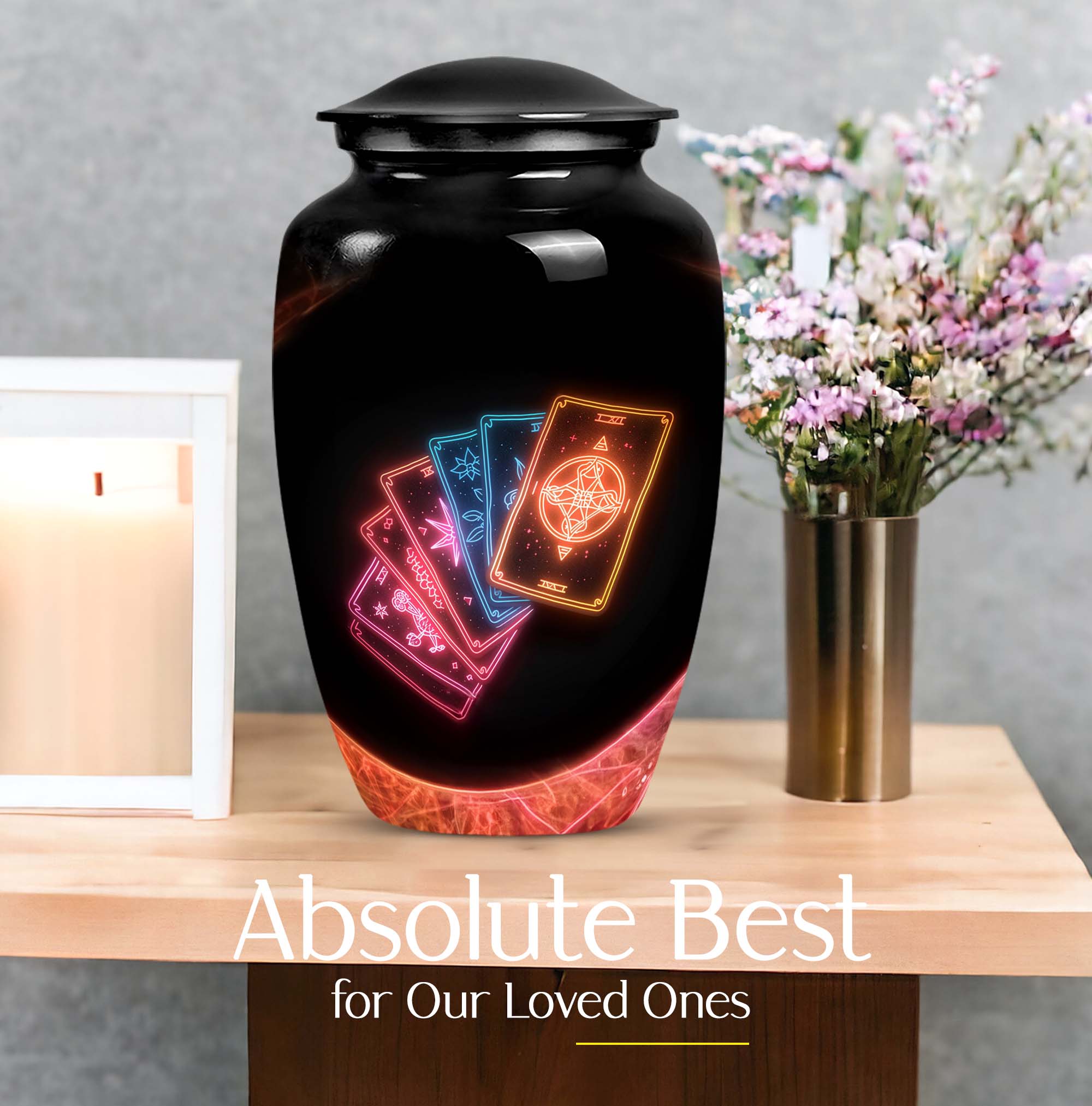 Discover the Tarot Urn, a magnificent symbol of remembrance. Crafted with care from high-grade aluminium, this cremation urn is specially designed to hold the memory of your loved ones close. Sitting at 10 inches in height and weighing 3.3 pounds, the aesthetic appeal of this large urn is unparalleled. Its theme, abstract yet classic, elegantly radiates grace and thoughtfulness. The thoughtful consideration is reflected in its spacious capacity of 200 cubic inches, large enough to cherish the remains of your dearly departed. An additional benefit is the customization feature that allows you to personalize the urn with engraved names creating a one-of-a-kind keepsake. Packaged with a velvet pouch, it aids in safe containment of ashes reinforcing the urn's purpose as a sacred memorial. This aluminium urn, a perfect synthesis of artistry and class, is more than a commodious receptacle. It is not just for women but also stands as a thoughtful unisex gift. So, remember your loved ones with grace by making this Tarot urn a part of your memorial ceremony traditions.