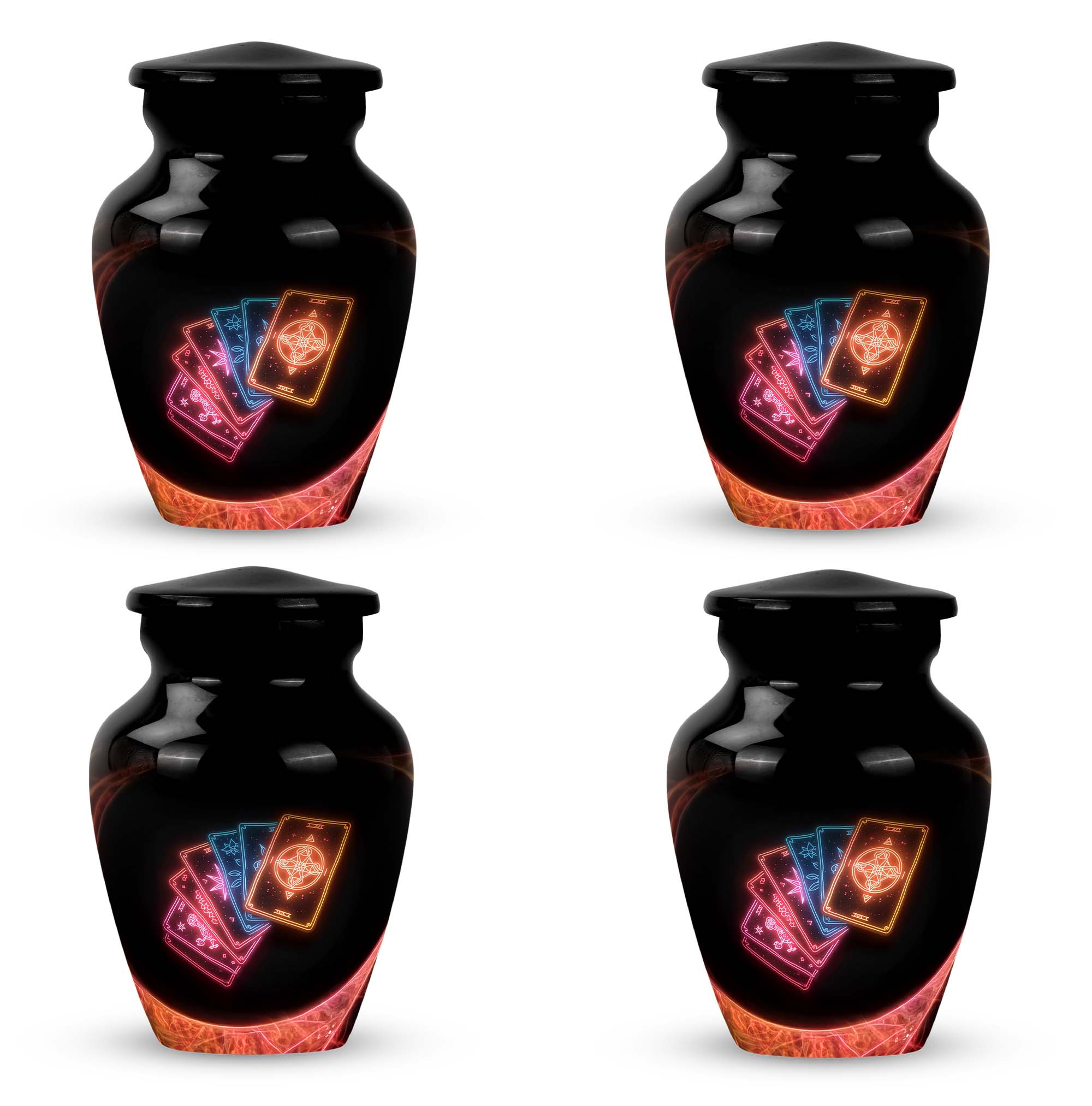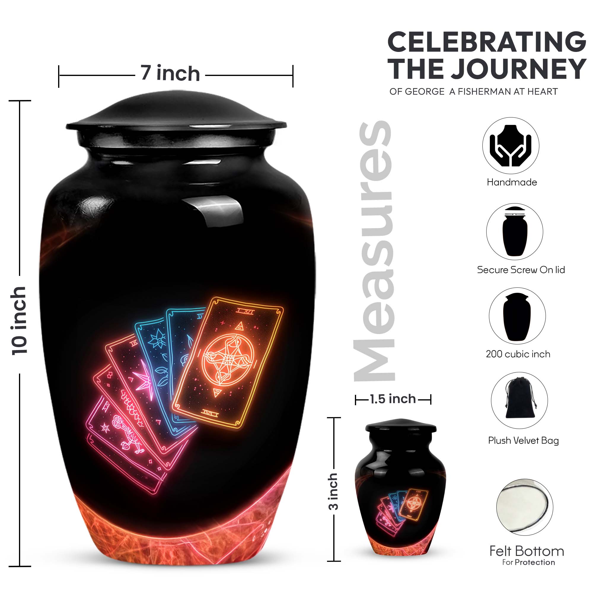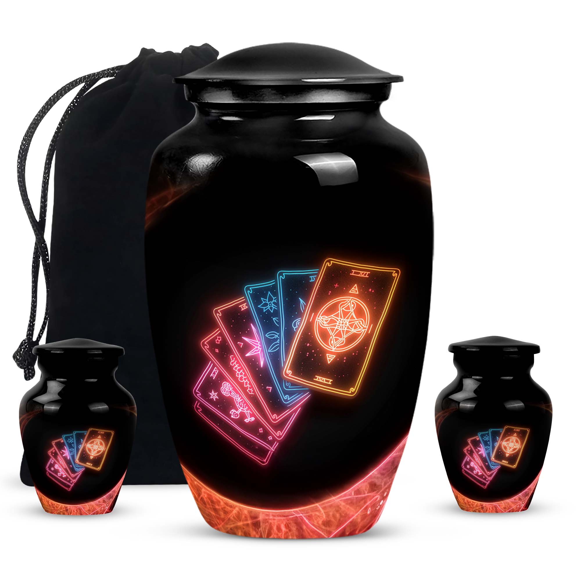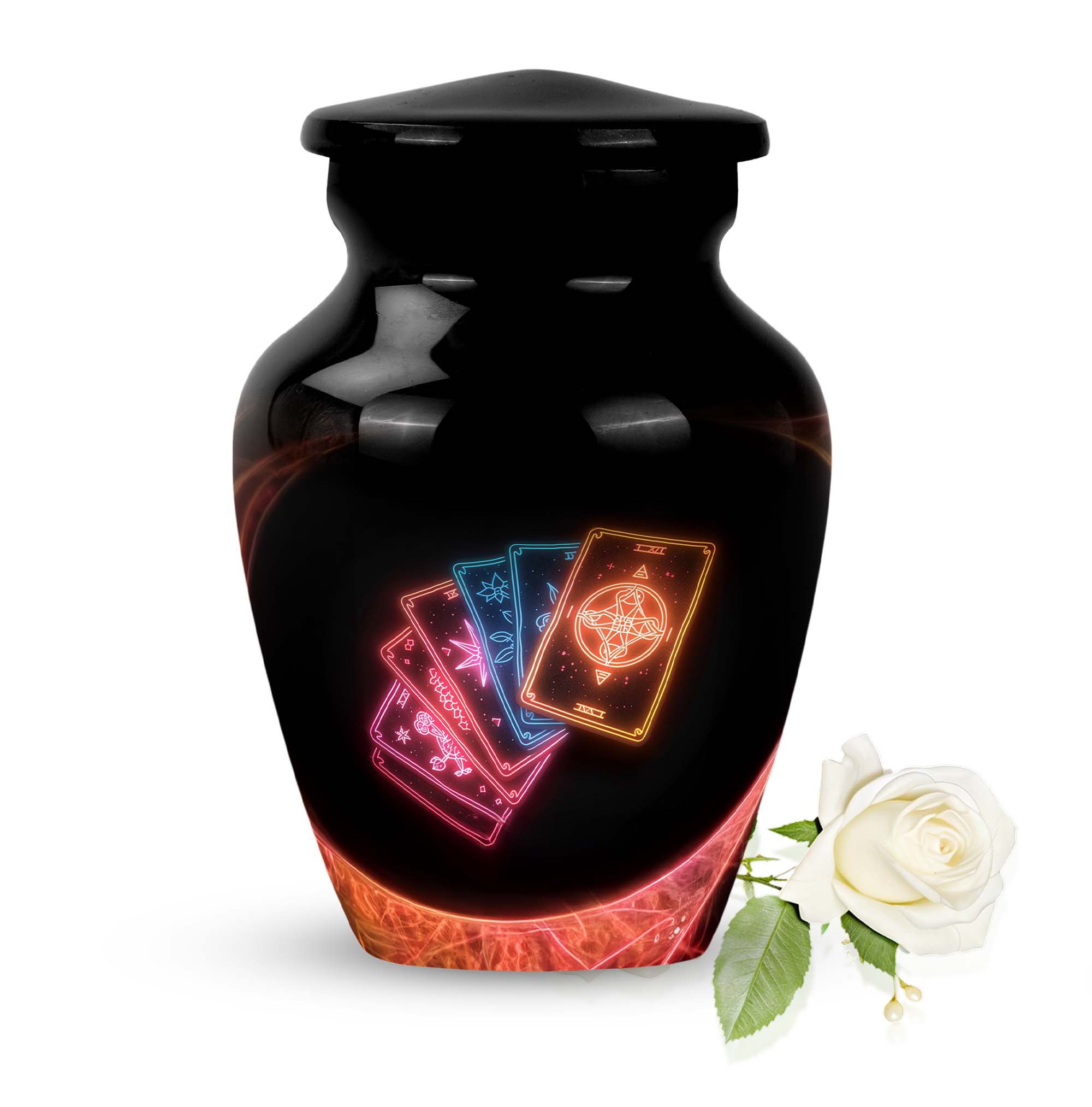 Discover the Tarot Urn, a magnificent symbol of remembrance. Crafted with care from high-grade aluminium, this cremation urn is specially designed to hold the memory of your loved ones close. Sitting at 10 inches in height and weighing 3.3 pounds, the aesthetic appeal of this large urn is unparalleled. Its theme, abstract yet classic, elegantly radiates grace and thoughtfulness. The thoughtful consideration is reflected in its spacious capacity of 200 cubic inches, large enough to cherish the remains of your dearly departed. An additional benefit is the customization feature that allows you to personalize the urn with engraved names creating a one-of-a-kind keepsake. Packaged with a velvet pouch, it aids in safe containment of ashes reinforcing the urn's purpose as a sacred memorial. This aluminium urn, a perfect synthesis of artistry and class, is more than a commodious receptacle. It is not just for women but also stands as a thoughtful unisex gift. So, remember your loved ones with grace by making this Tarot urn a part of your memorial ceremony traditions.